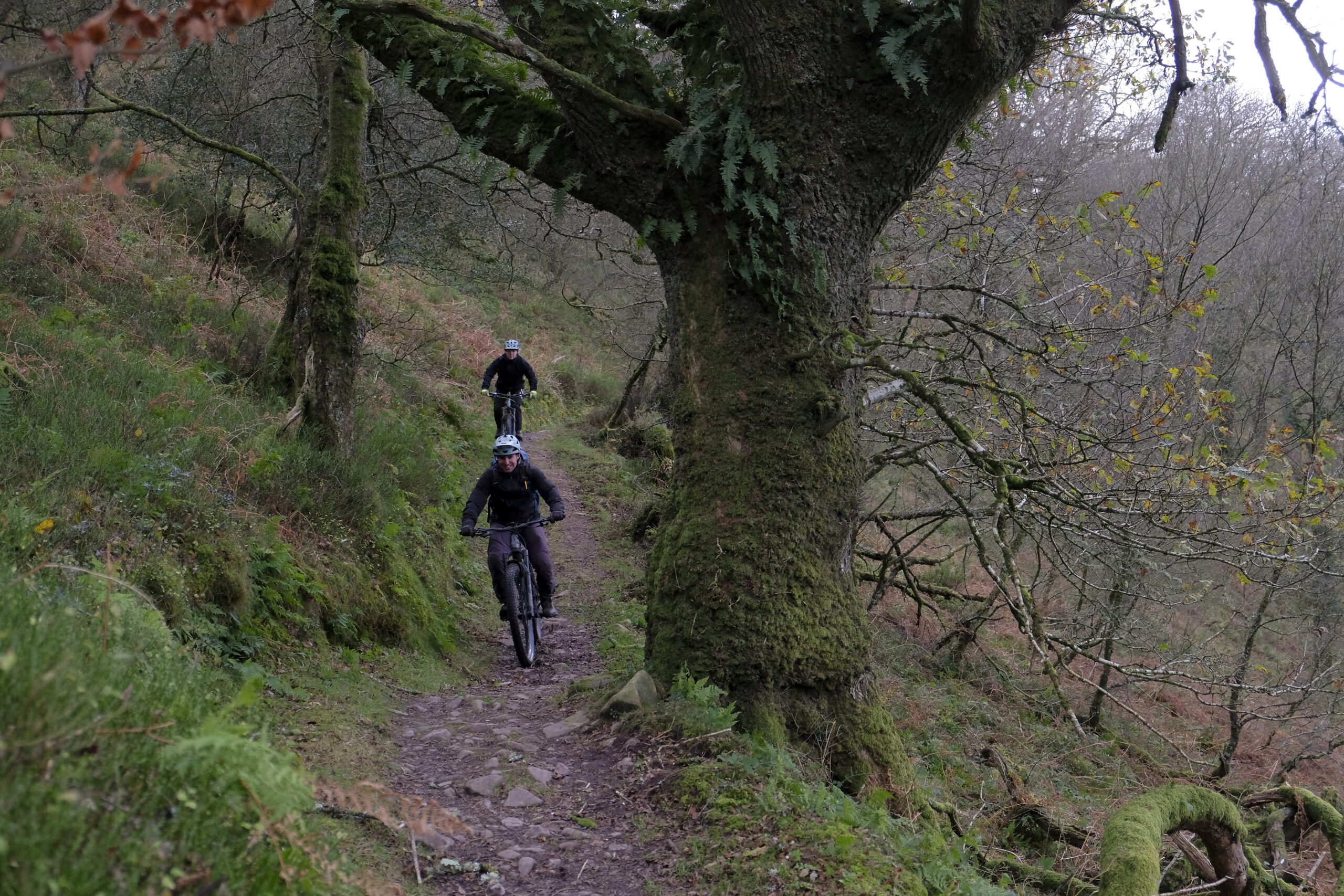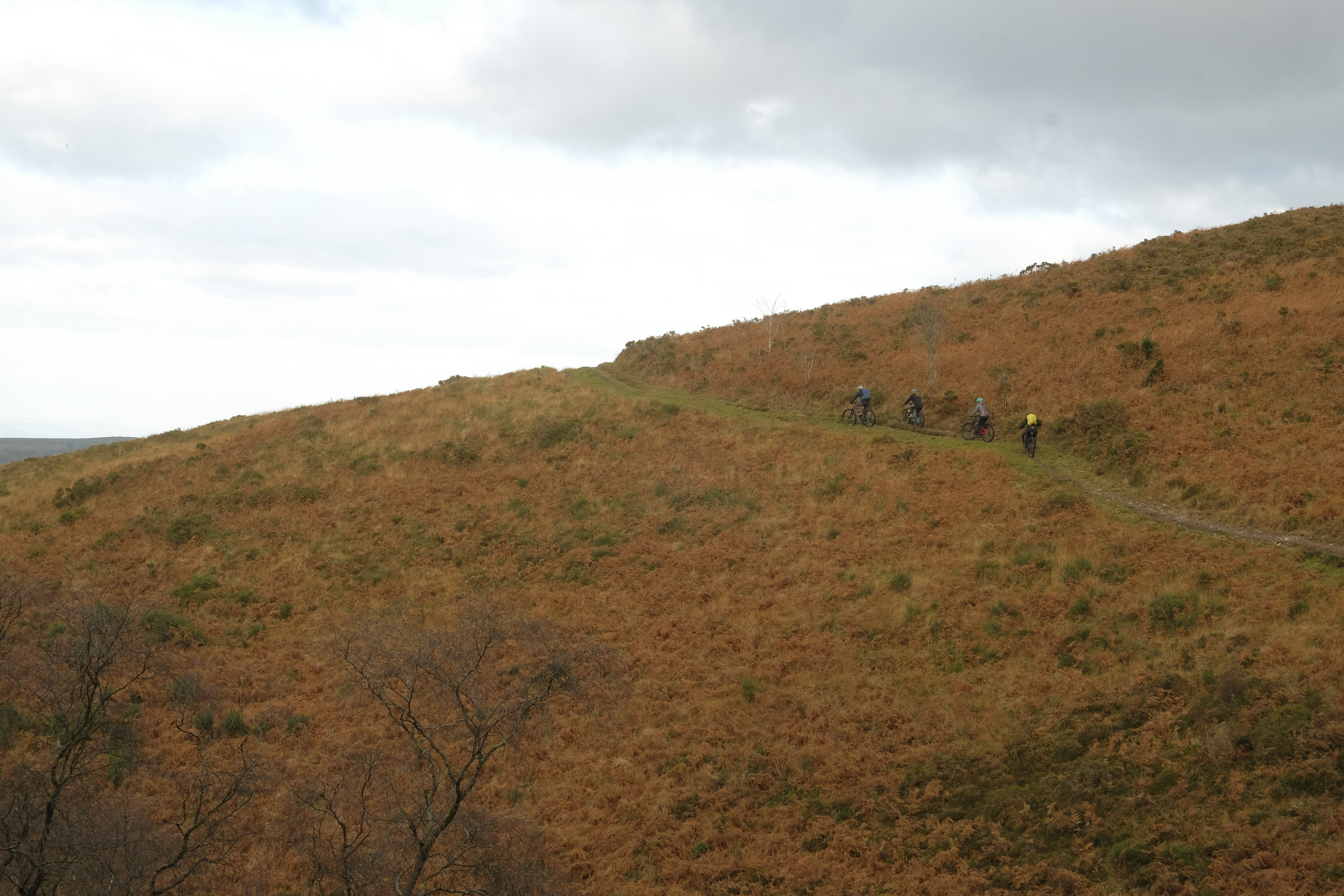 Back in the woods, I find my group of amalgamated Green and Blue riders and follow them down a beautifully twisty bit of singletrack, with the looming Exmoor hills very visible in the grey winter light. Some of the smaller riders look impossibly tiny and precarious on their five-speed hardtails, though everyone gets round the rocky corners and down the rooty steps just fine. Most of the bikes I see are in great shape and there seems to be an active stream of hand-me-downing going on through the strata of the age groups.