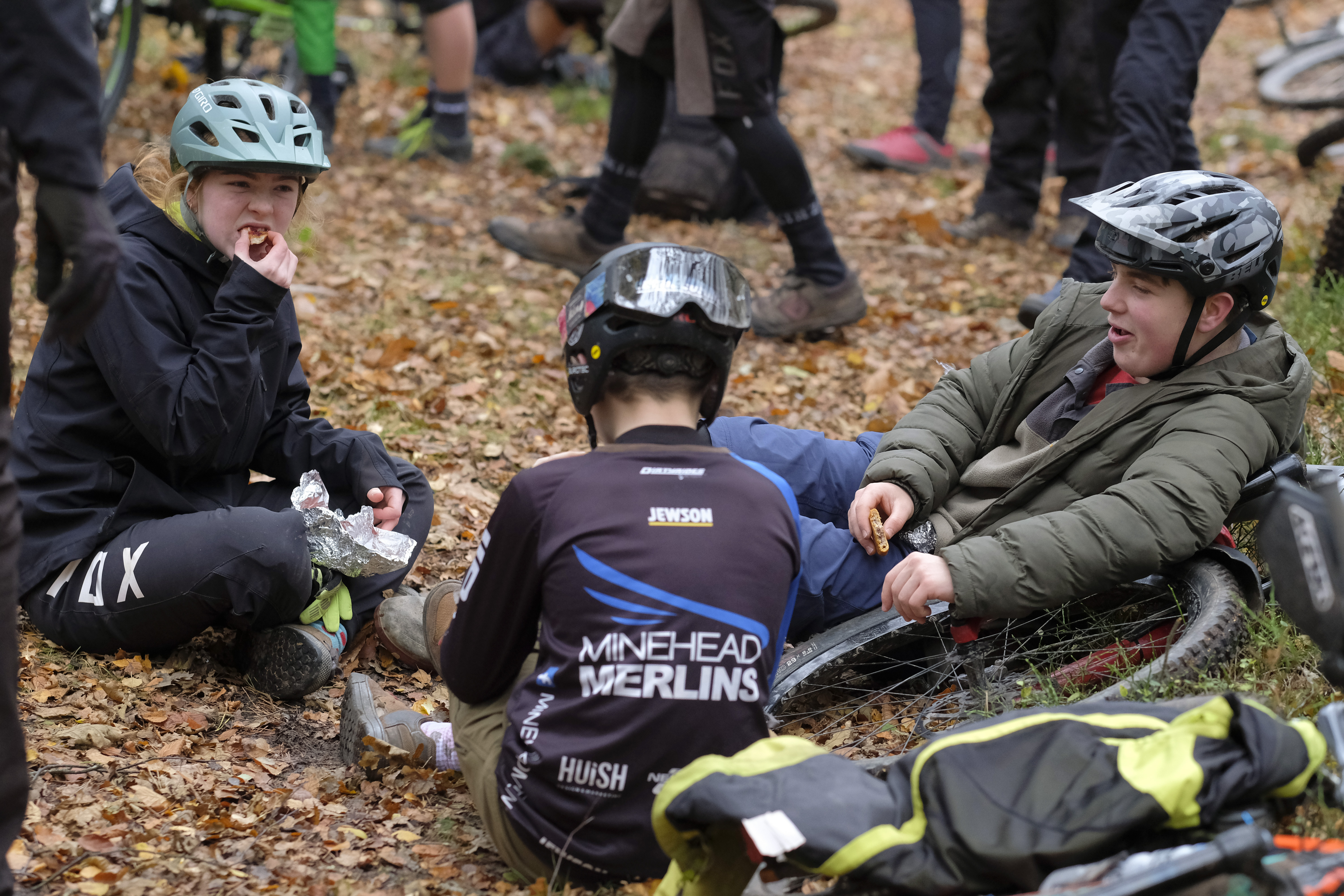 One important lesson every mountain biker learns (usually the hard way) is that you need to keep fuelling the fire to keep the legs turning, but fortunately a lunch stop was built in to the day’s ride. As we sheltered in a small combe, riders unpacked packages of lunch and the chat resumed again. It seems the Merlins are being well brought up in the ways of the mountain bike snack stop and chat. You’d think that I’d know better, but I only had sports chews to keep me going.
