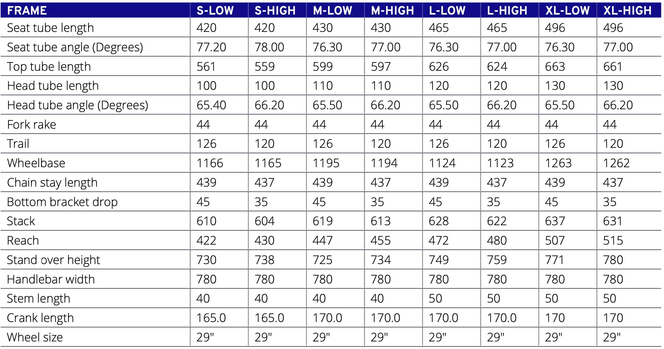 There are two settings, high or low. The high position puts an emphasis on efficiency and is ideal for riding slower, tighter singletrack. A head angle of 66.2 degrees and a bottom bracket drop of 35mm produce quick handling with more pedal clearance to help avoid pedal strikes. And a steeper 77-degree seat tube angle puts the rider in a power position for pedaling up climbs with maximum efficiency.