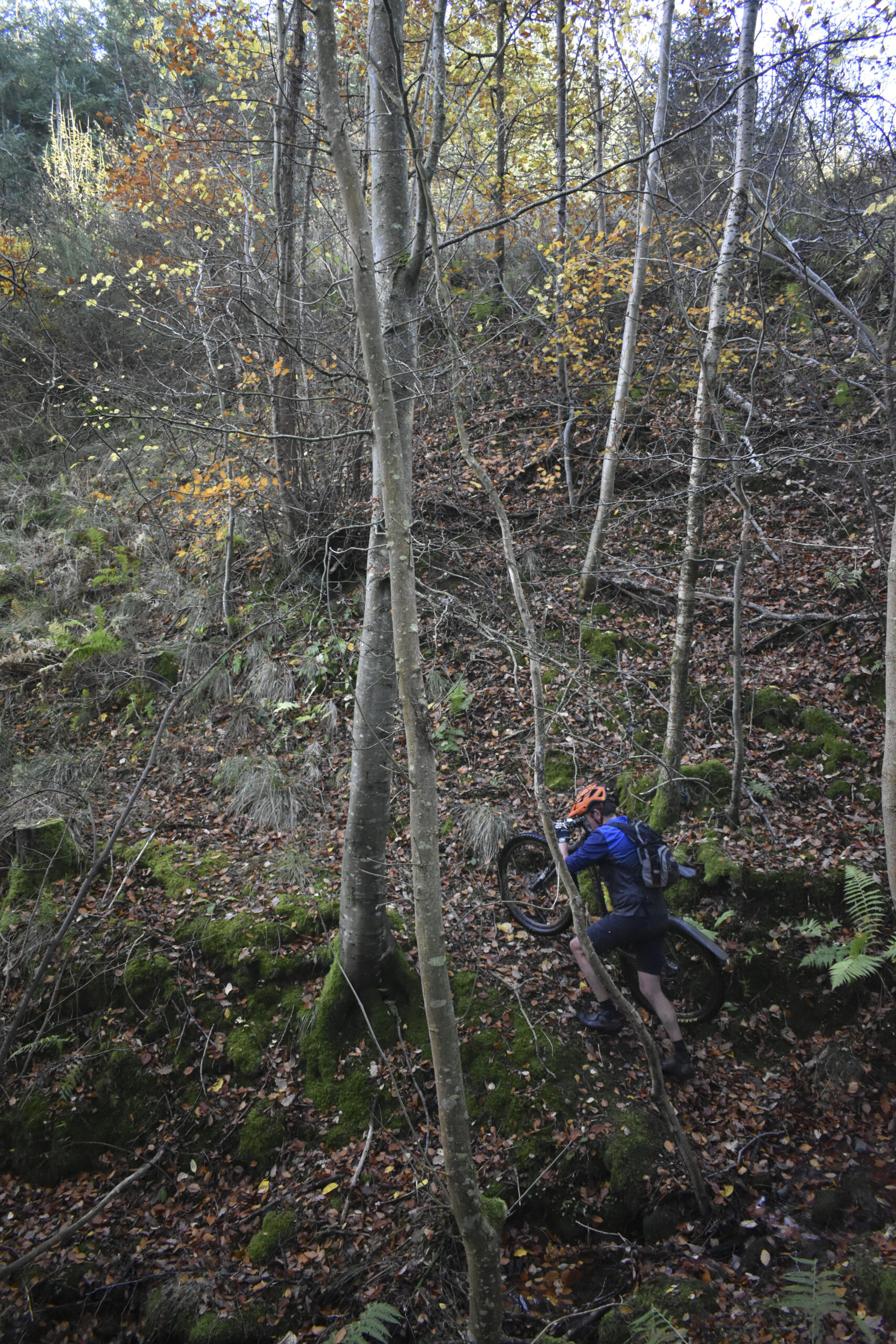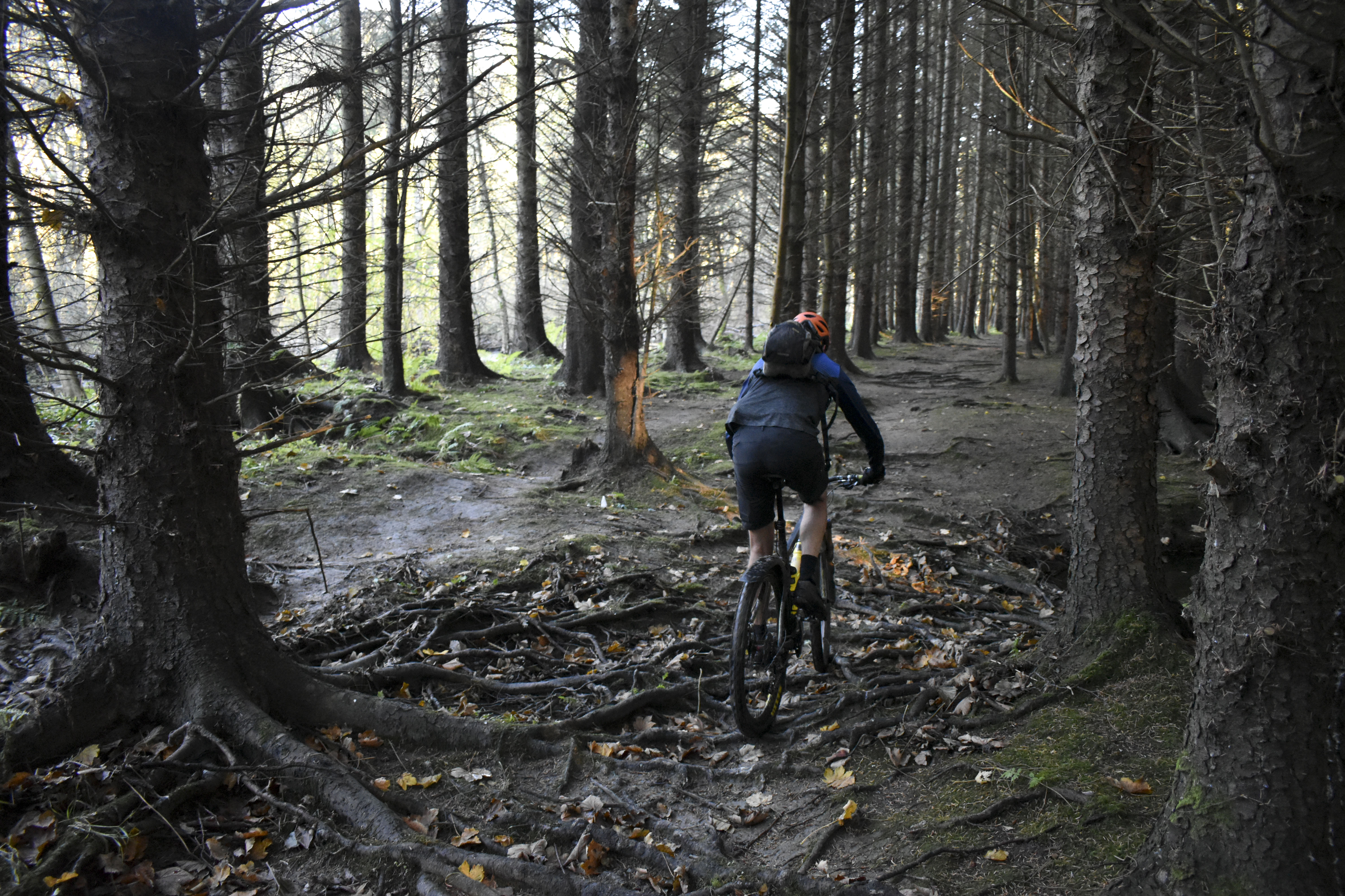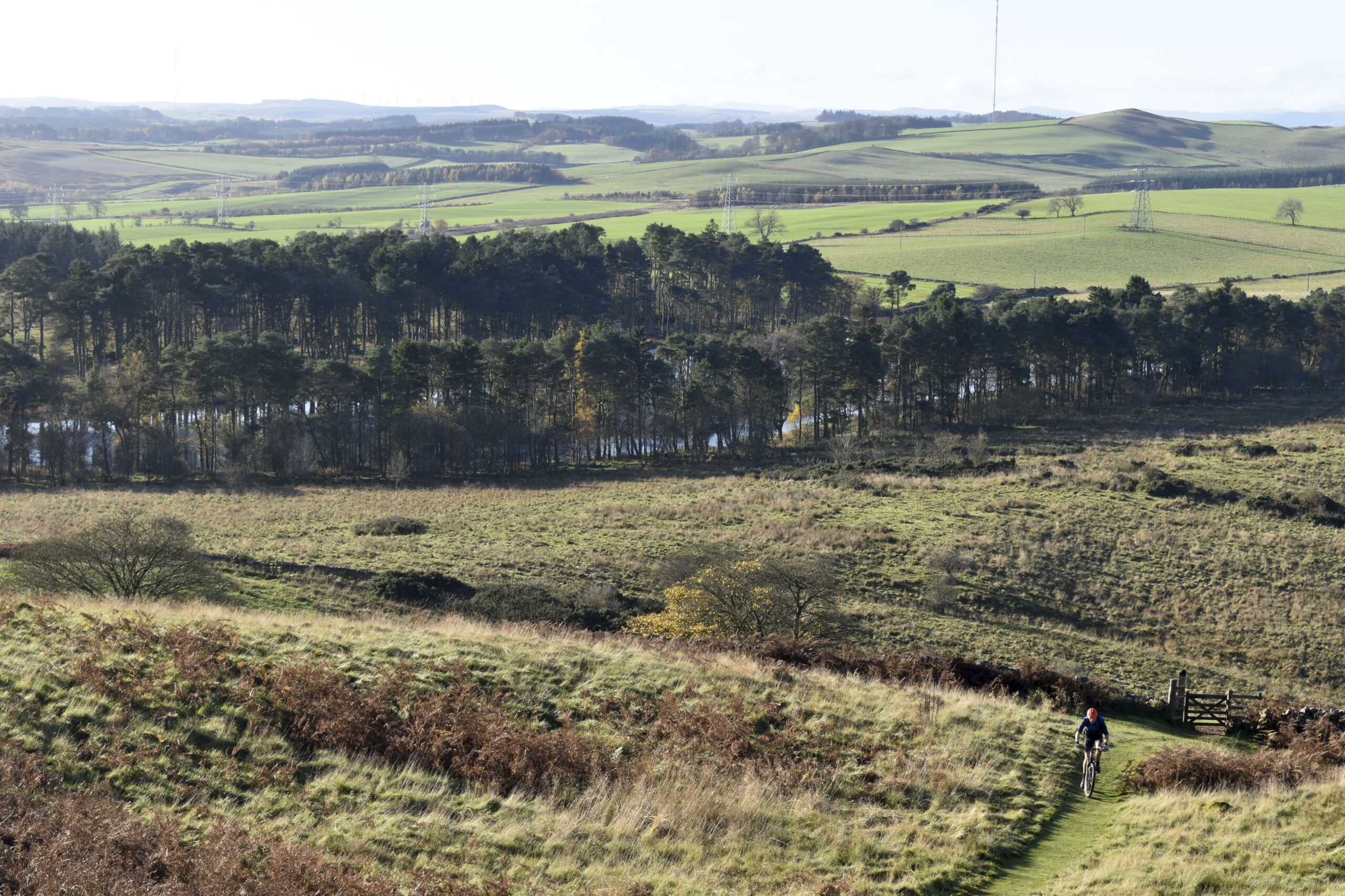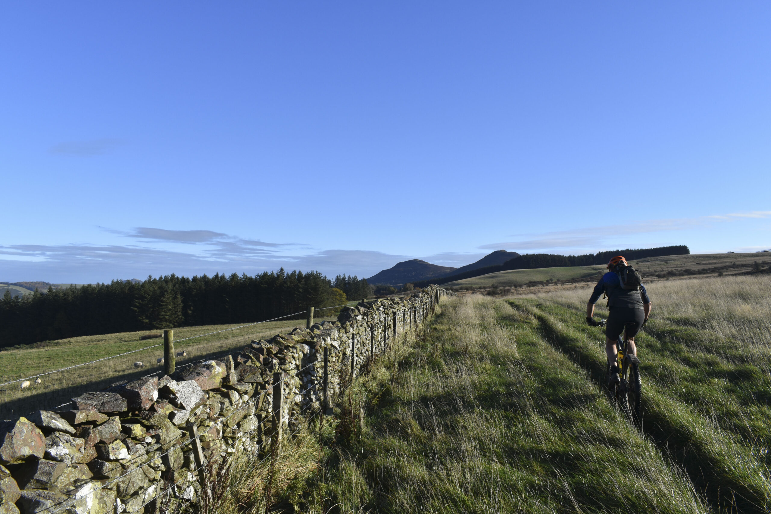 Steeped in folklore or to give it the technical term, mumbo-jumbo fairy bollox, the Eildons dominate the surrounding area despite their relatively diminutive stature. Criss-crossed by a network of well-trodden paths, they have seen much action over the years, including as a bronze age hill fort and a Roman lookout tower. Before that, we had a fast, sweeping descent down an almost unrecognisable Rhymers Glen. Previous visits delivered a Speeder bike-esque blast down a dank and oppressive forest trail. Now felled, it felt like an entirely new trail. Crossing still familiar fields, we climbed up through mature woodland on what could be described as ‘essence of trail’. Tree fall and a lack of use were seeing it slowly turn back to nature, but it was still just about clear enough for us to make our way through to the road beyond.