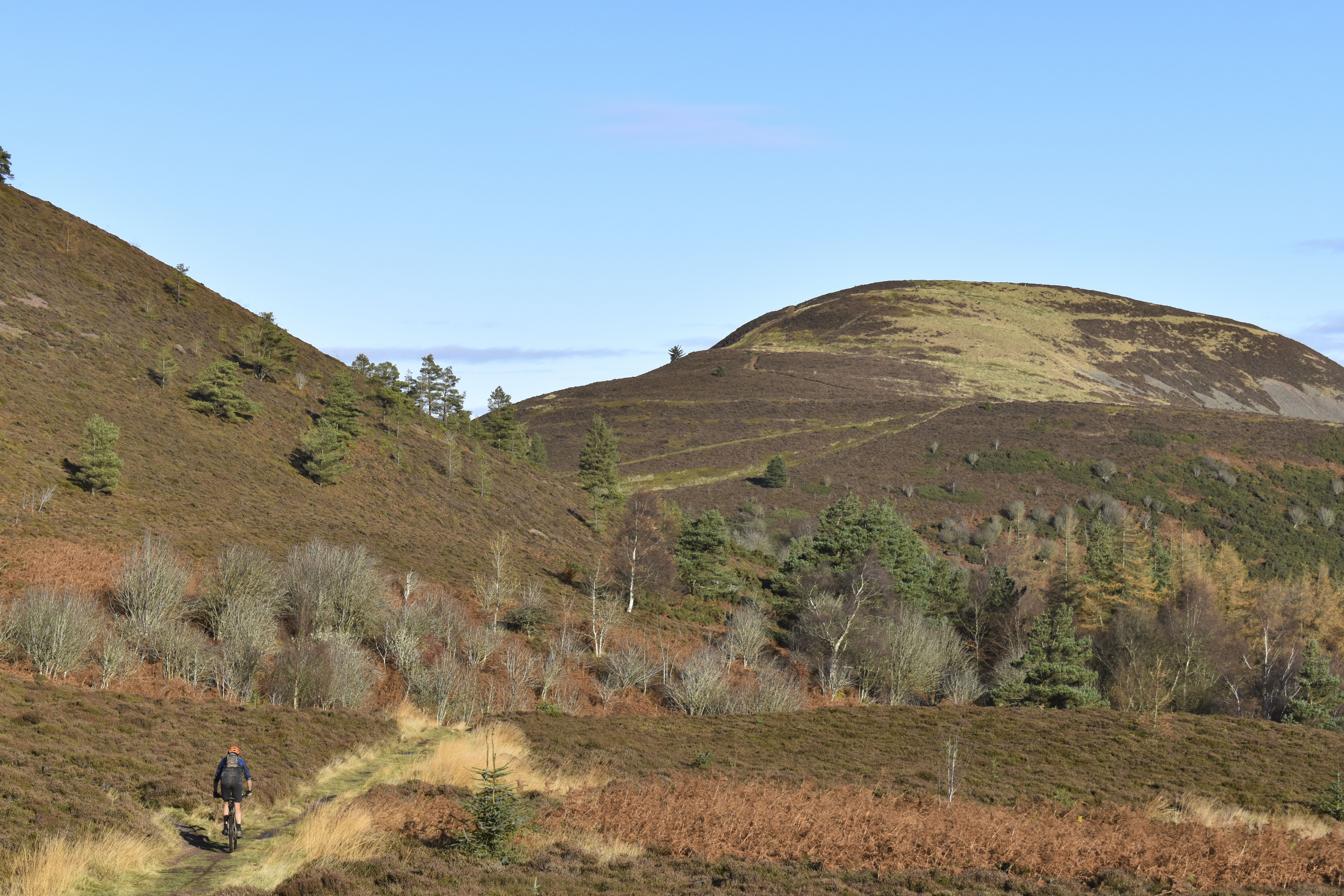 Leaving the water behind, we darted off up a minor road that would lead us steeply upwards to the picturesque shoreline trails beside Cauldshiels Loch. Or “Bloody freezin’ cauld-shiels loch!” as the two open water swimmers we met turning a gentle shade of blue from their morning constitutional dip called it. Who knew that lochs in November could be baltic, eh…? The thermometer was hovering around six degrees yet for Dave and me, it was T-shirt and shorts weather as the steep hill lookout was doing a sterling job of setting our core temperatures to golden toasty. Bidding farewell to our two new human popsicle friends, we found ourselves riding through a grassy field on waymarked tracks. Cresting a small rise, our first objective of the day loomed large on the horizon: the Eildon Hills.