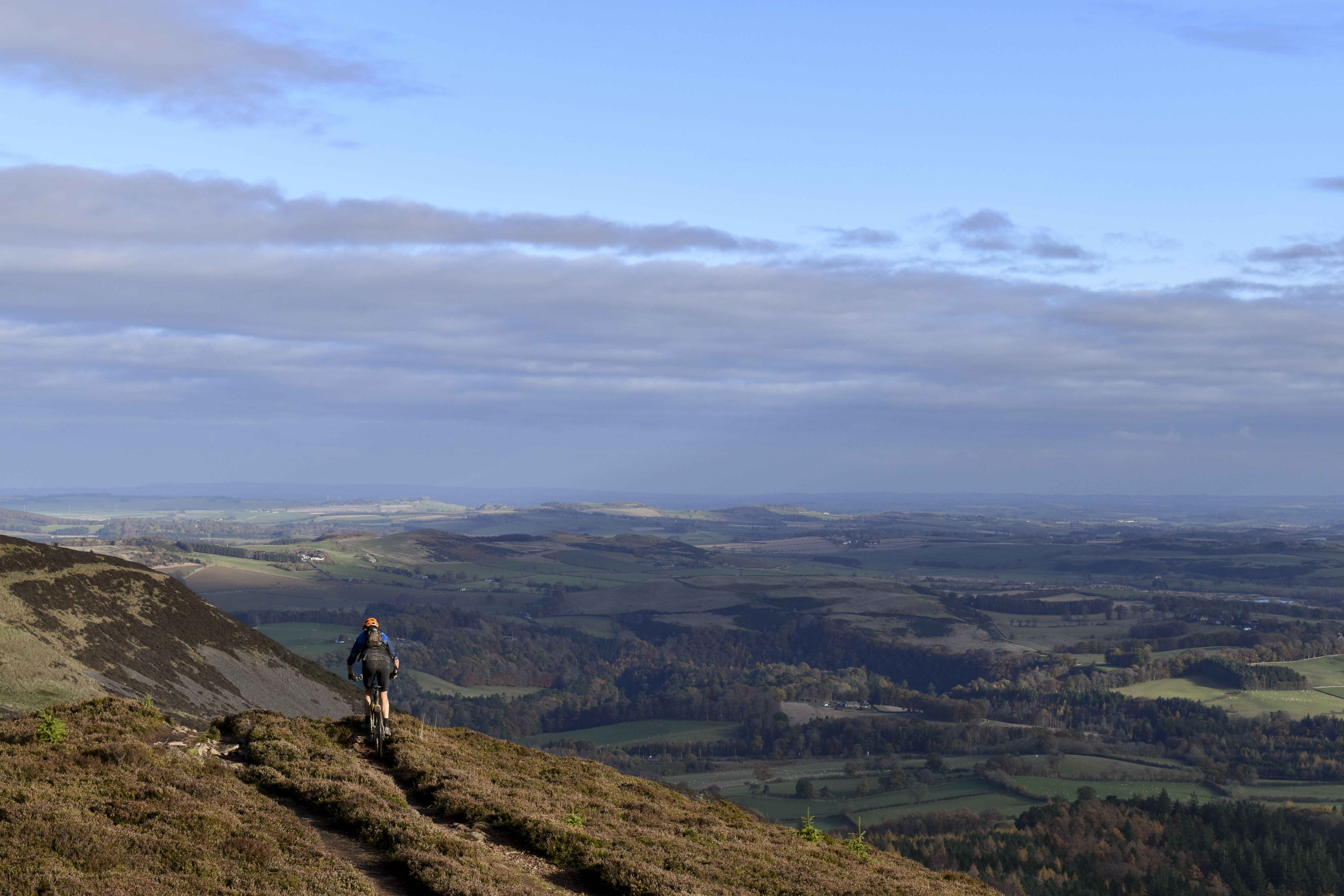 Ring remedied, we bid farewell and headed up the long and at times steep climb through the forest that would take us to the summit of the Three Brethren high above us and out of sight. Being on singletrack and footpath as opposed to fire road, the climb has much to commend it. You feel like you are making good progress even if you aren’t racing up it. Breaking through the treeline, we stopped to blether with yet another friendly local and his collie Meg, who like several others we had met during the day, had been impressed by our route choice (the walker, not the dog). Distance-wise, we would only cover about 42 kilometres and some 1,000 meters of climbing but when asked, it always met with nods of a mixture of approval and slight disbelief. Compared to the ‘Get orf my laaaaand!’ attitude of some of our southern neighbours, the locals here are genuinely warm and welcoming. I guess if you call the area home it’s hard not to be, such are its charms.