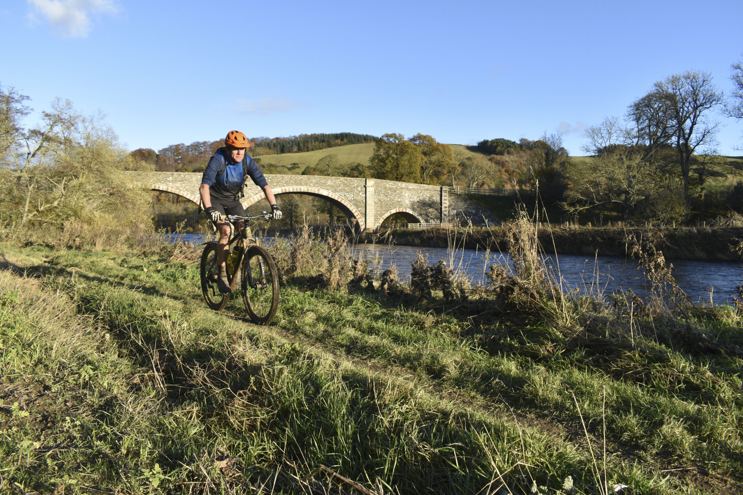 Leaving our car in a free public car park, we headed through the bustling market town. The death of the high street has long been proclaimed but in the case of Selkirk, the trend has been well and truly bucked. The shops were teeming with life – clearly, the ‘shop local’ necessity of the pandemic has caused the population to do just that. In the spirit of this, Dave and I stopped at Cameron’s Bakery for an almost obligatory pre-ride bacon roll. And a tuna and cheese roll. And another bacon roll. Oh and an apple turnover with chocolate muffin chaser. What is it they say about not buying food when you are hungry? Fighting back the inevitable meat sweats, we dropped down to the River Tweed at the foot of town and found ourselves immediately treated to a serving of finest riverbank singletrack.