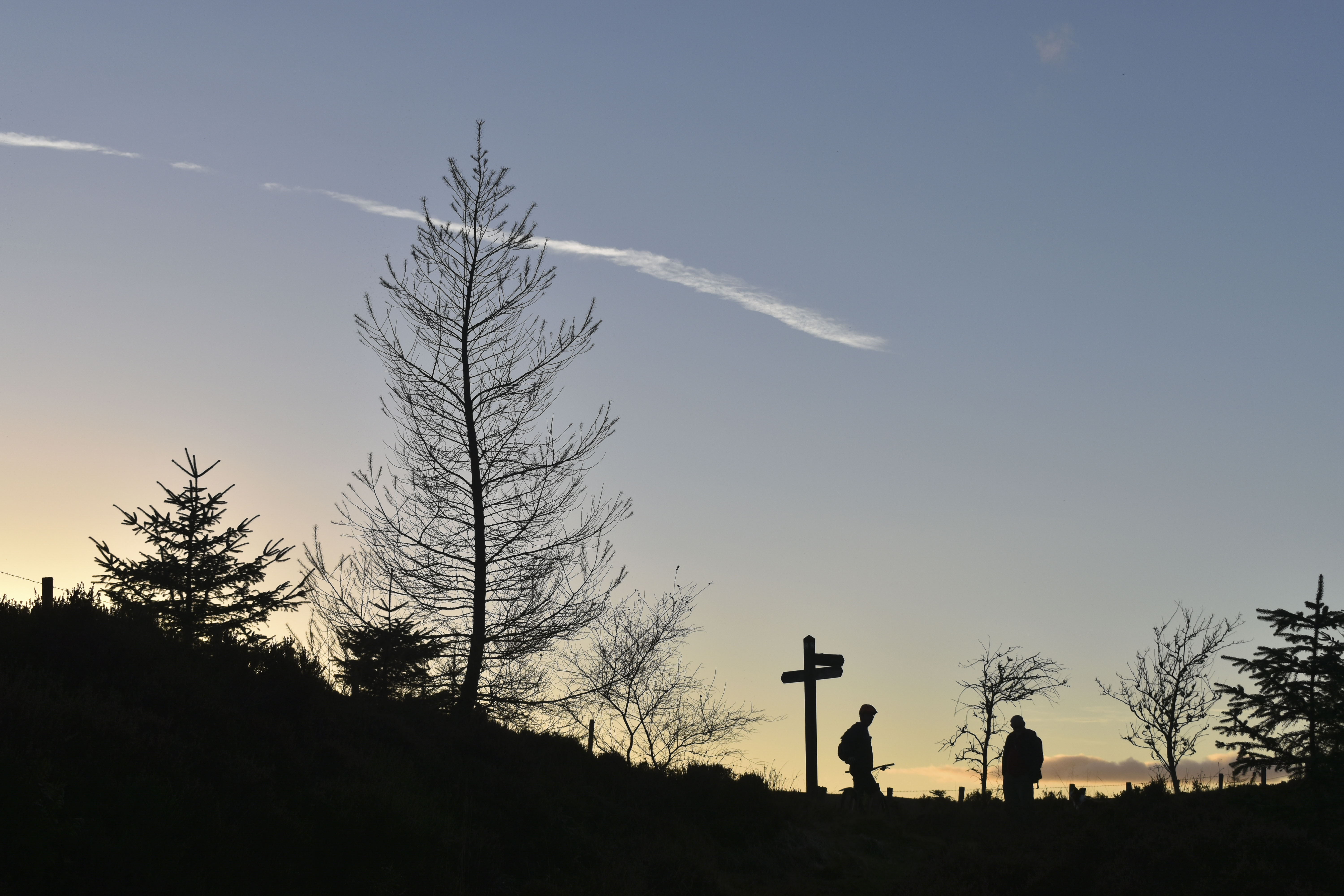 A short final effort for the summit rewarded us with the view of the day. With the sun dipping below the horizon to the west and the moon rising, we were there at the perfect golden hour moment. In the distance, we could see the Eildon Hills which, despite their proximity according to our map, seemed many more miles away than we knew them to be. We had pressed on for most of the day with little in the way of breaks as we were always conscious that our daylight was limited. Our reward was these few minutes of panoramic perfection. For me, sunrise and sunset are the best times of the day. The promise of adventure and the satisfaction of a day well and truly embraced are hard to beat.