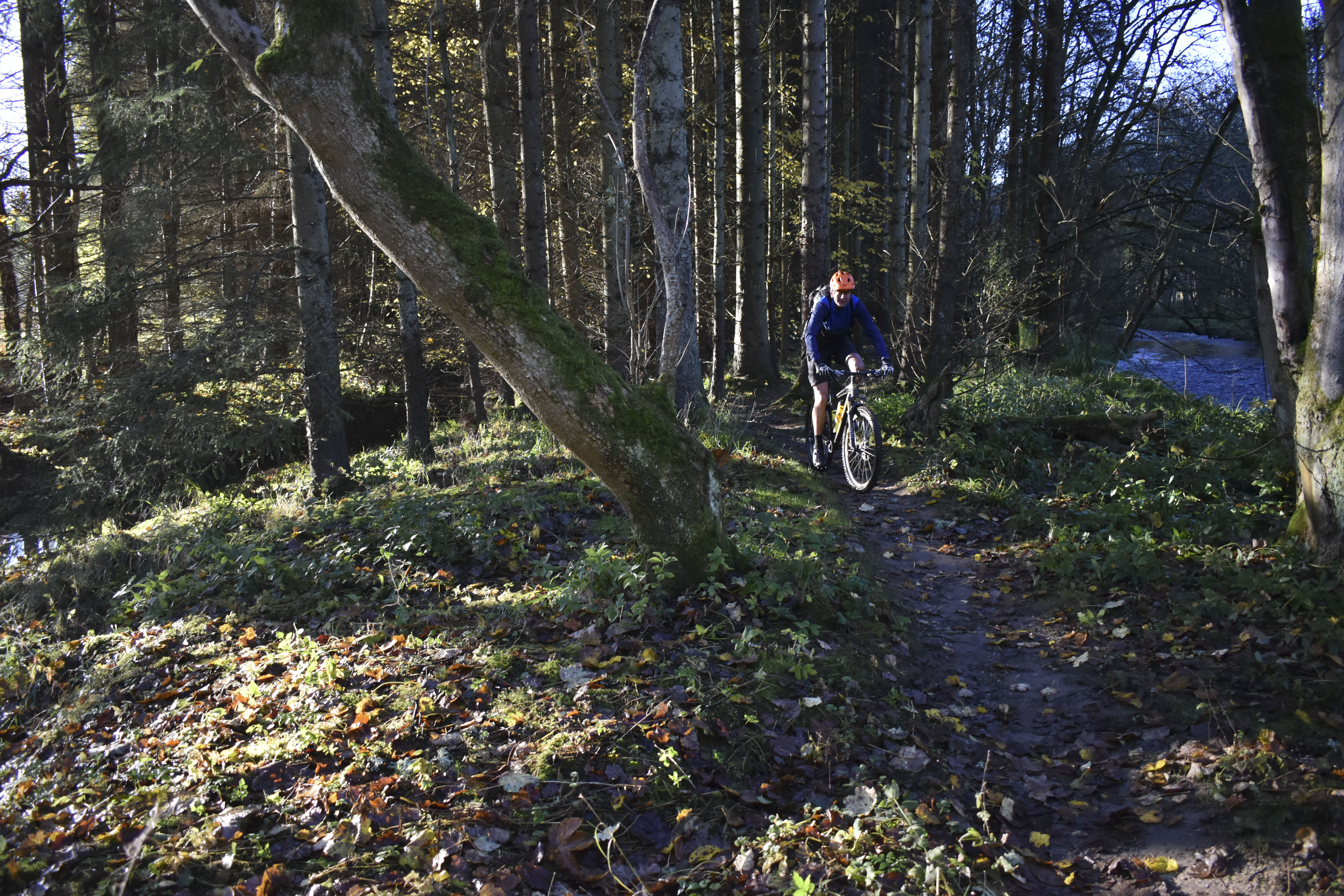 Weaving through the tree-lined trails, the low sun painting a beguiling picture of light and shade on a green and russet canvas, we both knew we were onto a winner. At the height of summer, these trails can be a case study in nettle/bare leg interfaces but jump forward to autumn and the only dangers lurking are the hidden roots and polished rocks from where the river has inevitably burst its banks. Feeling my front end slide on a concealed root that was slippier than Boris at PMQs, I shouted back a warning to Dave that coincided perfectly with him hitting it square on. Turning round to see Dave and his bike in a tangled heap in a hollow off the trail, I helpfully stated the bleedin’ obvious. “You found it then?” No harm done save for a skew-whiff bell, we pressed on. Despite recent rains, the trails were remarkably dry with the sandy soil making for a reasonably weatherproof surface. Crossing through a small stream and over a North Shore-style plank, I was heartened to discover that the trails had weathered many winter storms and were easily as good as I remembered them.
