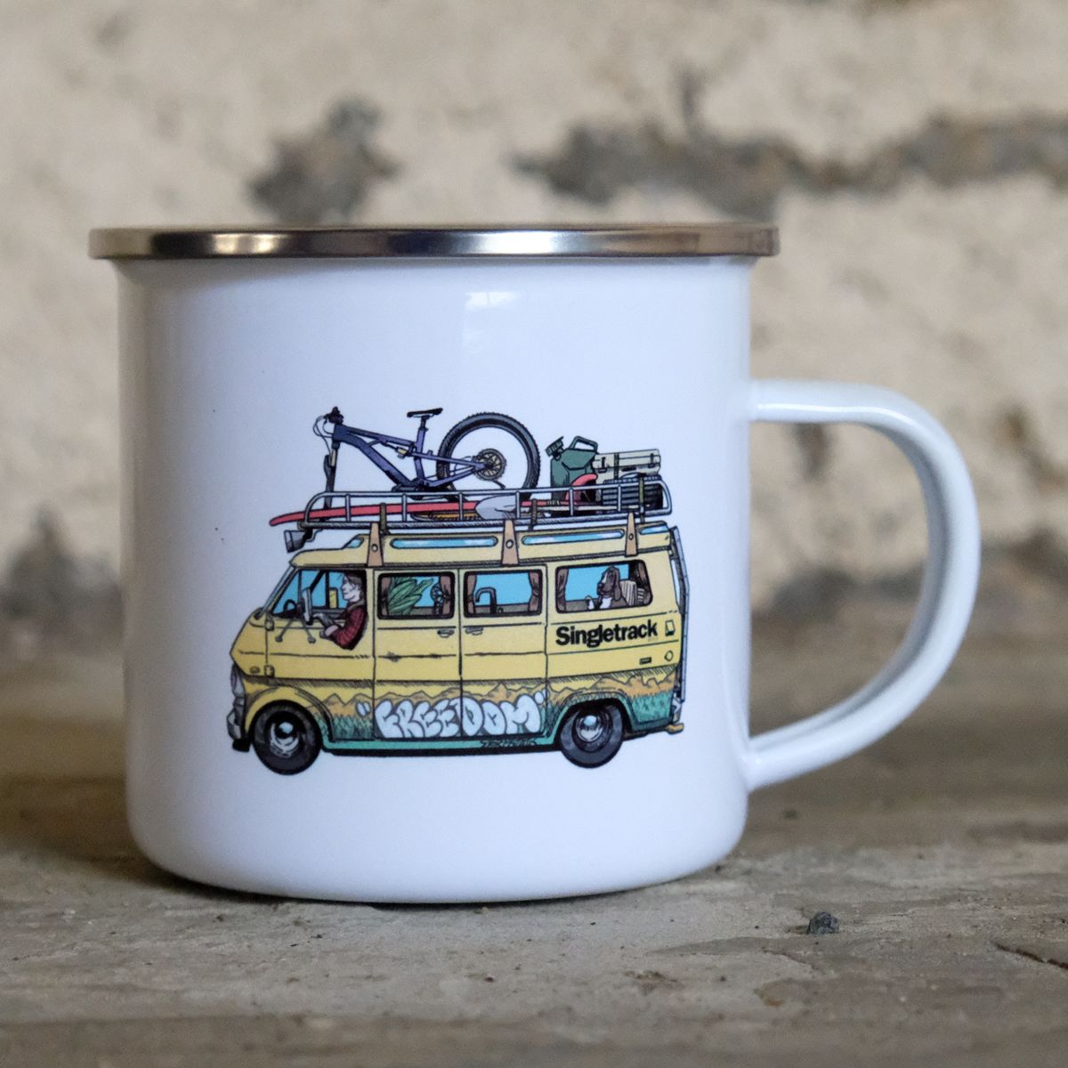 Our enamel mug has the turbo groovy Singletrack Freedom Bus on to it, to remind you to get on it and get outta here.
