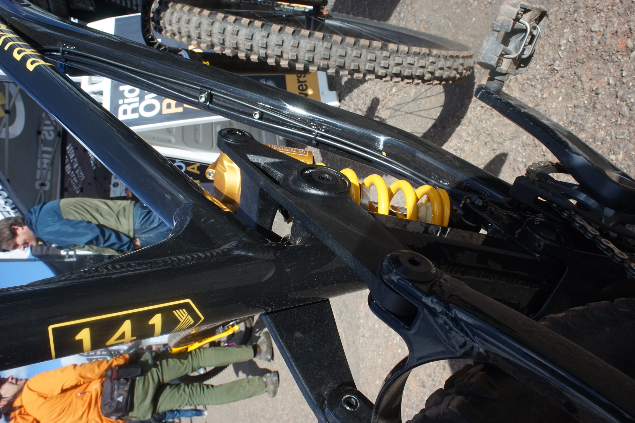 Pride of place on that stand is this – a 141 build with 150mm Öhlins RXF36 m.2 upfront and the Öhlins TTX2M coil in the rear. A vision of aggression in black and gold.