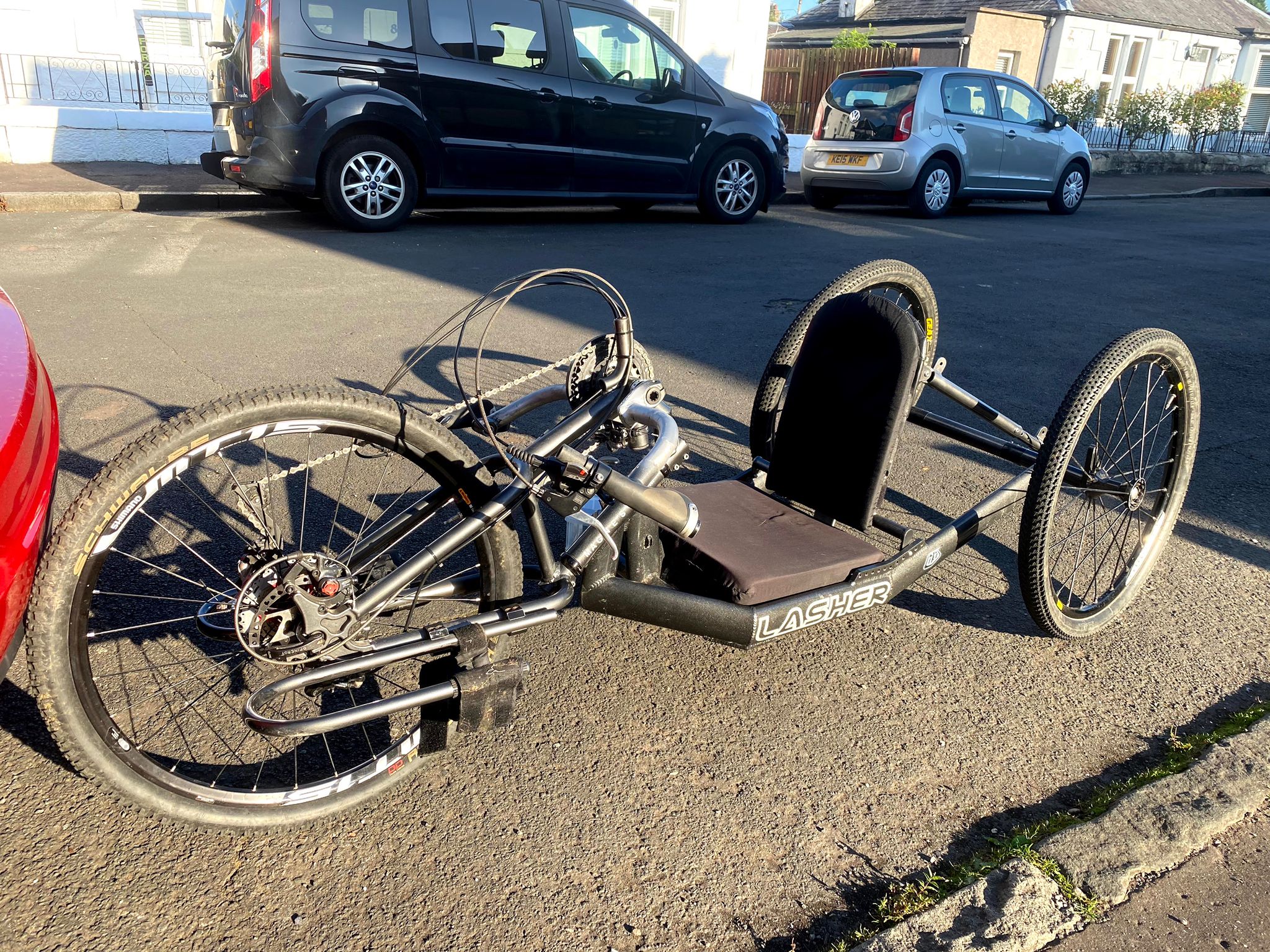 We rerouted our group to meet up with the others and when we arrived we found Neil sat in his handcycle with the seat plate touching the floor, grinning like a Cheshire Cat! “I was kind of expecting it sometime” he said “It’s not really designed for an electric motor and I’ve got a new full suspension one on the way anyway!”