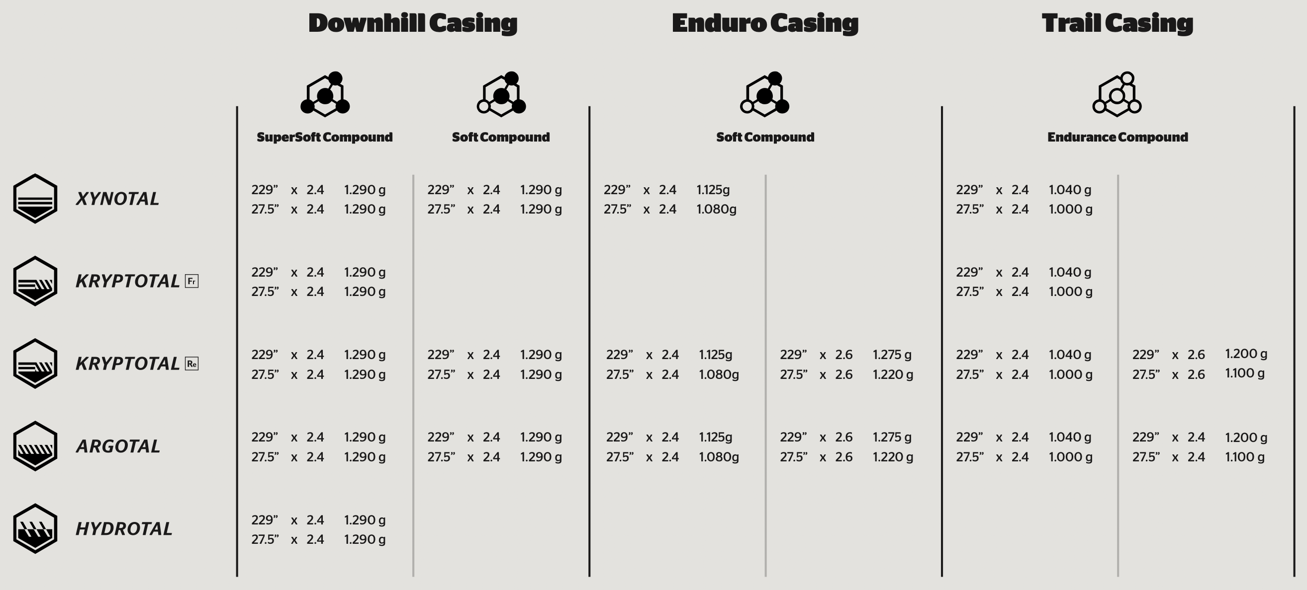 All five of these tyres are for riders who prioritise descending performance, no matter how much travel their bike has, but the compound and carcass options are intended to cater for as wide as range as possible within this not-XC spectrum.
