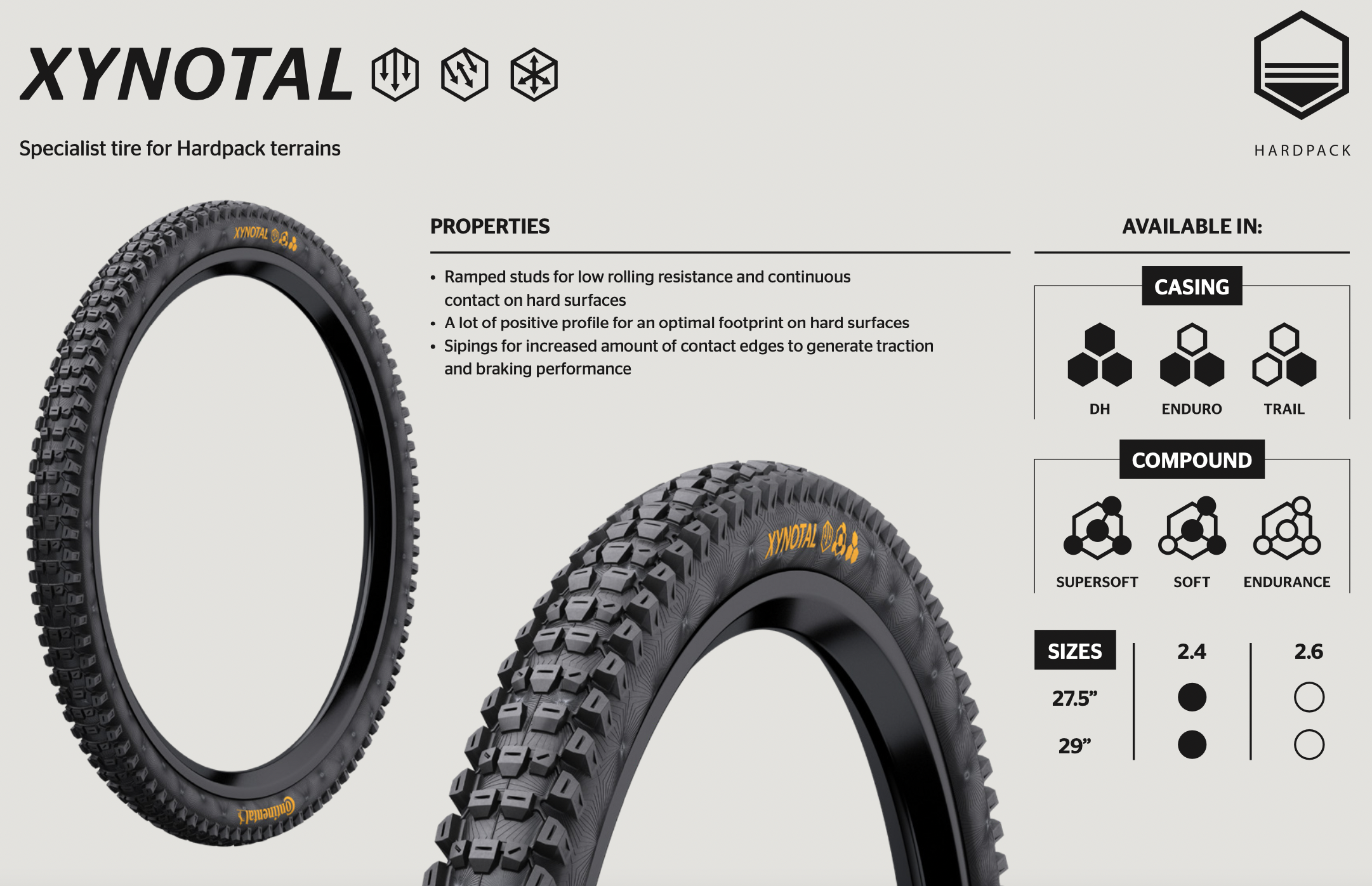 “Optimised for the most demanding dry and / or rocky trails, Xynotal’s tread pattern features angled in-line shoulder studs for predictable cornering. Combining a pronounced positive profile with a large number of contact areas, it maximises grip on both hard and slightly loose surfaces when moisture is not a factor. Pronounced ramps in the direction of rotation ensure low rolling resistance without compromising traction under load.”
