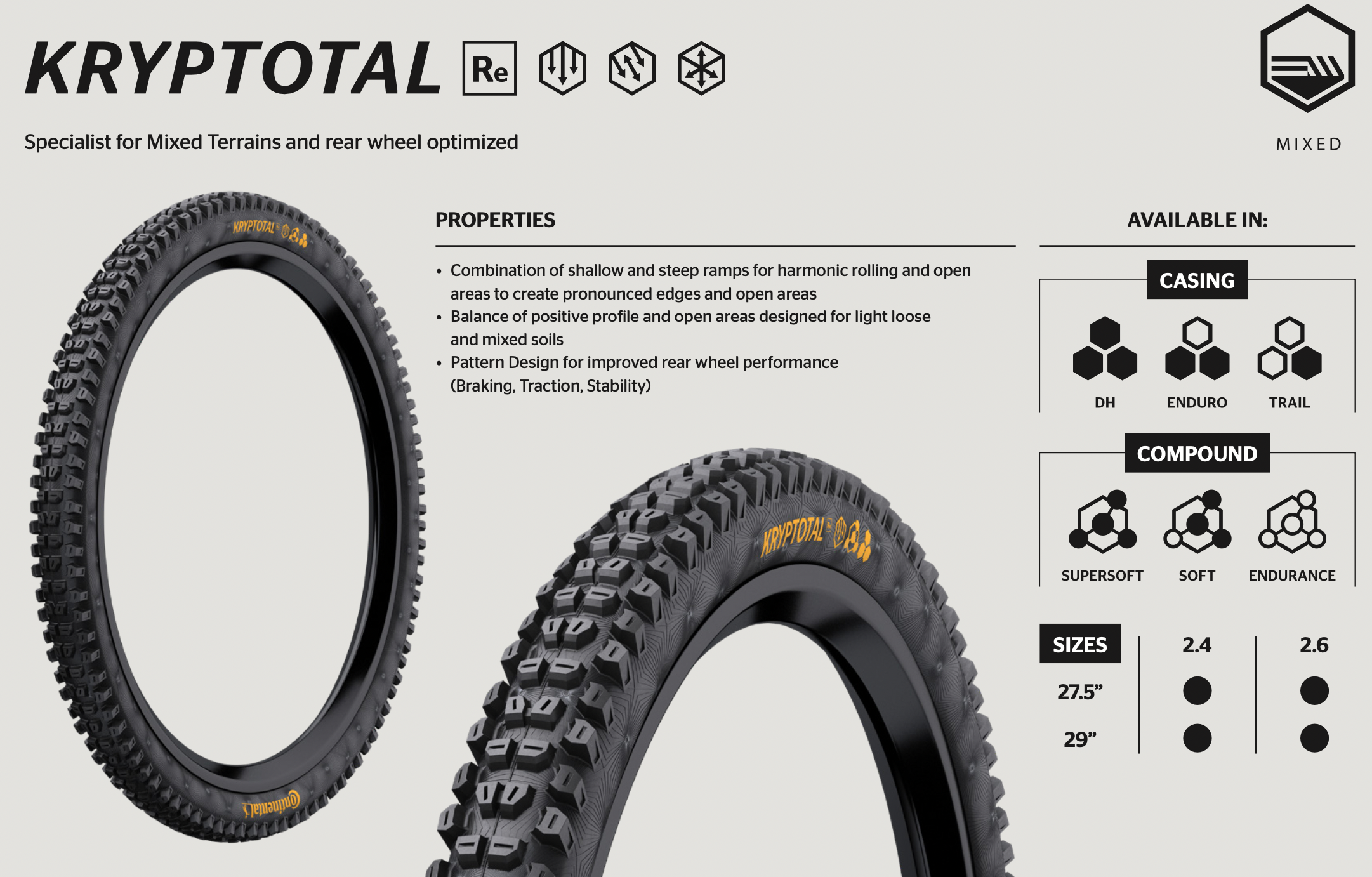 “Available in distinct front and rear optimised versions, Kryptotal’s tread pattern features a balance of positive profile and open areas designed for the best performance in complex terrains or trails that feature multiple surfaces. The use of steep and shallow ramps offer riders a sweet spot of grip, self-cleaning and low rolling resistance. Whilst the tread pattern for Kryptotal Fr is optimised for front-end grip and cornering stability, Kryptotal Re is optimised for the rear wheel demands of braking and rear-end stability.”