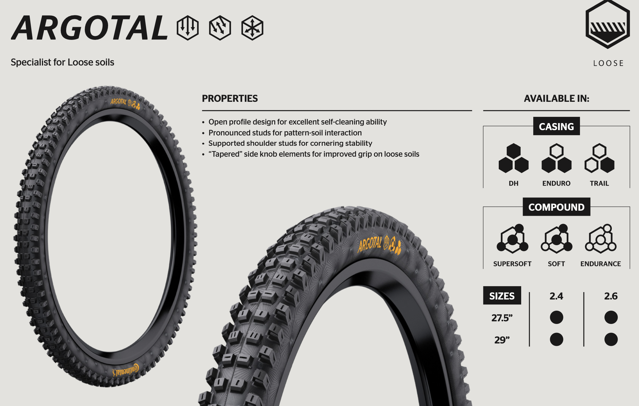 “Supported in-line shoulder studs and a highly supportive structure result in Argotal offering maximum mechanical grip and cornering stability on loose dirt. The open tread pattern design and pronounced studs with steep ramps generate the best possible interaction with a loose surface whilst supporting self-cleaning, to inspire confidence at every stage of the trail.”