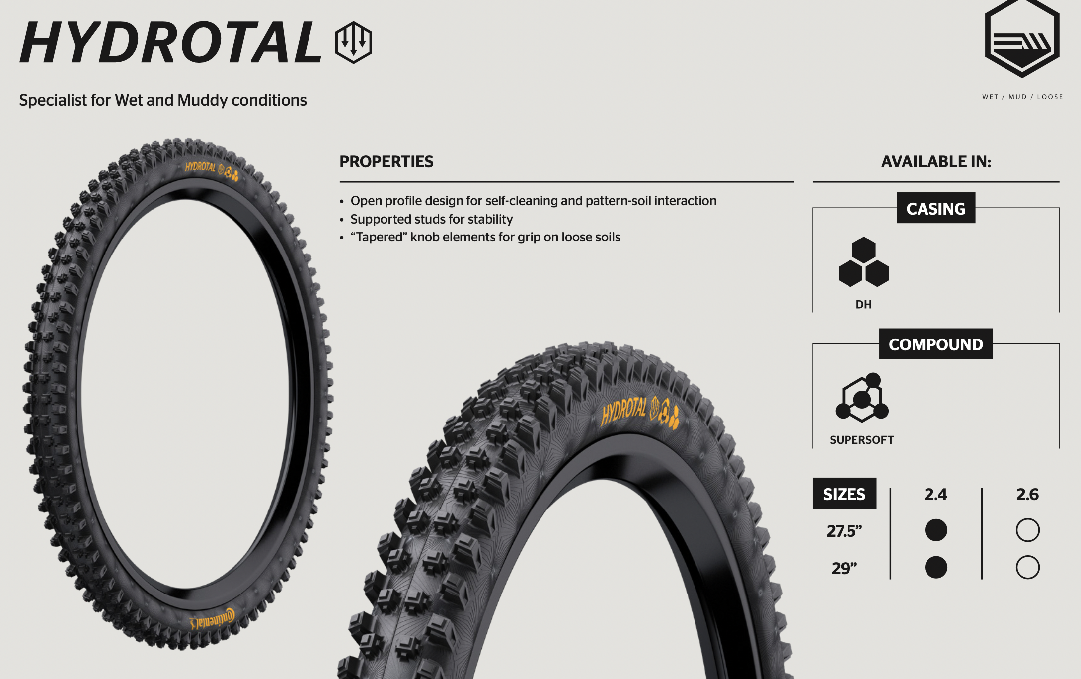 “Tapered and supported stud elements paired with an open tread pattern design supports maximum grip on wet and muddy terrain. With a self-cleaning capability critical to riding in the sloppiest conditions, in-line shoulder studs and an optimised support structure ensure grip when cornering aggressively in low grip situations.”