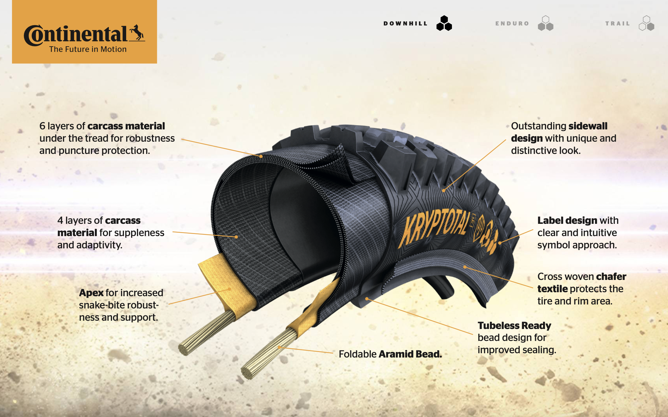 The Downhill Casing has six layers of carcass material, additional carcass reinforcement and an Apex layer.