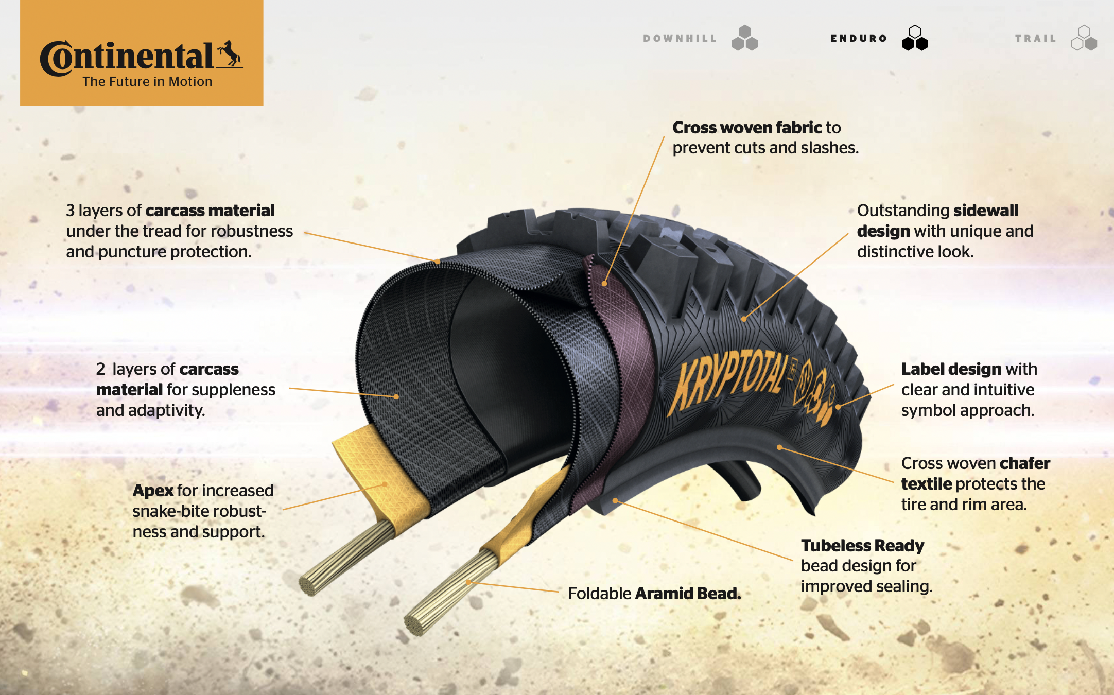 The Enduro Casing adds an Apex layer under the carcass for increased durability and protection against pinch flats.