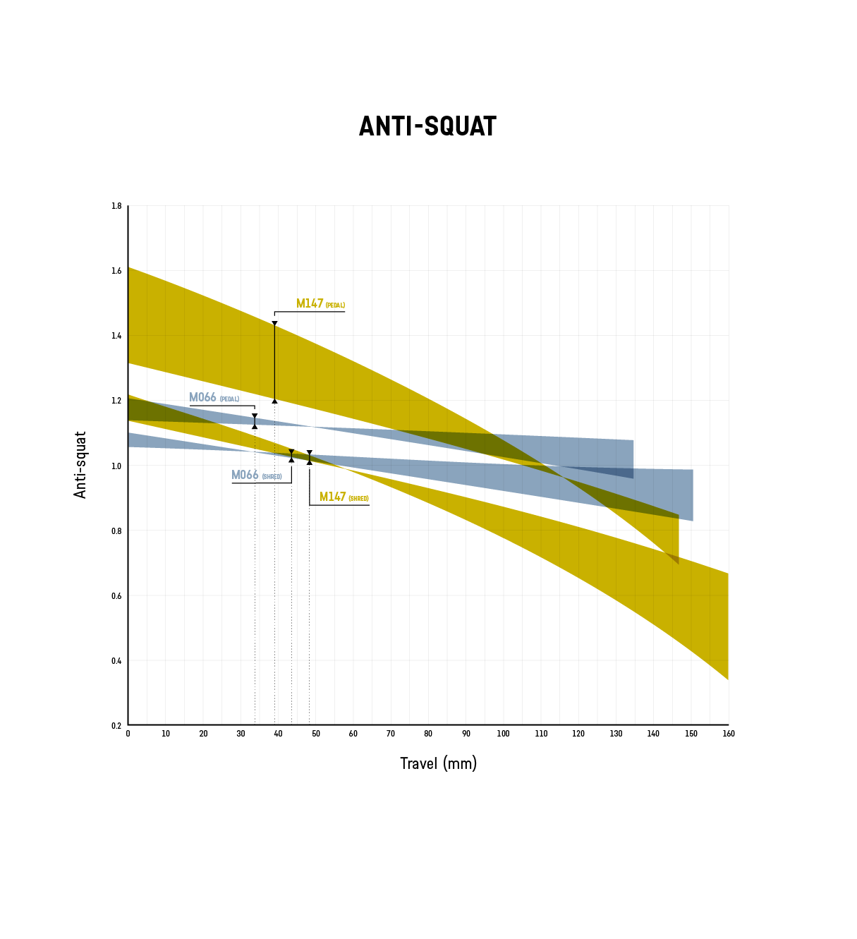Anti squat was increased around the sag point. To help offset pedal kick, anti squat drops away quickly after sag. The anti squat drops away even further when the bike is in Shred setting.