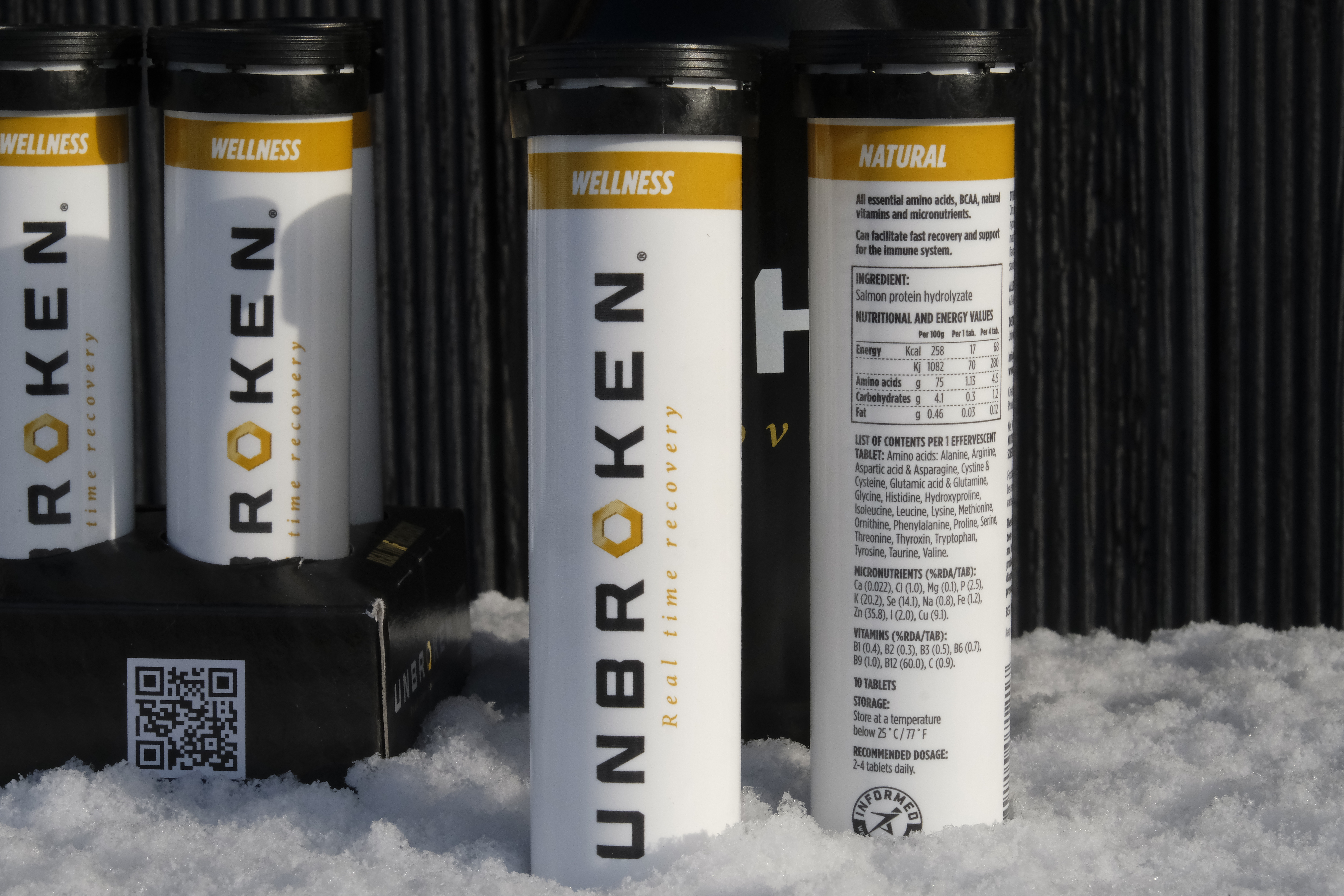 These contain, among other things, Norwegian salmon, so they’re not suitable for vegetarians. They’re effervescent tablets made from salmon but with a citrus flavour, designed to be easily absorbed by the body when consumed to fight tiredness, boost your immunity, and help recovery. What’s in it apart from salmon? Well, you did ask: amino acids: Alanine, Arginine, Aspartic acid & Asparagine, Cystine & Cysteine, Glutamic acid & Glutamine, Glycine, Histidine, Hydroxyproline, Isoleucine, Leucine, Lysine, Methionine, Ornithine, Phenylalanine, Proline, Serine, Threonine, Thyroxin, Tryptophan, Tyrosine, Taurine, Valine. Vitamins (% recommended daily allowance RDA): B1 (0.4%), B2 (0.3%), B3 (0.5%), B6 (0.7%), B9 (1.0%), B12 (60%), C (0.9%). Micronutrients (% recommended daily allowance RDA): Calcium (0.022%), Chlorine (1.0%), Magnesium (0.1%), Phosphorus (2.5%), Potassium (20.2%), Selenium (14.1%), Natrium (0.8%), Iron (1.2%), Zinc (35.8%), Iodine (2.0%), Copper (9.1%).