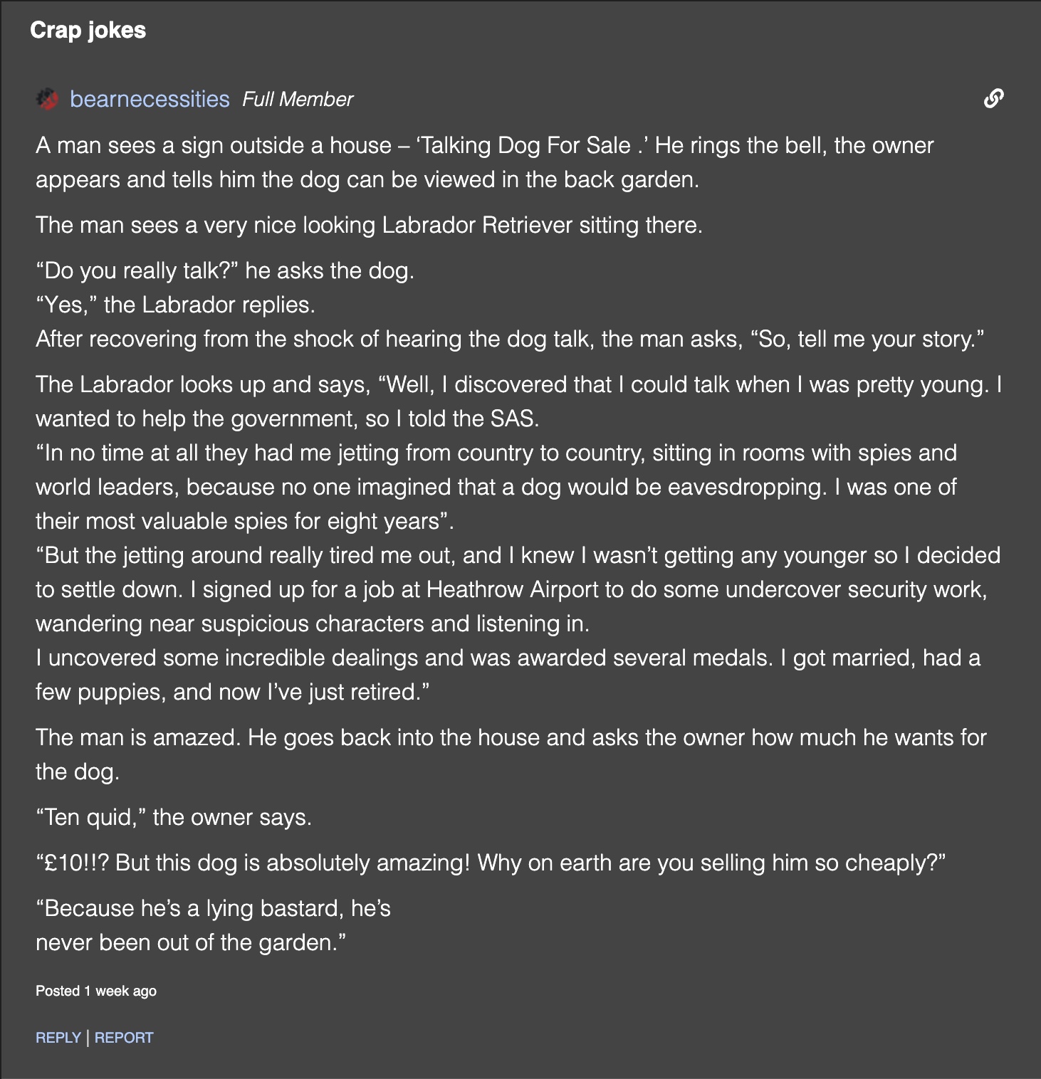 This week’s TOTW goes to Rich for getting the ball rolling on some crap jokes…