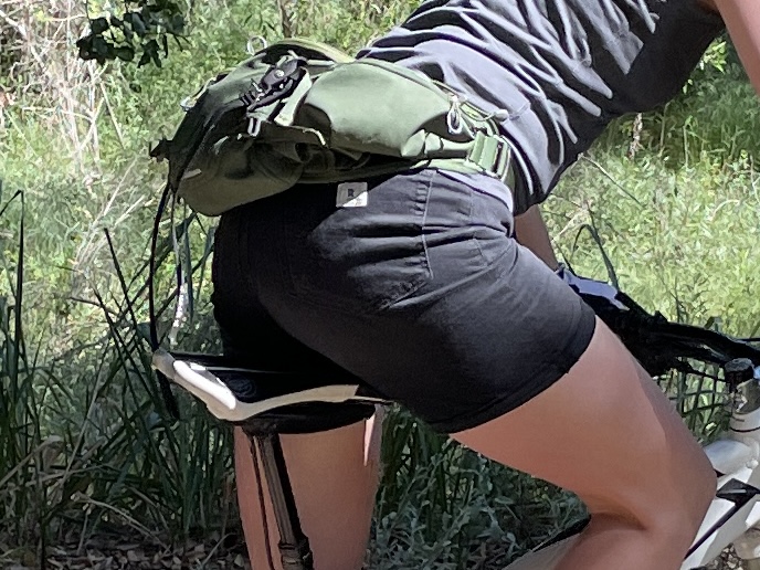Super stretchy denim shorts designed for riding bikes in. The concept works surprisingly well in sunny climes, and Hannah is yet to try them out going through puddles. These are the hemmed variety, though there are frayed cut off versions too. They’re cut with a high waist, so there’s no gap for your bum to hang out of when riding.
