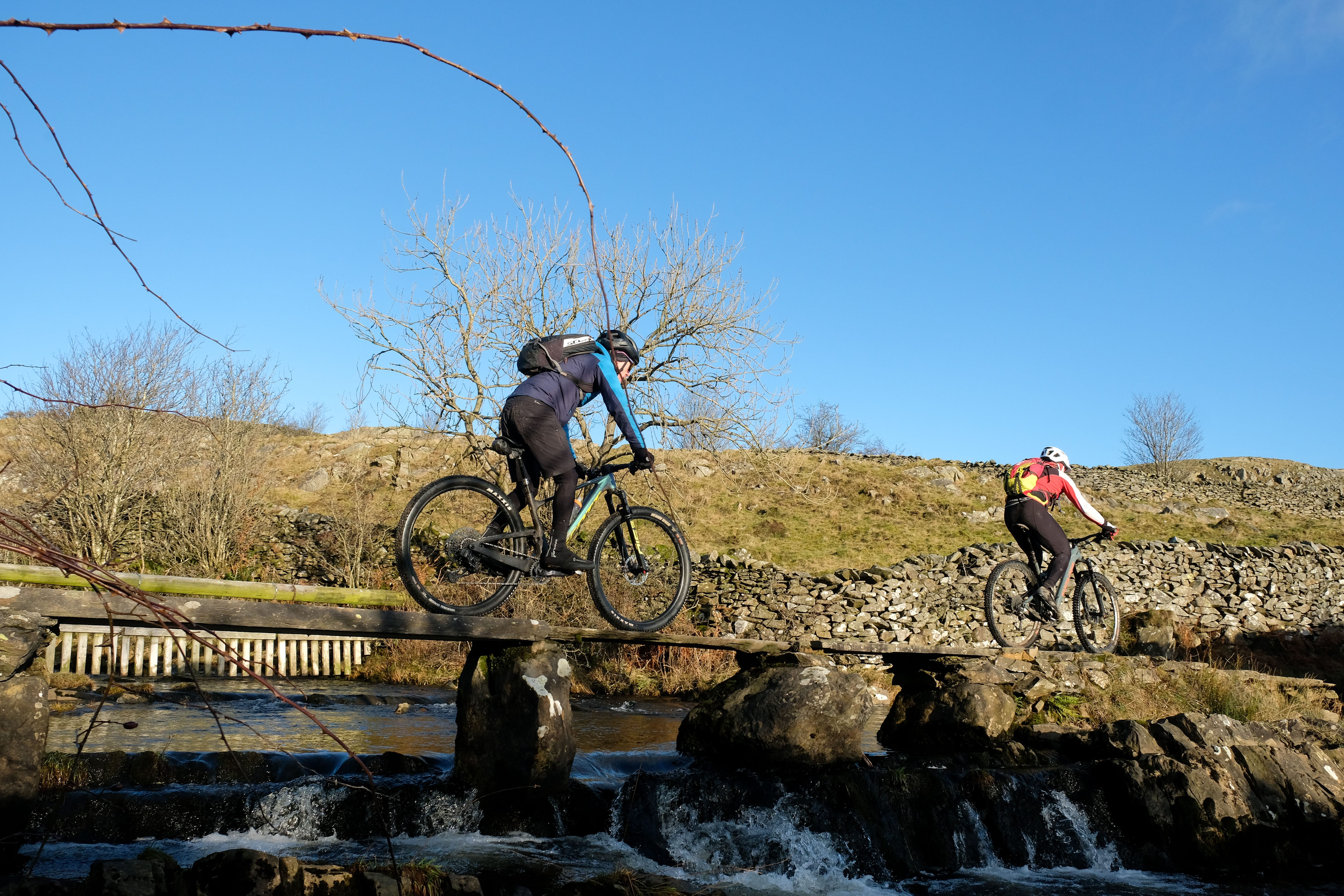 Mark had promised some fun for our run back towards the pub and we left the limestone behind, ignoring the right turn that would have taken us to Ingleton. Instead, we had a fun descent back towards the valley floor on a network of old sunken ways. These were fast and fun to ride, with the occasional high-level river crossing thrown in for a bit of mild peril. The high stone walls added to the sense of speed and the occasional sniper rock kept egos in check.