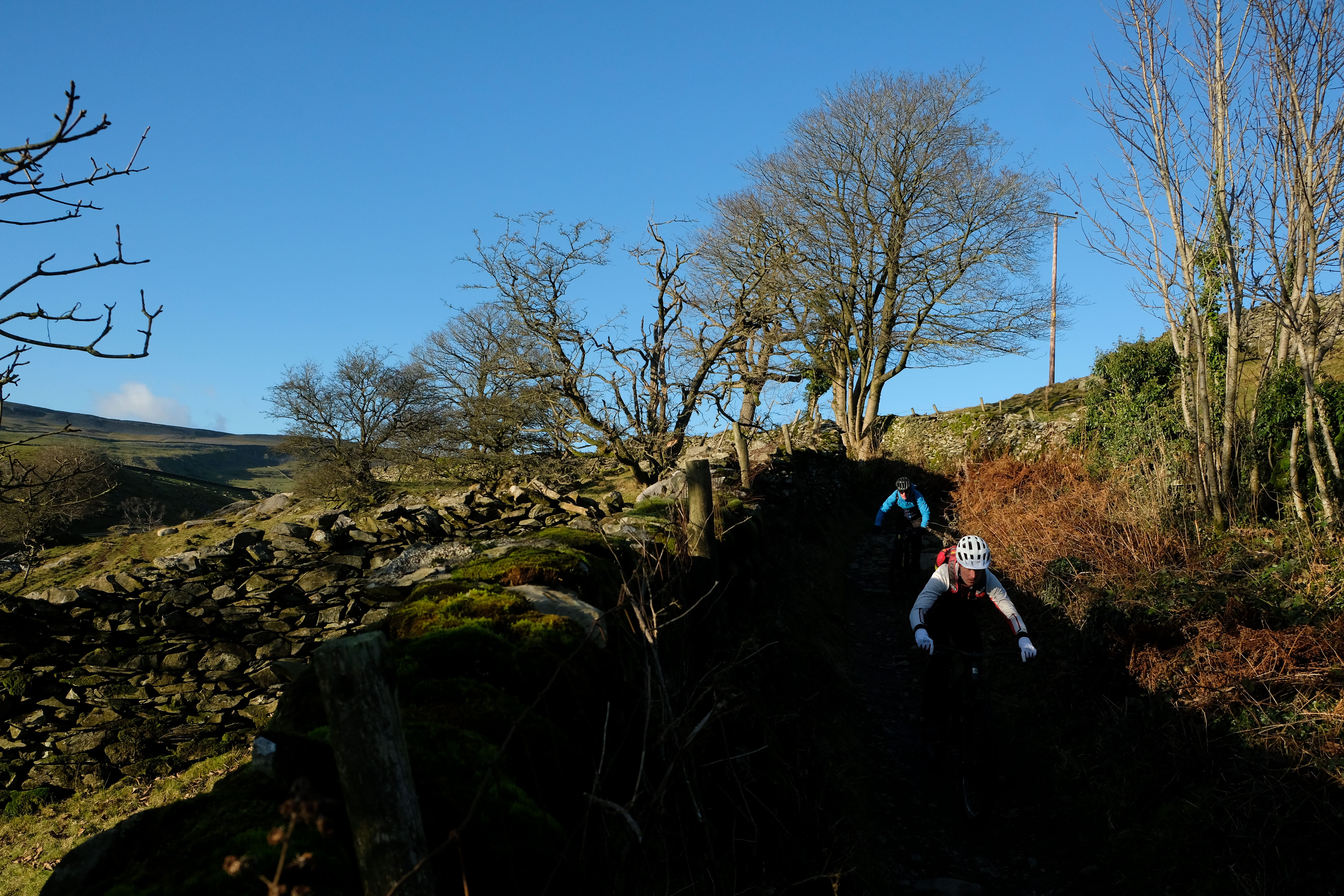 It’s a walled byway that goes straight up into the sky, with no time to warm up, towards the nose of Pen-y-Ghent. You can see it looming, right ahead of you. This stony track takes you on a beeline right towards the bulk of Pen-y-Ghent, dramatically lit as it was by the low sun. I was soon trailing in the wake of Nick and Mark, both complete bike riders in the old-school style: mountain biking, road, cyclocross… if it has wheels, they’re happy to ride it.