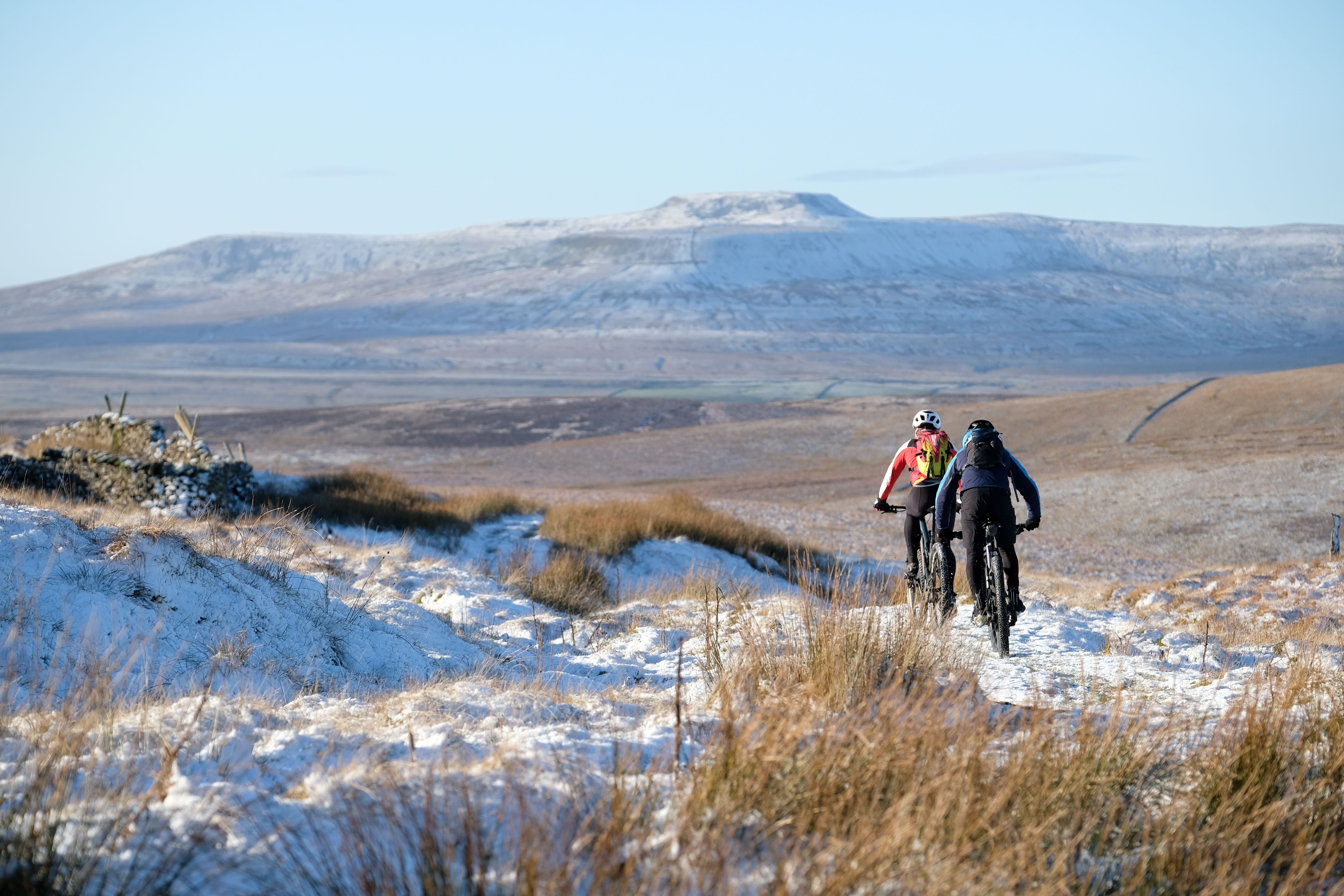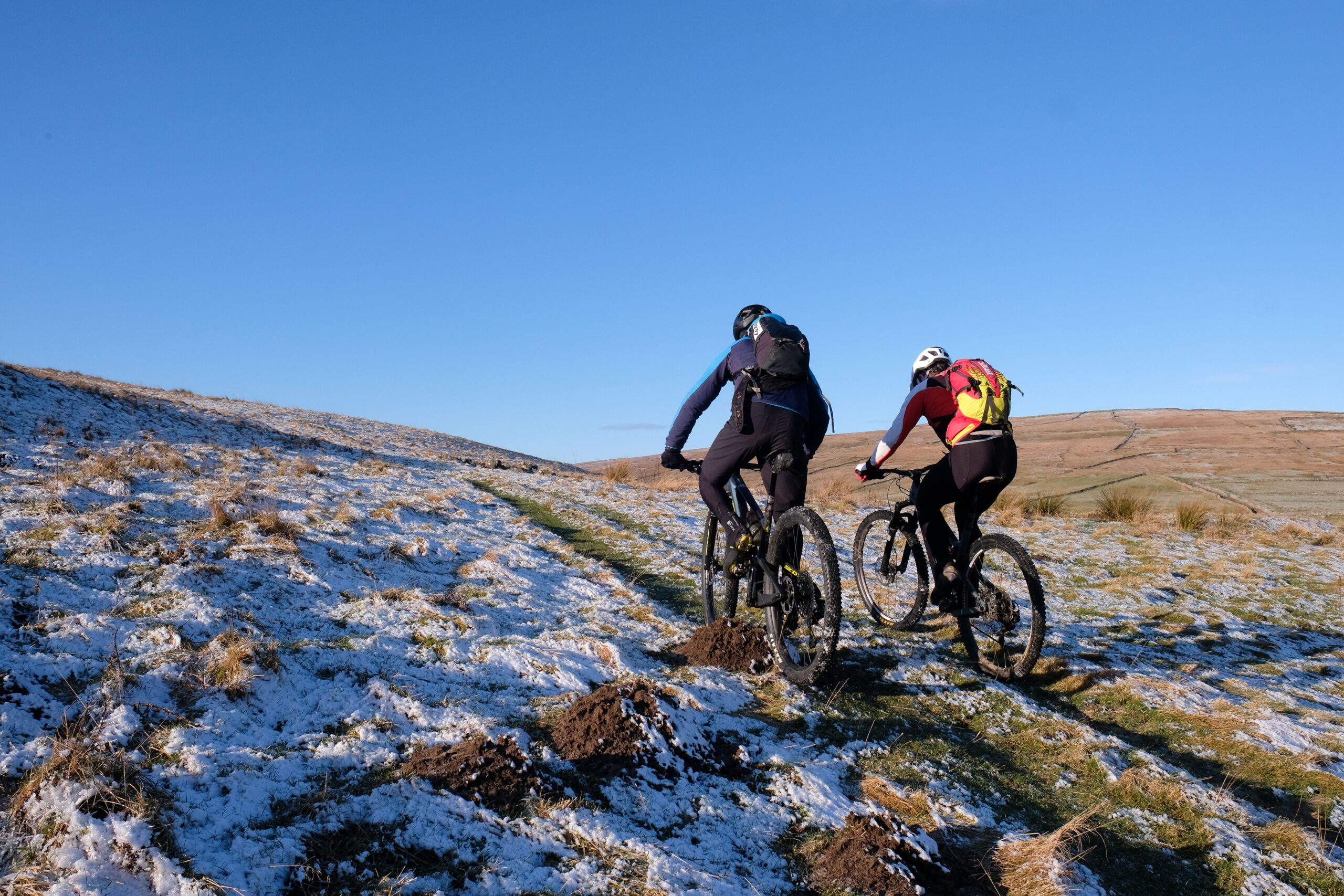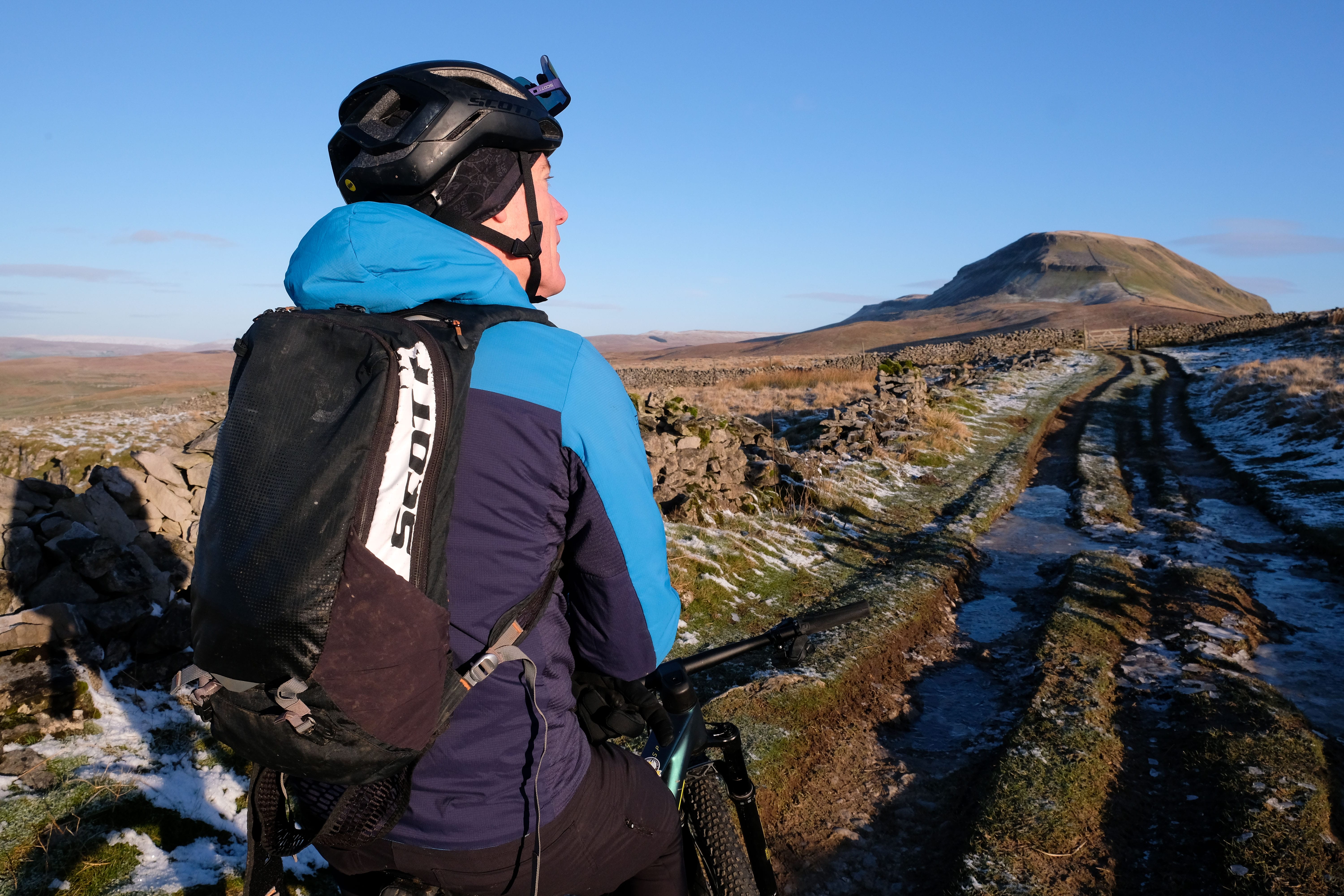 With the main mass of Pen-y-Ghent behind us, we still had to head back over the ‘tail’ of the hill, but first it was time for some snacks. Once again, I realised I was in the company of ‘proper’ cyclists, as there was none of that energy gel business here; it was sandwiches and pies, proper-style, before starting our traverse of the back of the hill over towards Foxup Moor. Starting with a very off-and-on the bike climb, even for Nick, thanks to contours and icy conditions, we were soon enough on a more level trail that contours round the back of the hill. As we rounded the corner, another of the legends of the Three Peaks came into view, dead ahead: Ingleborough, and specifically the climb of Simon Fell. Nothing strikes fear into newcomers to the race more than this seemingly vertical slab of tufty grass. There is no trail and the race just shoots a straight line up, slicing through the tightest of contours. It’s a strain on legs, tight calf muscles and hands as you grip onto the tussocks to stay upright.