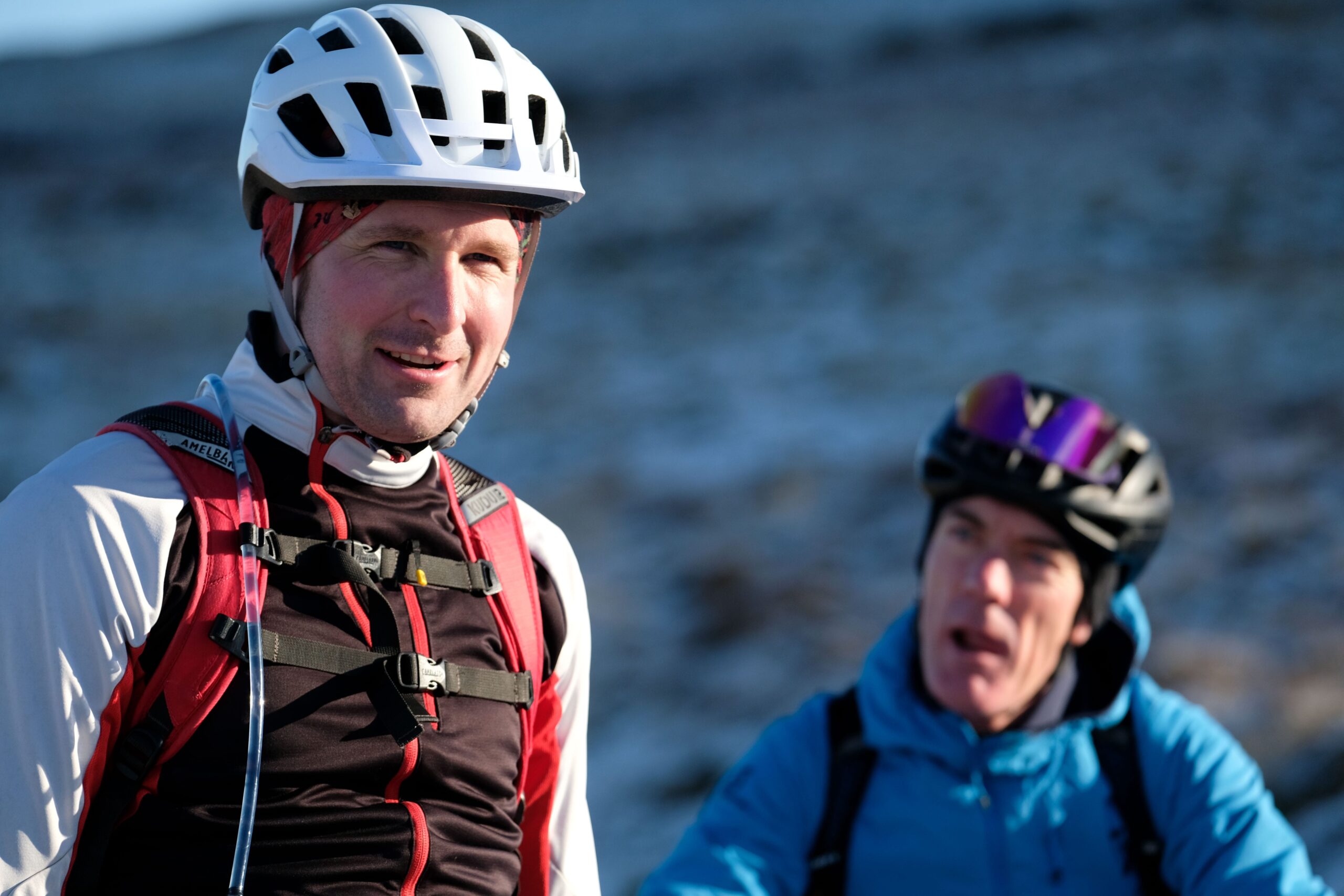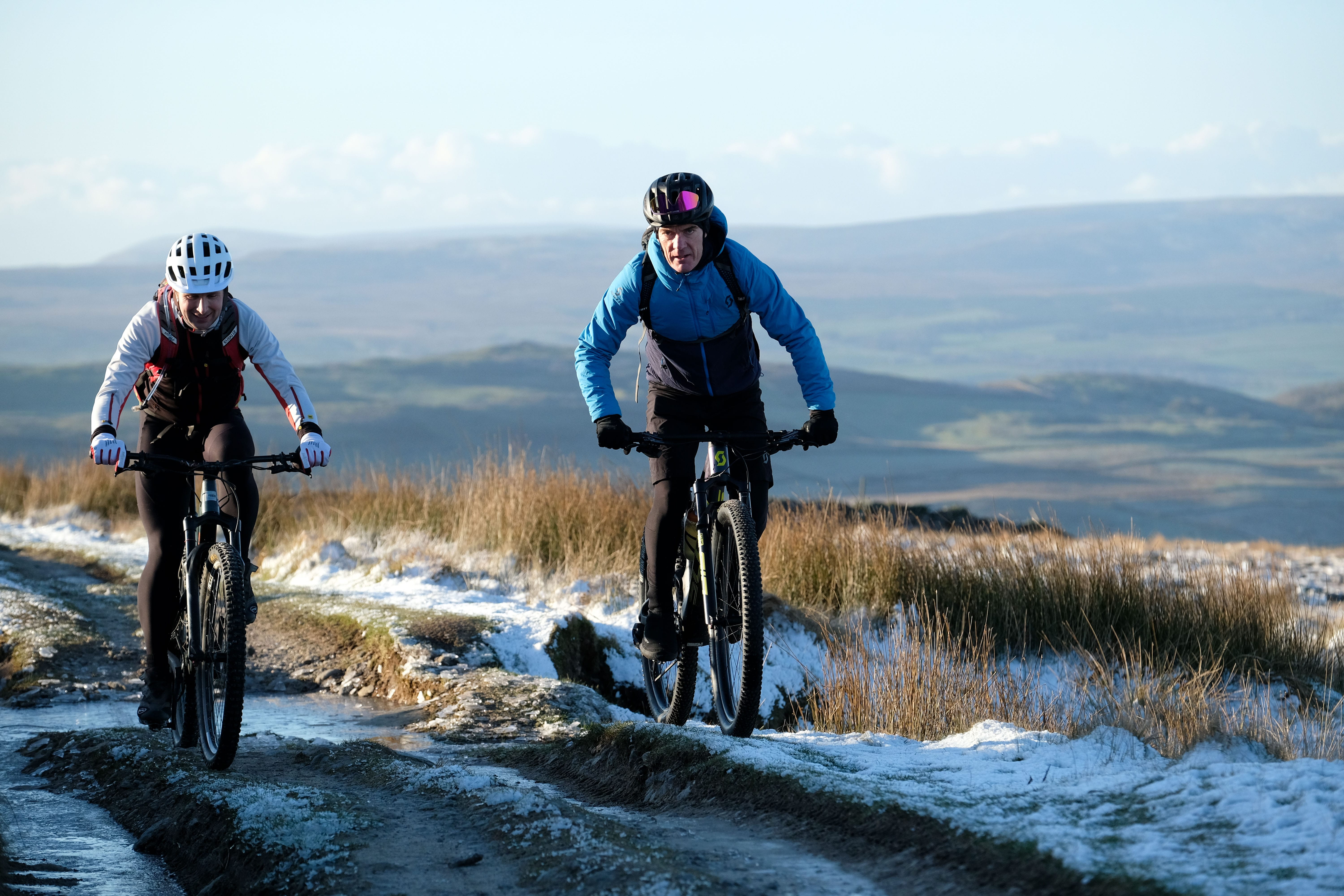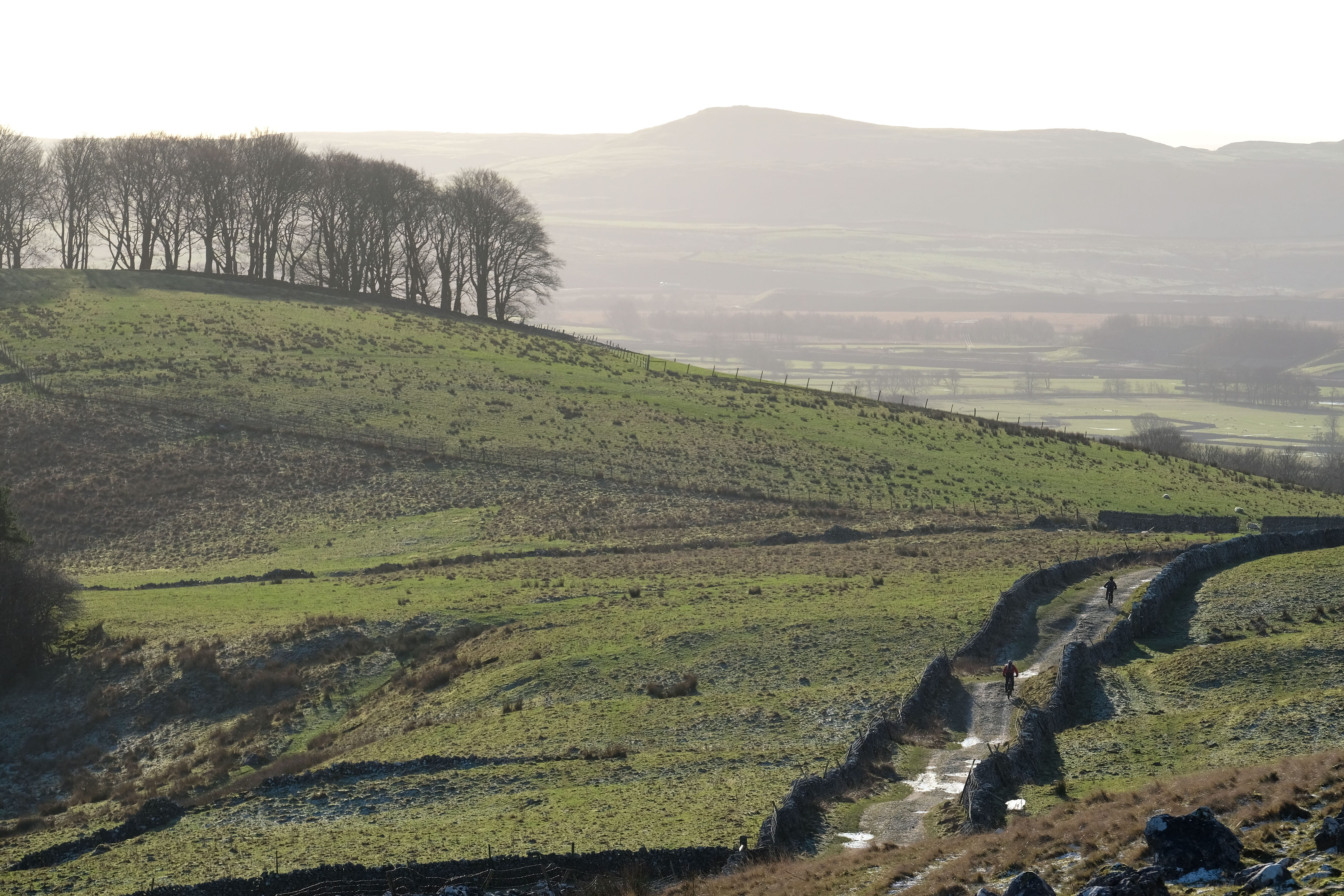 With the main mass of Pen-y-Ghent behind us, we still had to head back over the ‘tail’ of the hill, but first it was time for some snacks. Once again, I realised I was in the company of ‘proper’ cyclists, as there was none of that energy gel business here; it was sandwiches and pies, proper-style, before starting our traverse of the back of the hill over towards Foxup Moor. Starting with a very off-and-on the bike climb, even for Nick, thanks to contours and icy conditions, we were soon enough on a more level trail that contours round the back of the hill. As we rounded the corner, another of the legends of the Three Peaks came into view, dead ahead: Ingleborough, and specifically the climb of Simon Fell. Nothing strikes fear into newcomers to the race more than this seemingly vertical slab of tufty grass. There is no trail and the race just shoots a straight line up, slicing through the tightest of contours. It’s a strain on legs, tight calf muscles and hands as you grip onto the tussocks to stay upright.