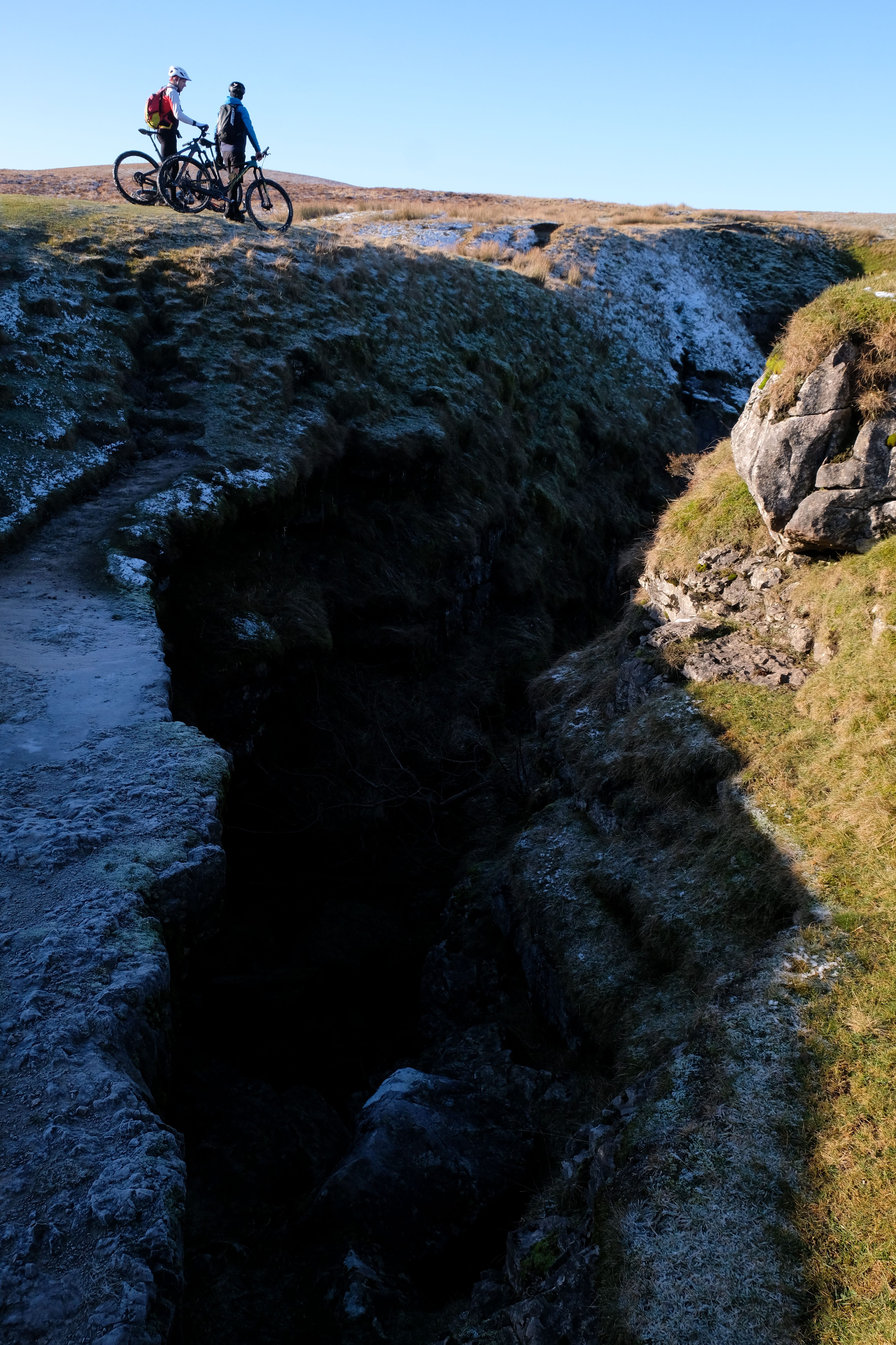 We took a little detour off the track and wandered over to see Hull Pot. This is an impressive limestone hole in the ground, made by water erosion. It’s nearly 100m long and is 18m wide and 18m deep. Mark informed us that it keeps the local Mountain Rescue busy all year, usually fallen dogs and sheep, but also the occasional human. It’s well worth a quick look – just mind the edge in your cycling shoes…