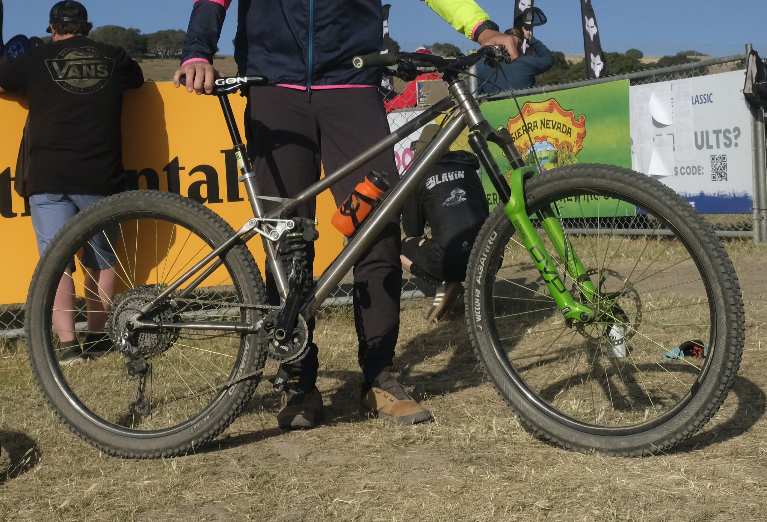 The bikes are made in Lyons, Colorado, and this one is currently built up with 130/150 travel because Jeff is trying to give it a hard time while he’s testing it out. It will be a 120/140 travel bike once it goes into production.