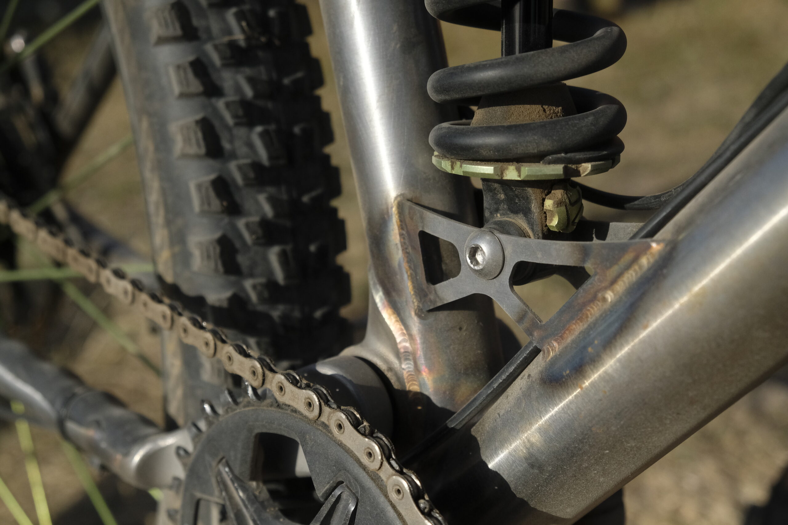 The dropouts and main pivots are 3D printed, plus it’s a flex stay, making the bike surprisingly light – you can build a complete bike up at around 29lbs.