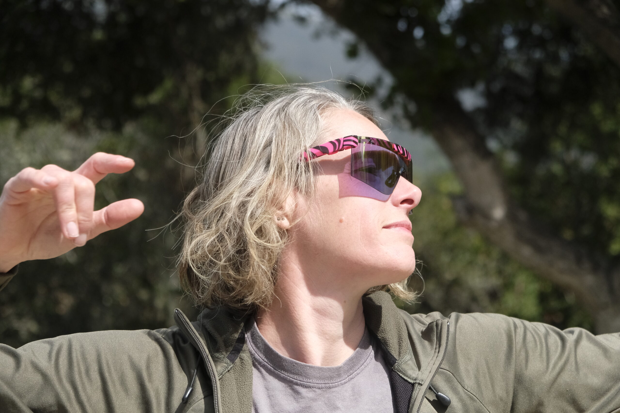 Are you loud enough for these? Is Hannah wild enough for these? We will see what her kids say when she gets home. These are photochromic lenses with 86-20% visible light transmission, and frames designed for use in a range of sports. You can adjust the length and angle of the legs for a closer fit around the face, and there’s a huge amount of coverage if you’r trying to keep bugs out of your eyes.