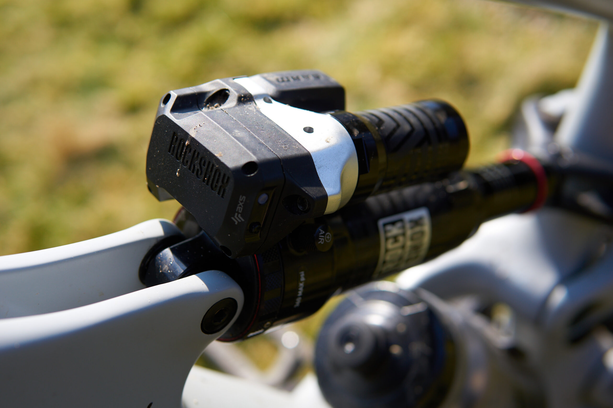 Aside from looking all spiffy and futuristic, this system also offers a number of potential advantages over conventional manual lockouts. For one, it’s very fast – SRAM claim that changes in settings are executed in hundredths of a second. It’s safer and more convenient than reaching between your legs and fumbling around for a tiny lever. It also looks much cleaner and easier to adjust than a bunch of cables connecting your suspension to your bars. I’ve not spent much time on bikes with remote lockout levers, but even in my limited experience there’s a point where fiddly tweaks to cable tension are needed to keep everything working as intended.