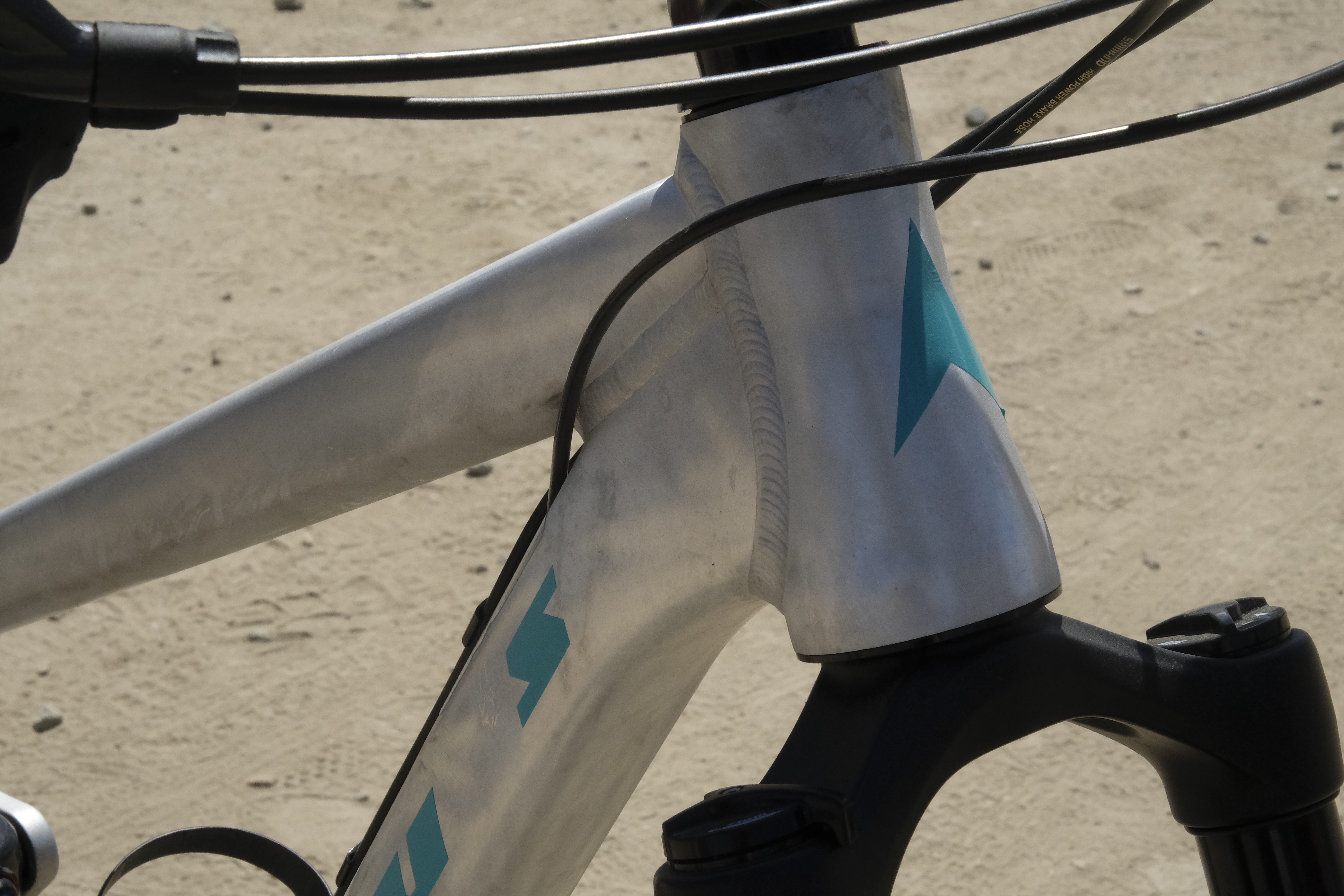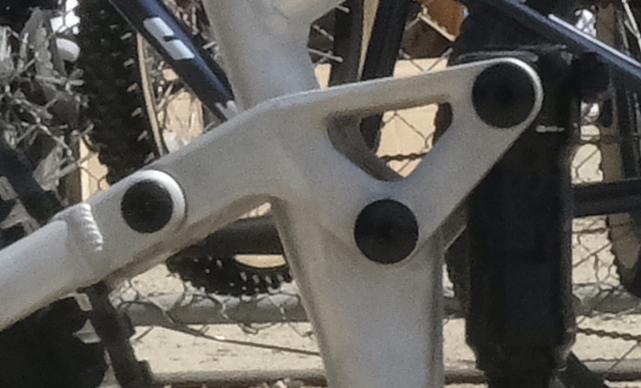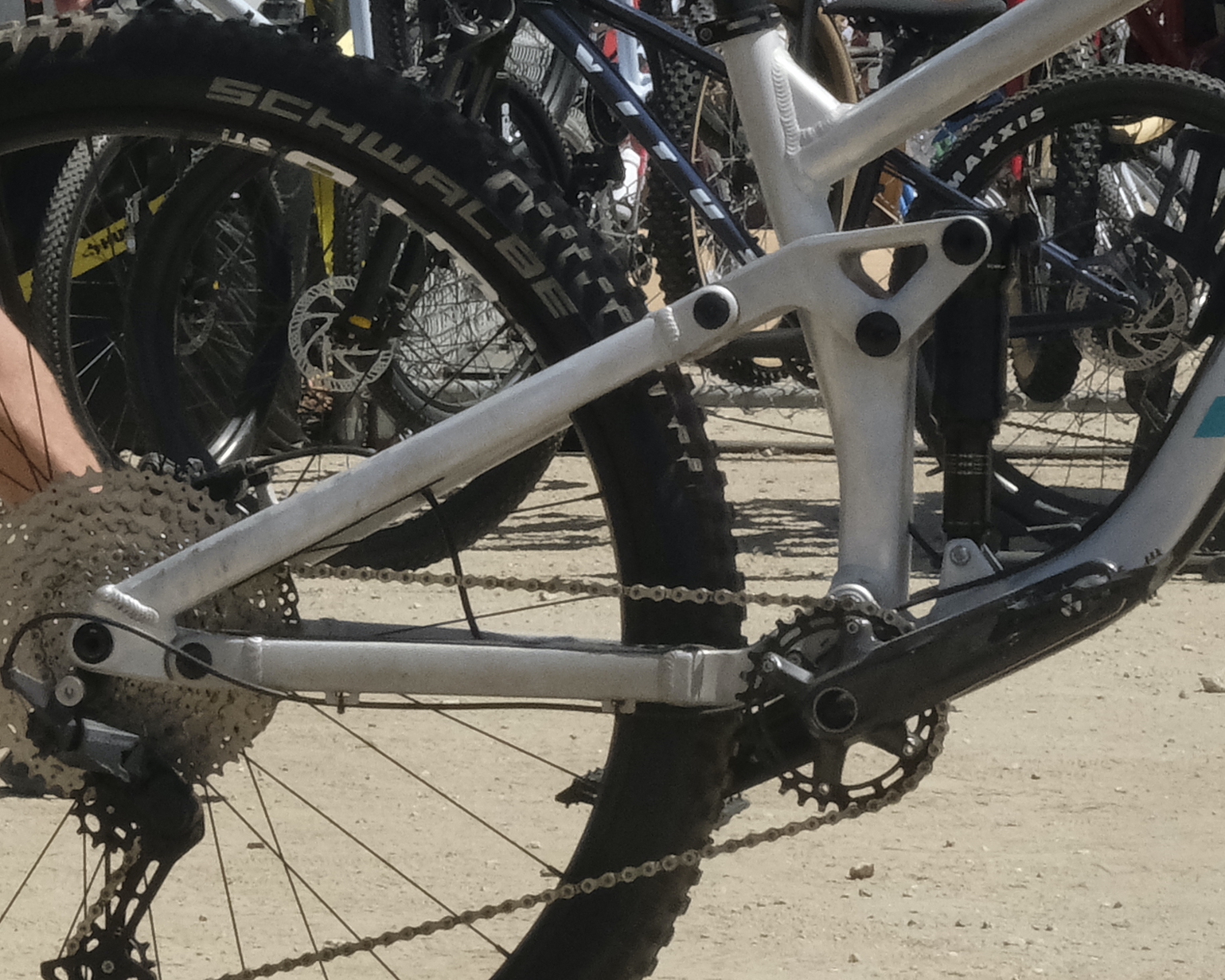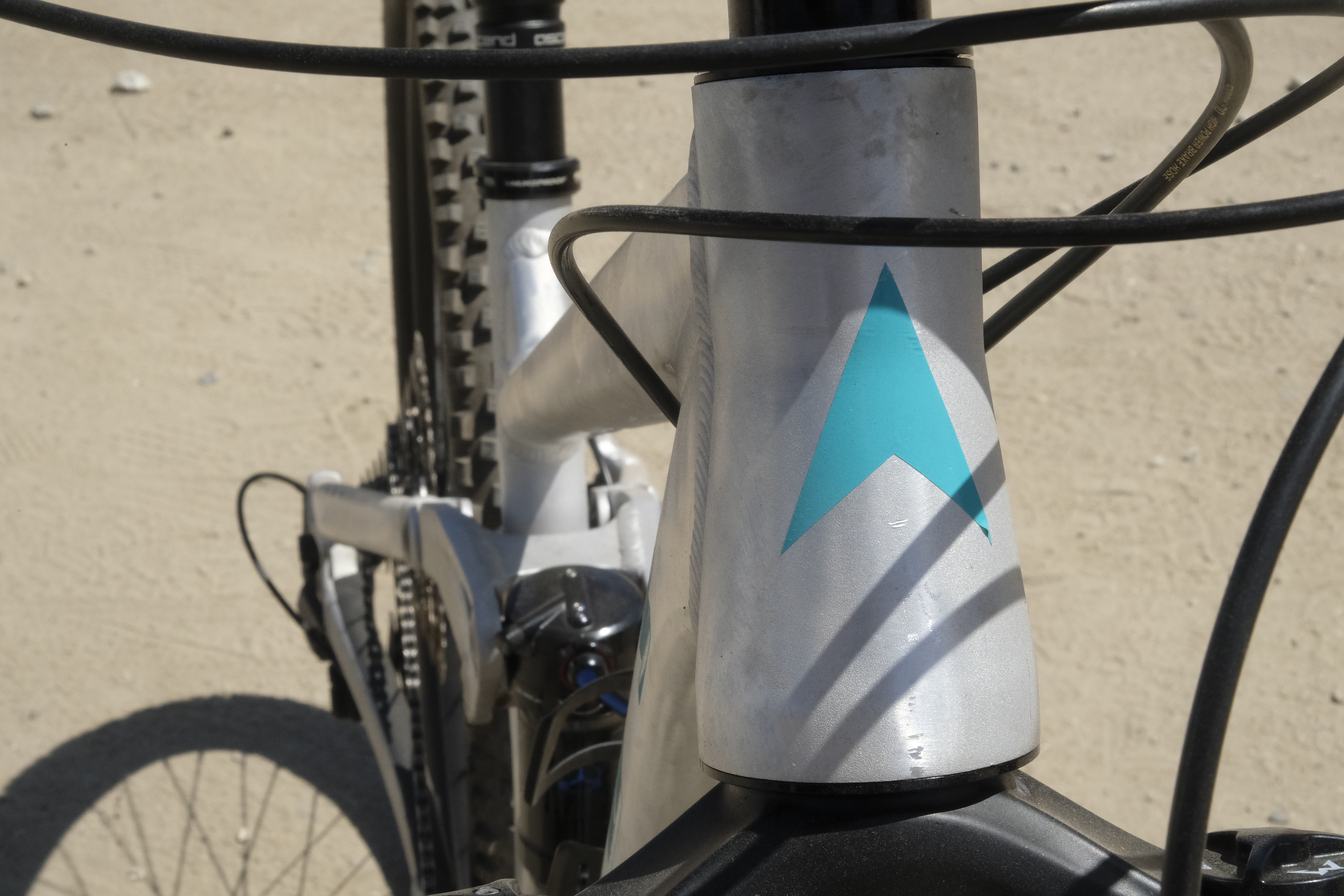 This prototype has a 77° seat tube angle and 65.5° head angle, with 140/140mm travel.