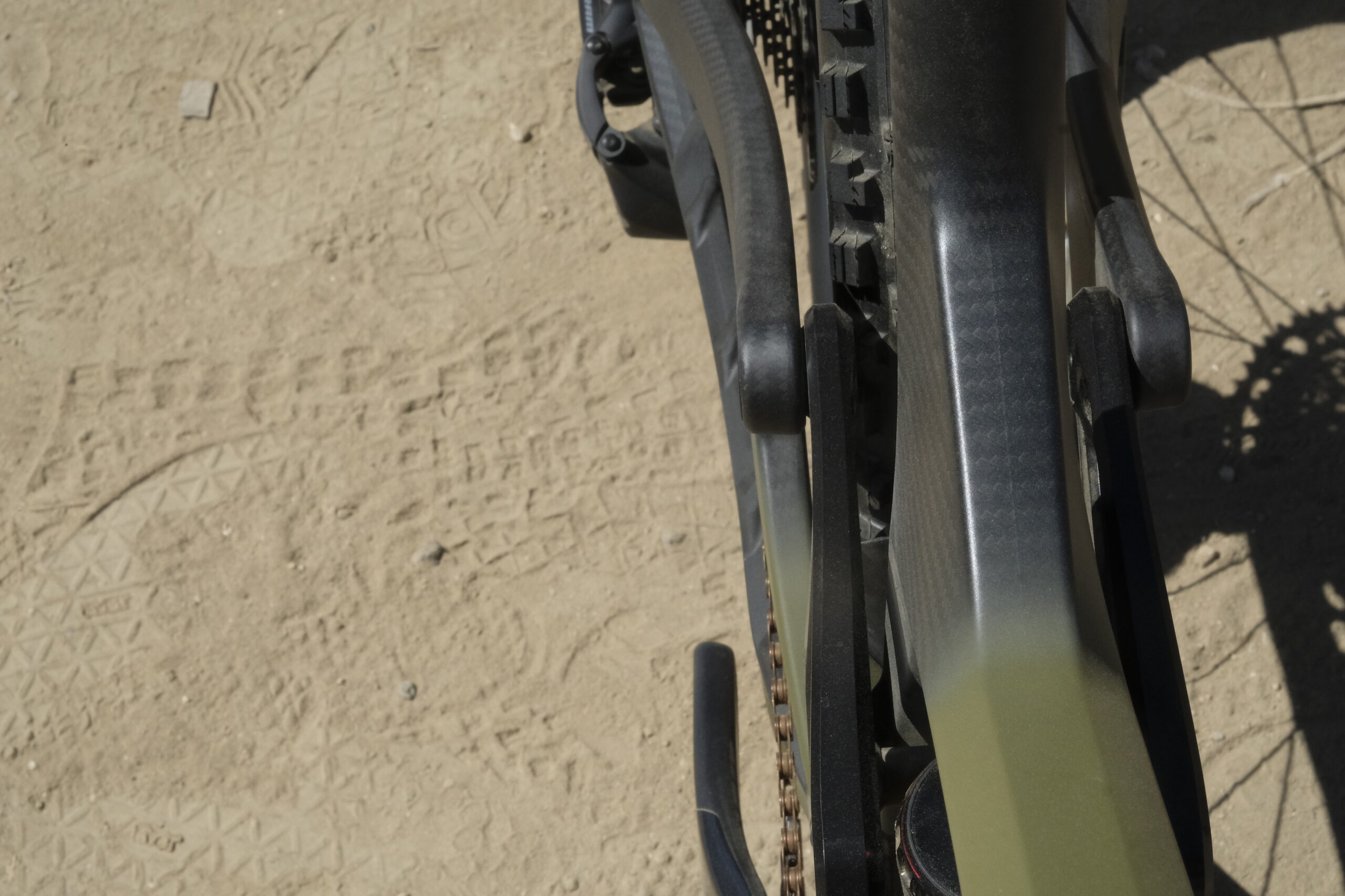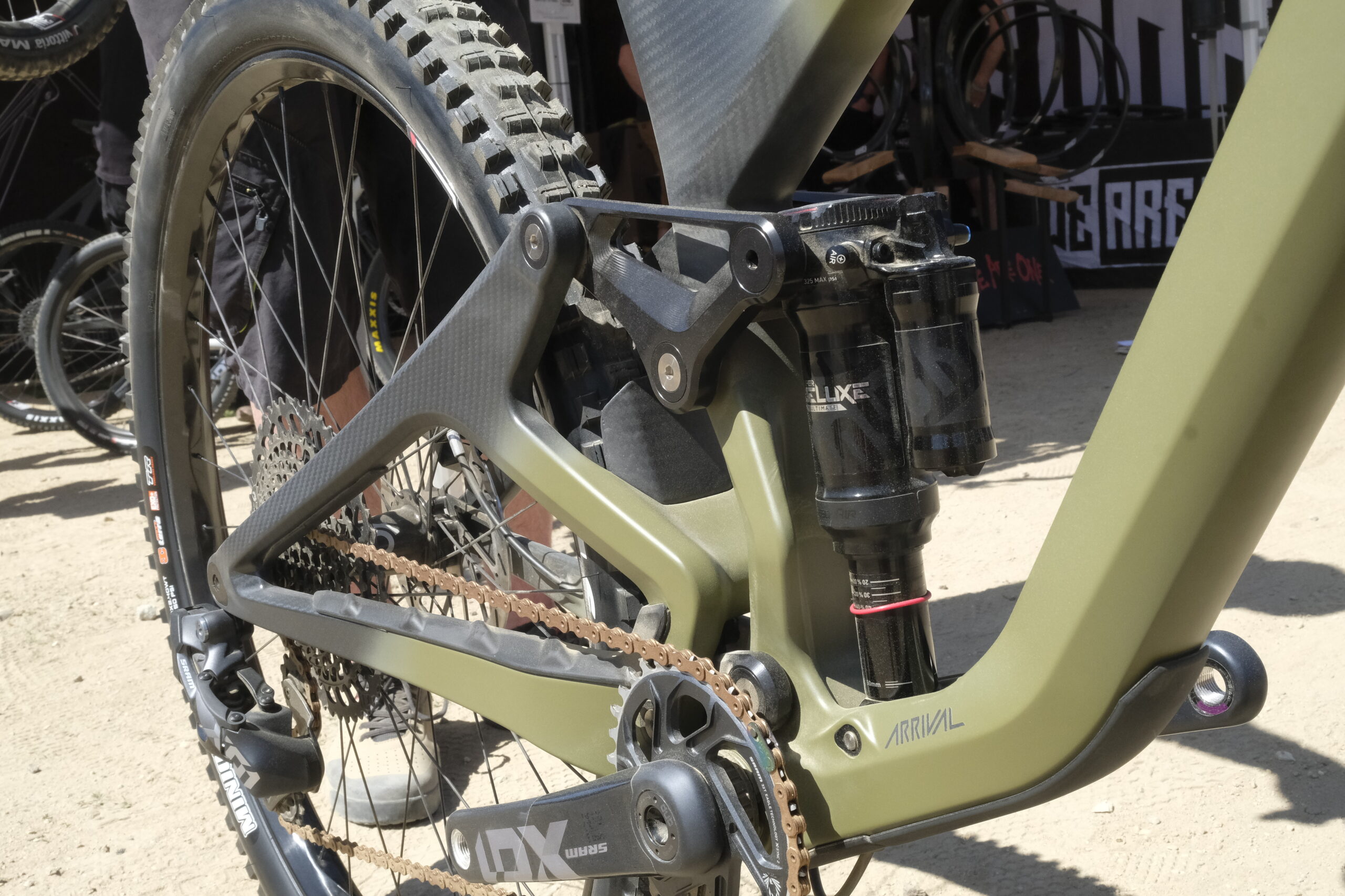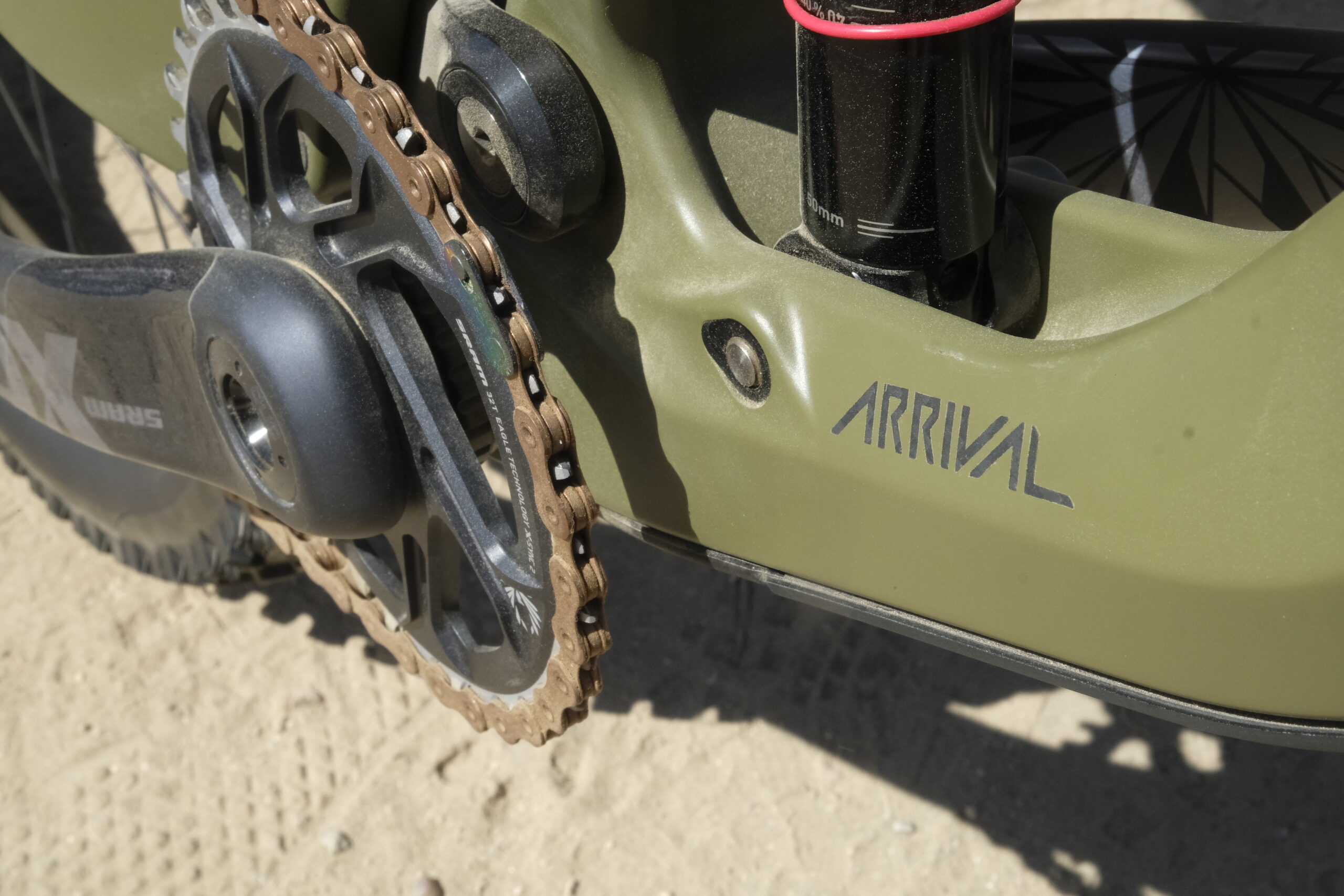 There is no head badge or branding anywhere on the bike, except for this ‘Arrival’ below the shock. This is created by leaving the lettering area unpainted, so it’s the raw carbon finish showing through. The frames are hand painted in their own paint shop, and each ombre finish is slightly different.
