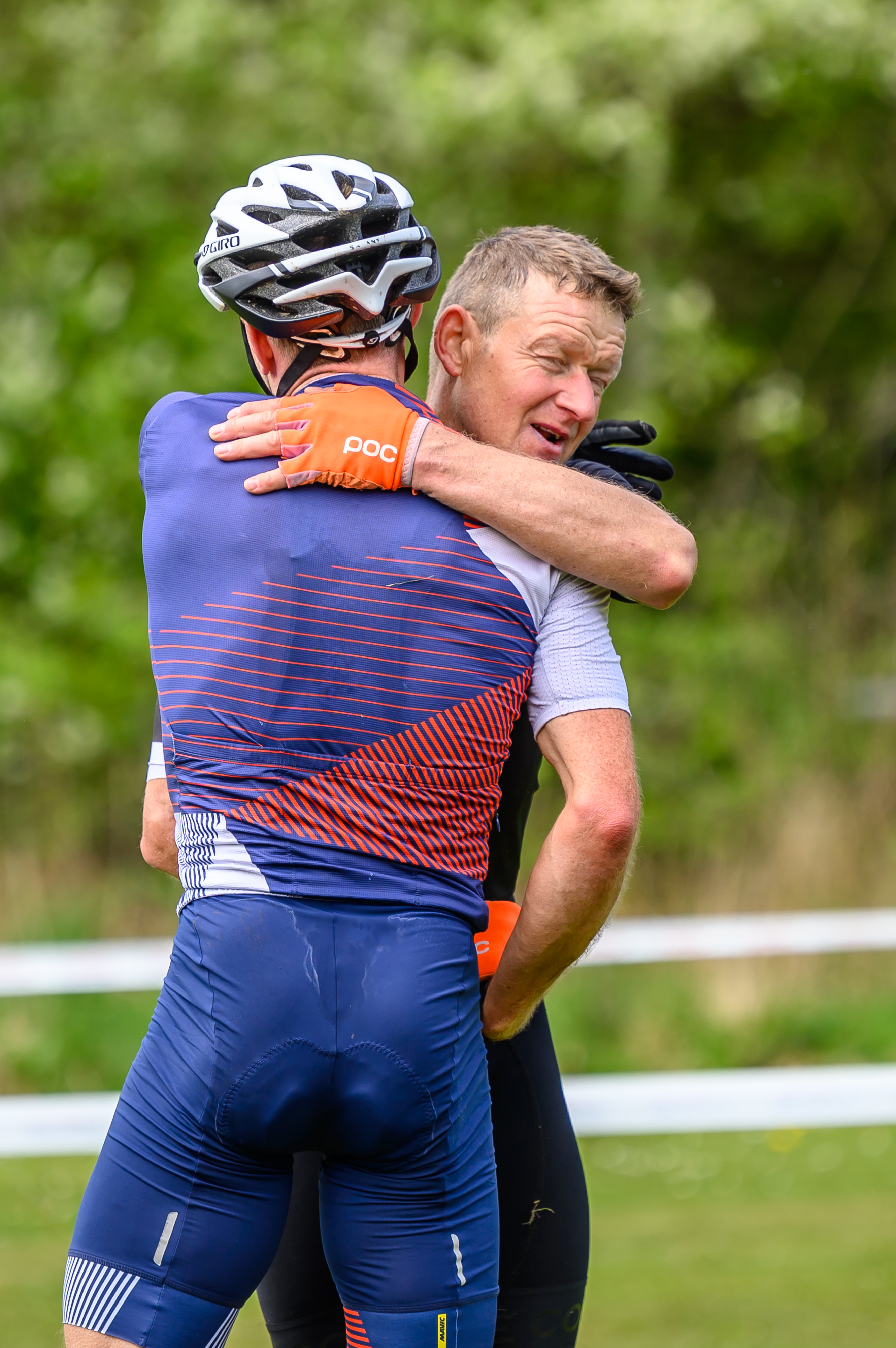 The start (and finish) was a large grassy straight with a big, very wide turn at the bottom. More wide straight before hitting the singletrack of one of the built trails. Like Newcastleton then, a good start was important in order to get your position before the singletrack. Few wiggles through the woods, out onto the field under the pit head and back into the woods before the climb. There was a lovely ribbon of singletrack through the flowering gorse and broom just before a grassy climb. Not just any grassy climb – this had the addition of fresh cow poo for an extra something. The SXC lot do like to treat you. Then the climb continued on a firmer track to the start of the lovely descent. Through the trees with plenty of roots, a few rocks and a couple of (small) drops. So many lines to choose, so many trees to have a quick hug with on the way through. Then a fun section on one of the man-made trails which brought you back to the grassy field and the finish. Fast, flowy and with nowhere obvious to make an attack, it was going to be a race about energy management, and we reckoned there were going to be a few sprint finishes.