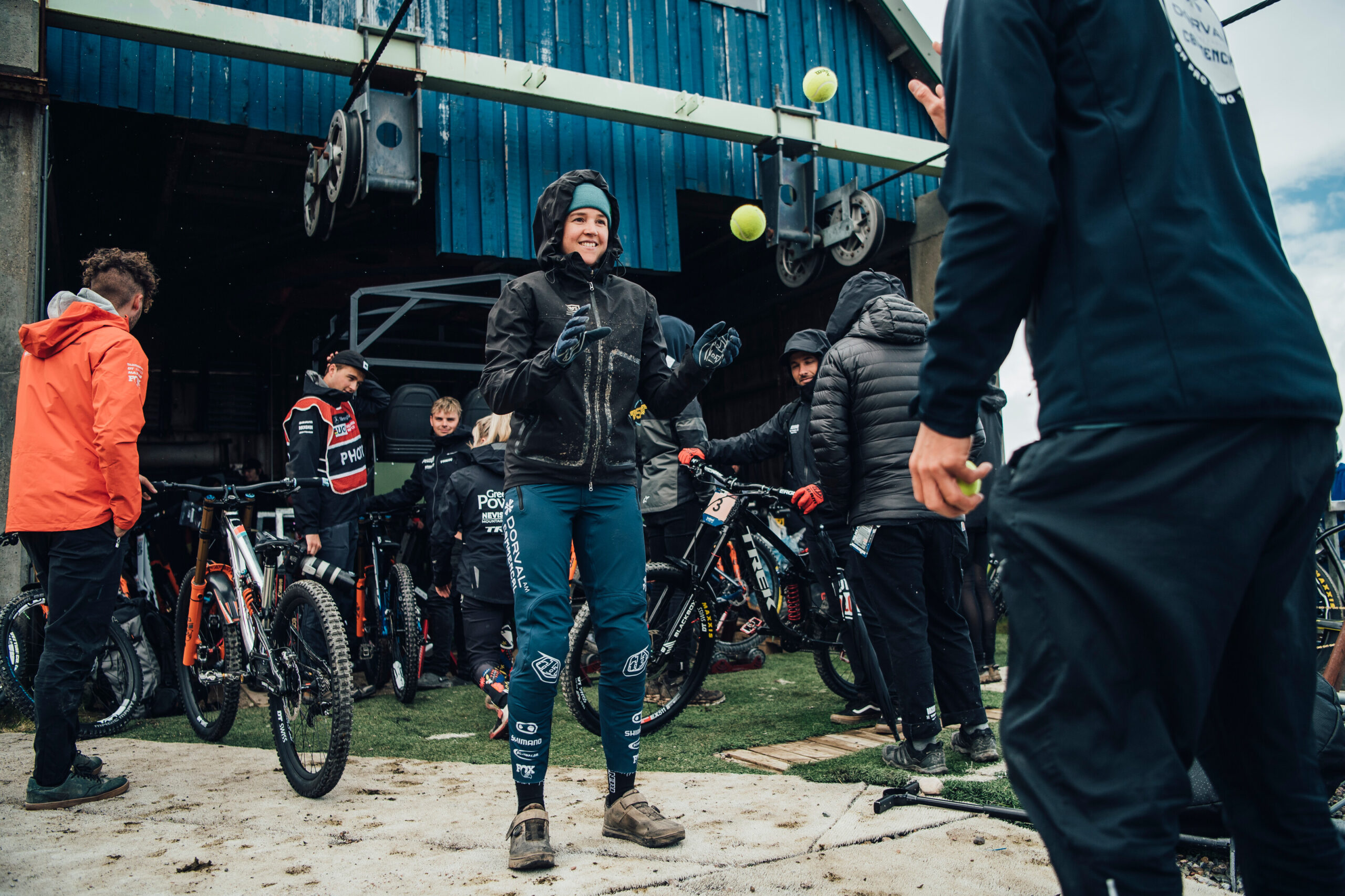 Veronika Widmann was on the podium in 2019 and after a crash in her qually run seeded ninth. She set the early pace in the race though with a 5:29 and headed straight into the hotseat. She didn’t have time to get comfortable though. Next in the start hut was Nina Hoffmann who, having taken victory in the National Downhill race at Fort William a fortnight earlier was the form rider. In qualifying Hoffmann was fastest at split three only to flat on the stump gap before the motorway. She didn’t make the same mistake in her race run though, attacking all the way down, crossing the line in 5:14.1 and with it a 15 second lead; crucially six seconds faster than Camille Balanche’s fastest qualifier.