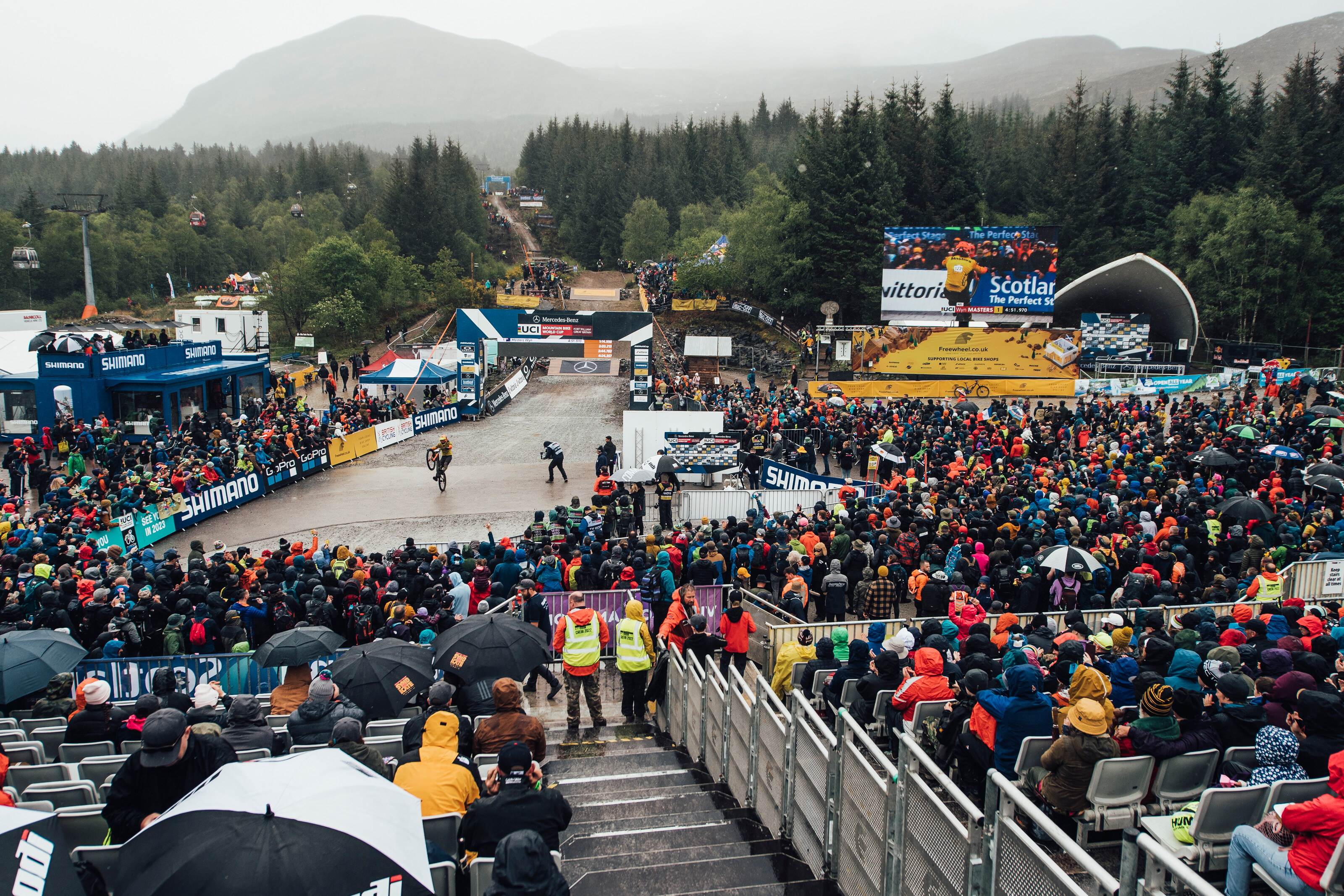 Conditions in Fort William on race day were ‘typically Scottish’ with rain showers throughout the day and midges biting, but after a near three year break from World Cup DH racing that wasn’t enough to keep the crowds away.