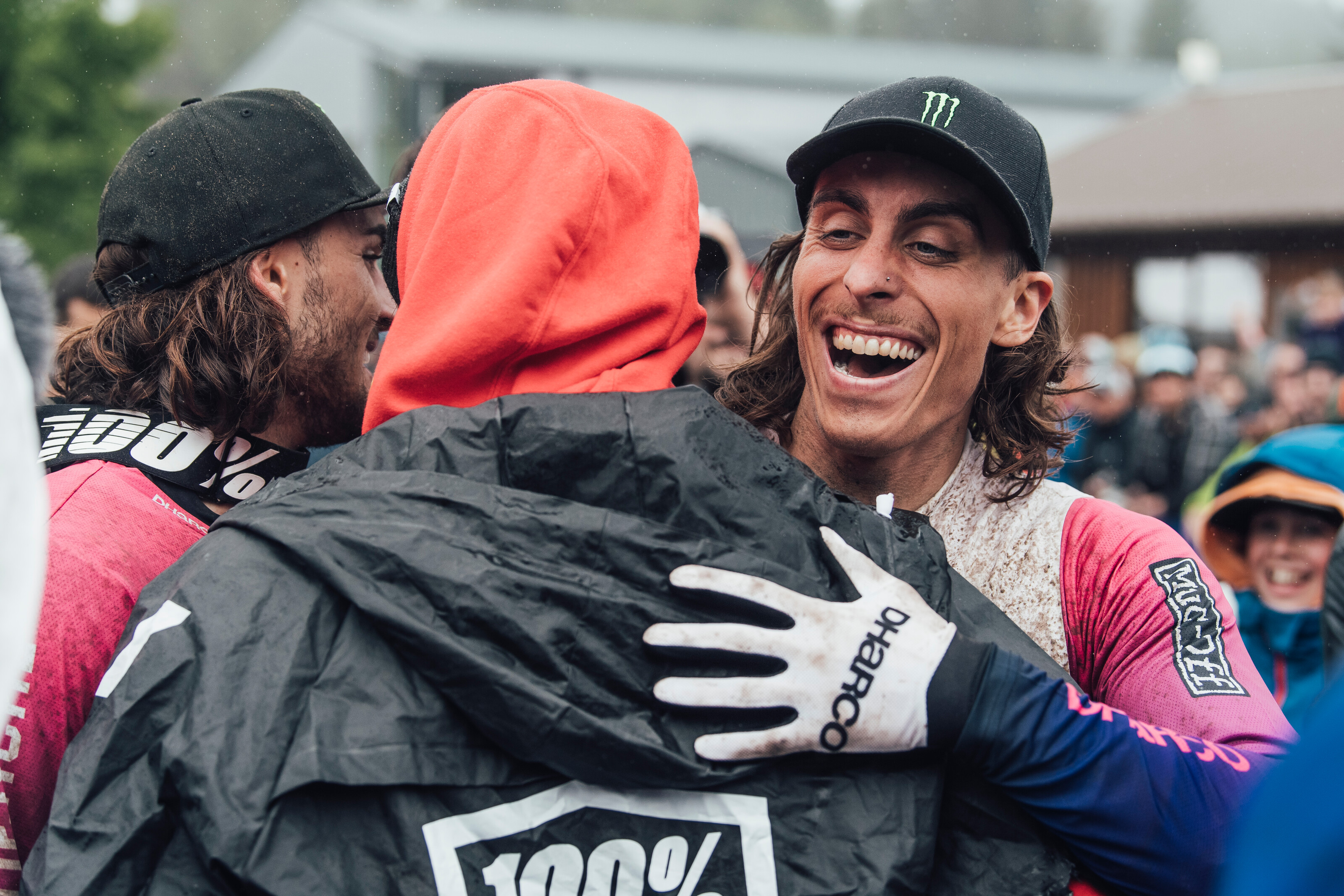 By the time eighth fastest qualifier Benoit Coulanges was on track the weather had changed: it was noticeably windier and was raining again. 2.7 seconds back at first split, 3.8 seconds further down the track the Frenchman was saving himself for the bottom section and as he crossed the line, he’d narrowed the gap to 0.4. The wind had definitely got up as the winner of the National race and probably the best rider of the top section on the planet, Danny Hart, was three seconds back at split 1. He couldn’t pull it back crossing the line 3.9 seconds in the red and finishing eighth. Loris Vergier was super smooth but lost his chain and ended up sixth. Bernard Kerr also had transmission issues – 16th. Which left four riders…