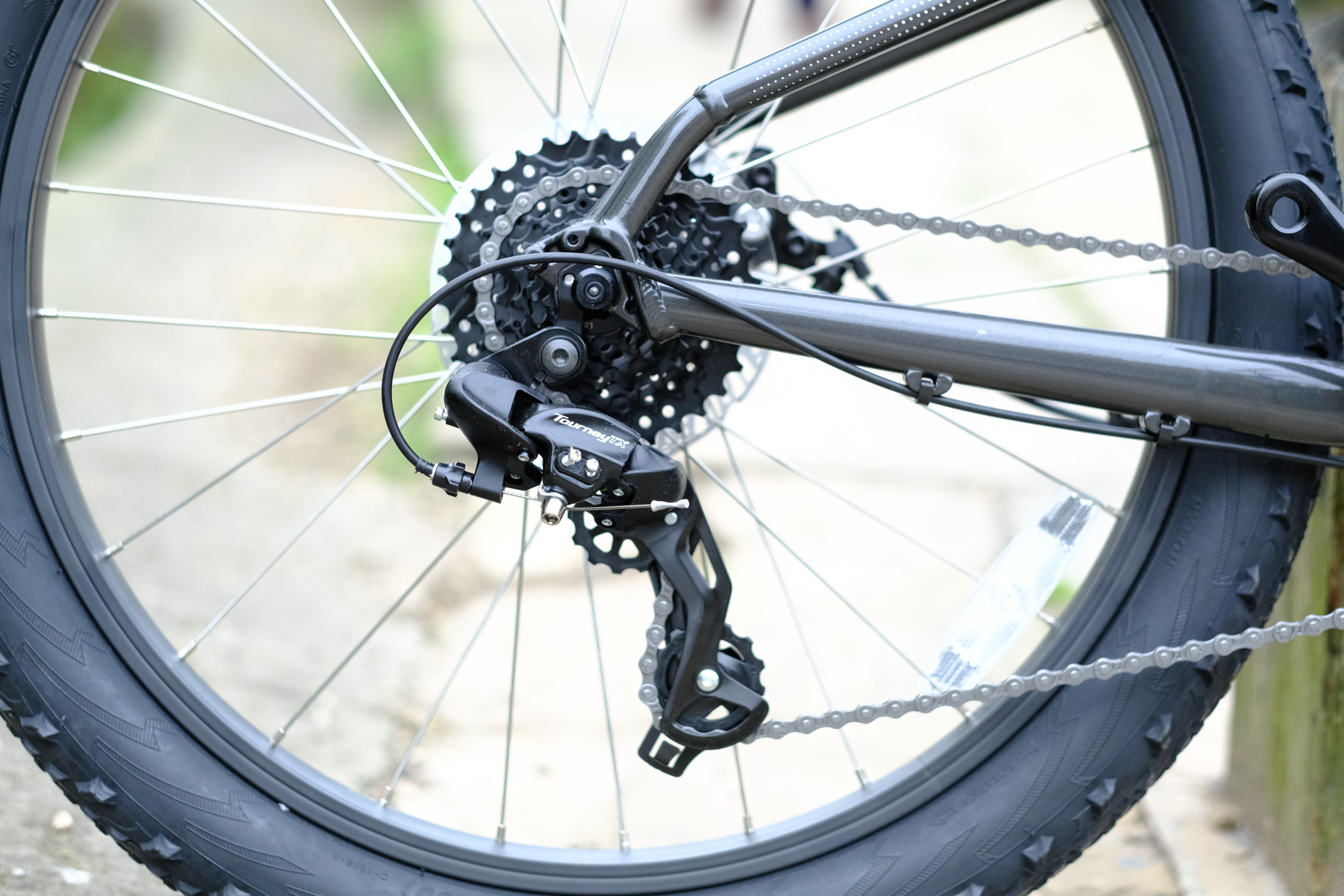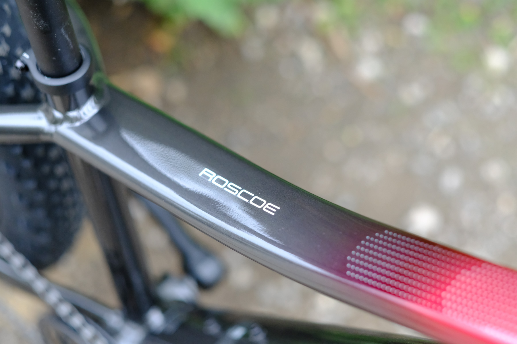 2.8in fat tyres, a 1x drivetrain and a wide-range cassette, sloping top tube, rear brake calliper is tucked into the frame to help prevent damage from laying* the bike down.