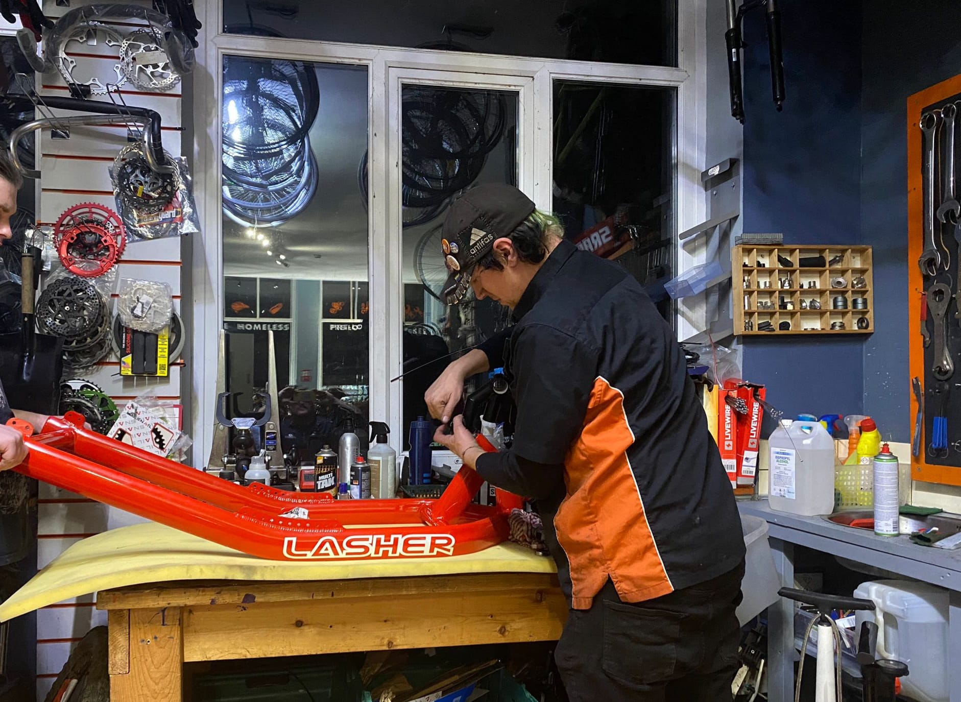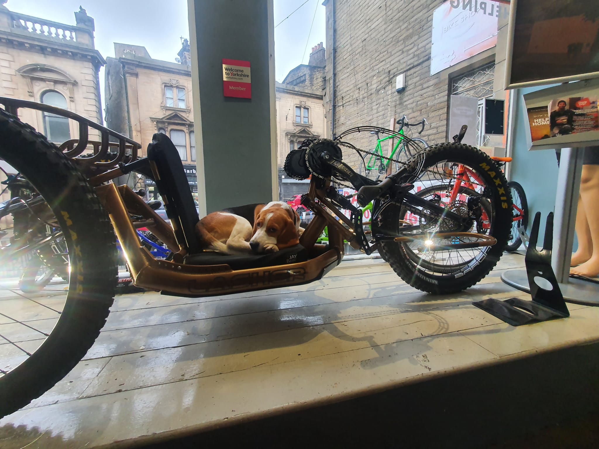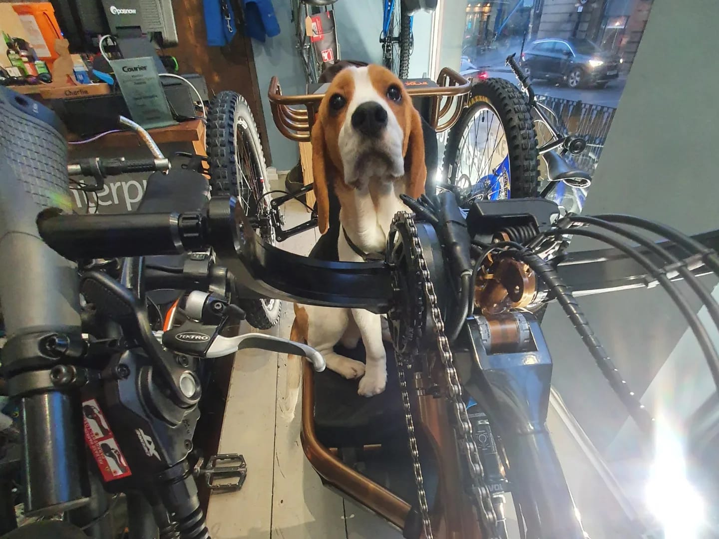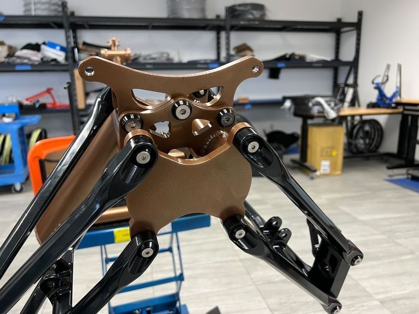 The linkage at the back of the bike was a sight to behold as well, an absolute feat of engineering prowess. From the shop suspension squash test (which we probably spent far too long doing but it’s mesmerising to watch the linkage at work) It certainly looks like it’s gonna do the trick and teamed with the enormous tyres it should have grip for days.