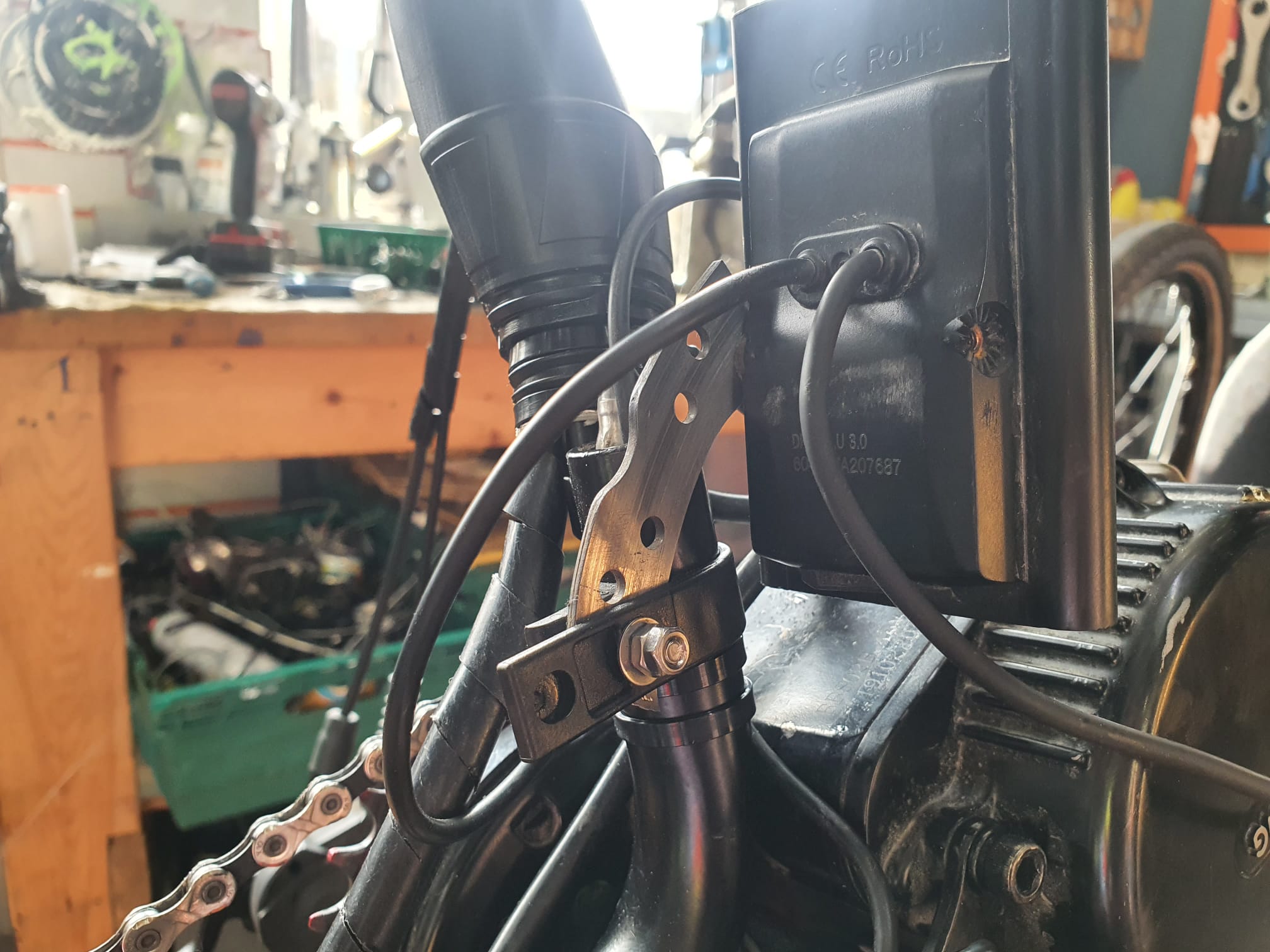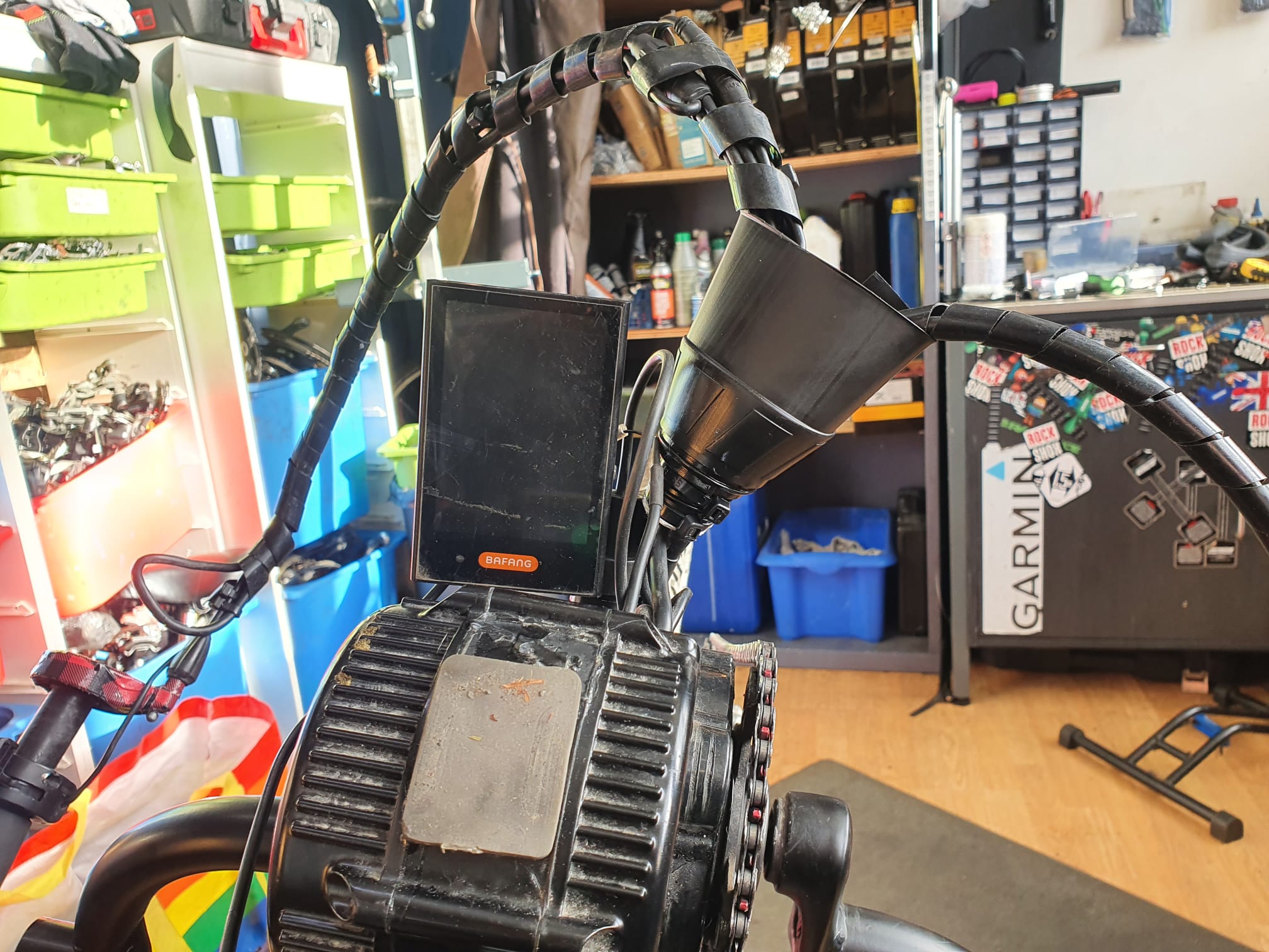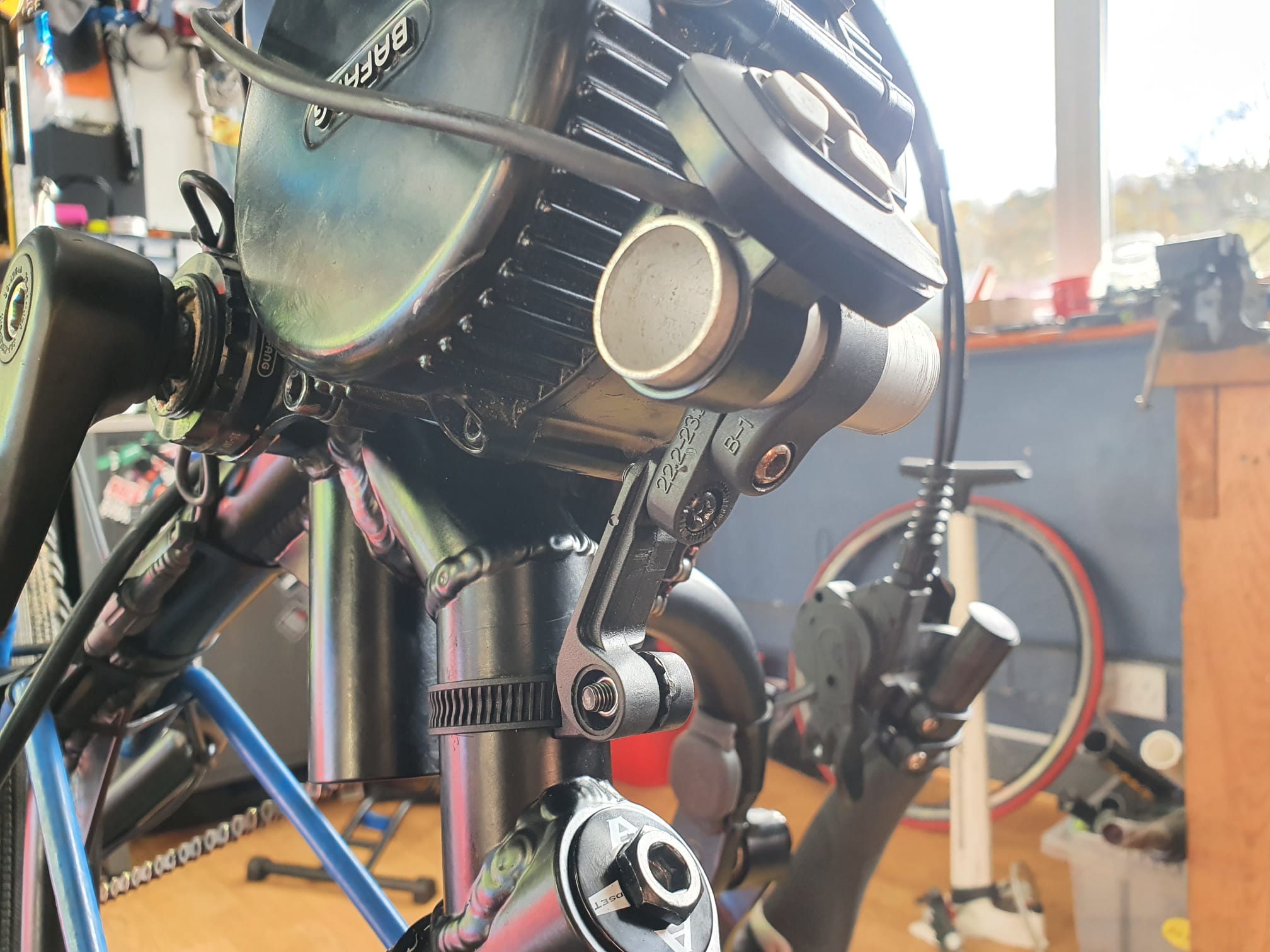 Final hack for this one was to mount the display for the motor. For this, once again I called on the reflector mount box, but nothing in there quite did the trick, I did however have a slice of an old disc brake rotor that I’d been using for another hack that in combination with a piece out of the reflector box made an ideal mount for the display.