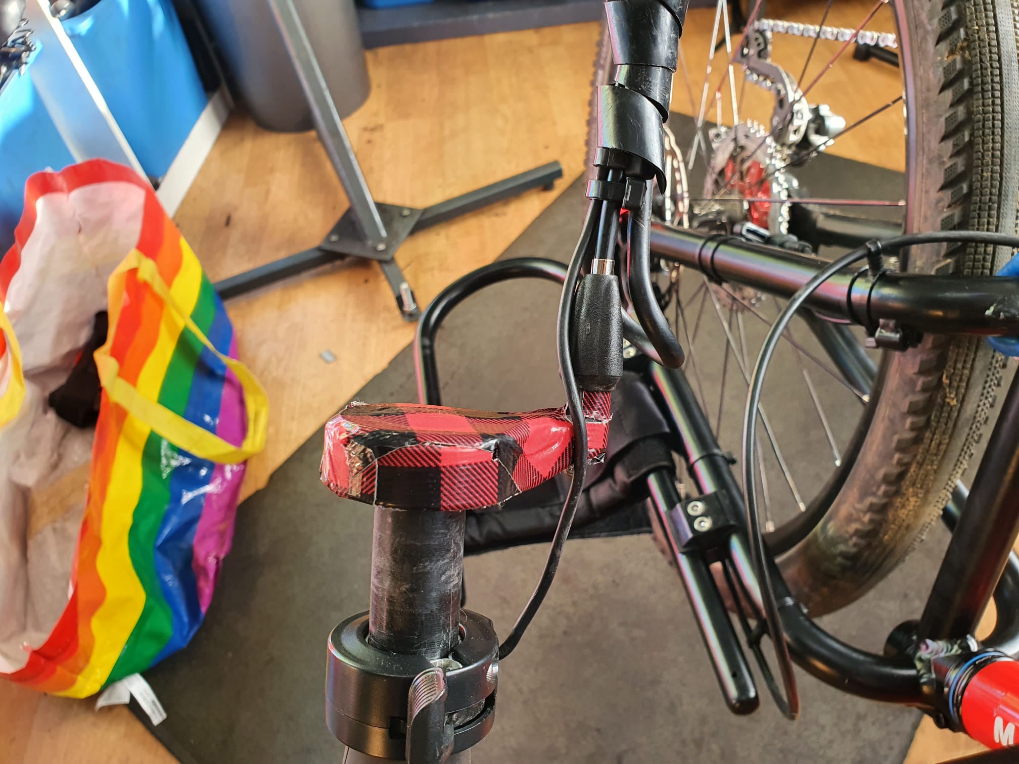 However on the left hand side was the throttle lever for the electric motor and its floppy electrical cable was going to need a little extra support to make sure it stayed tangle free. An old grip shift shifter housing, tastefully decorated in a fetching tartan duct tape (to give Neil a taste of home wherever he goes) fitted with a length of gear cable and outer made a fitting support and added a little more protection to the delicate throttle cable again wrapped in that horrible computer cable management coil stuff… I’ll talk about my better solution to this on Neil’s next bike in a minute!