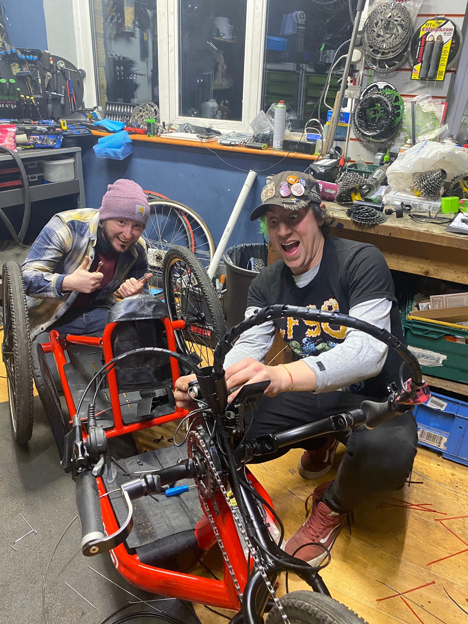 Now I have to admit I had a certain amount of trepidation going into the build, I’ve built loads of weird bikes before but never a handcycle. And after a night spent looking for any kind of instructions online proved fruitless I eventually resolved that I’d have to trust my instincts and just get on with it. Looking at the array of parts spread across the workshop floor it was difficult to visualise how it all wedged together in the shape of a bike!