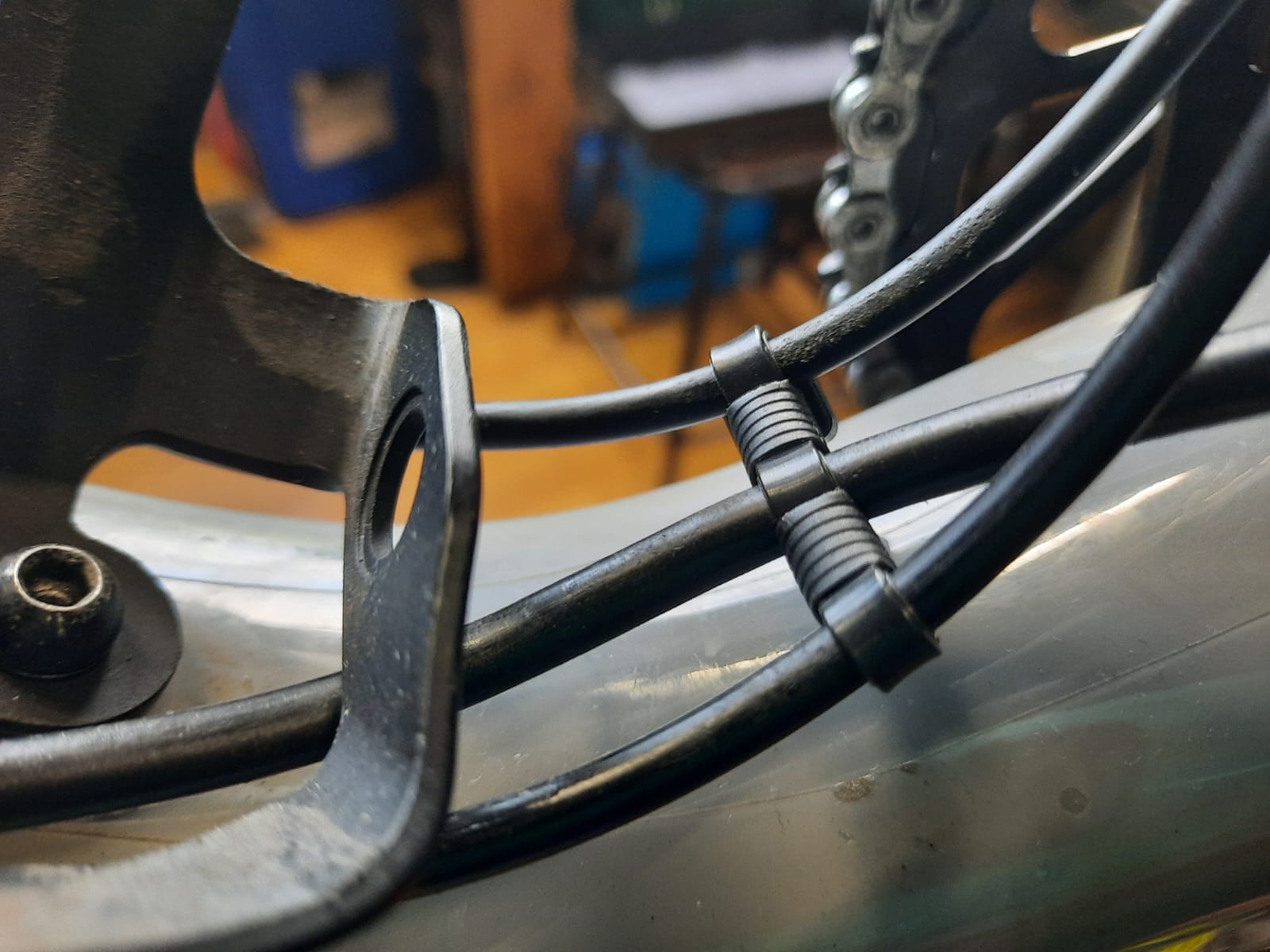 Rather than using that weird plastic coil cable tidy stuff for computers (it must have a better name than that!) I used my patented old cable end cable guides. Made from gear cable end caps trimmed down with a cable tie fed through, these keep the cables tied neatly and keep them positioned so they’ll make nice smooth circles when pedalling but they also allow access to each cable individually without having to unwrap that coily cable stuff. These cable guides also work great on bikes where you want to run more than one cable along one guide like on this E-converted tandem I worked on a few weeks ago.