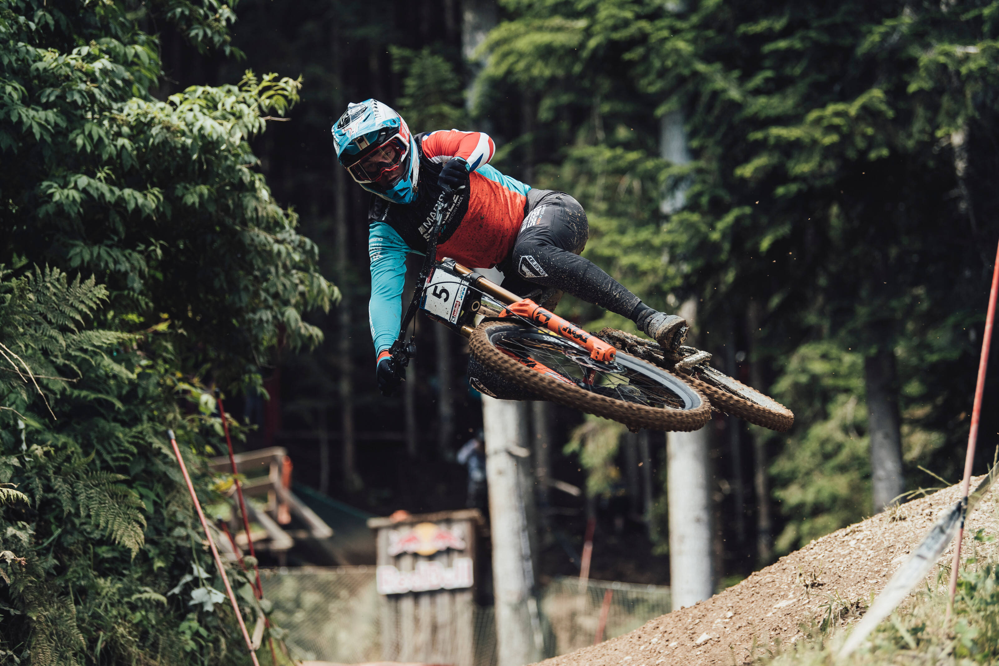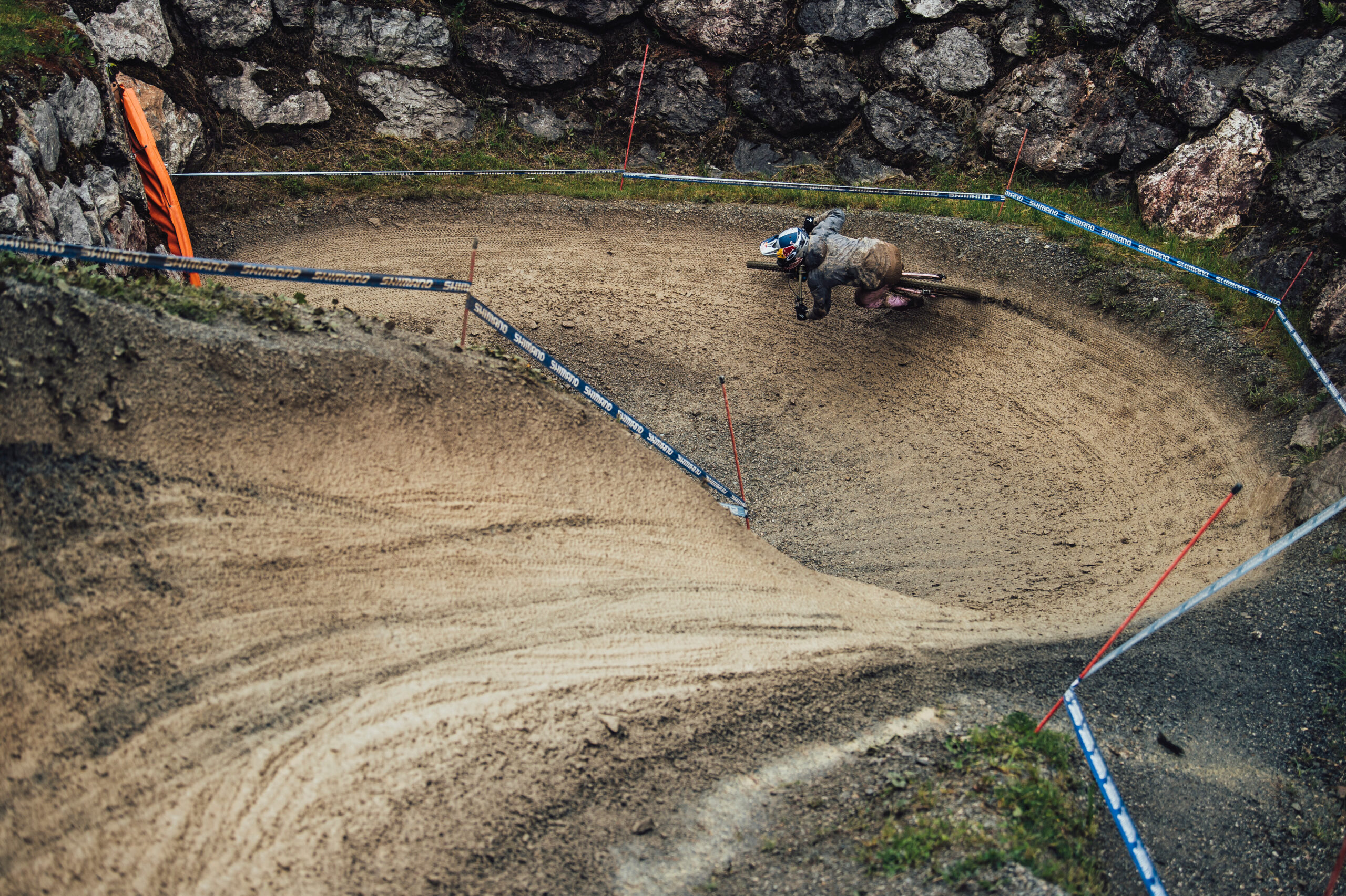 First it was Loris Vergier, bravely dressed in all white who went green by just over a second and a half. Vergier knew his time wouldn’t hold though but was happy to post a time. Riders fighting for the overall knew very well that this wasn’t where it would be won but where it could be lost. World Champion Greg Minnaar was pushing so hard he jumped out of the motorway onto the wooden wall ride with too much speed and somehow exited too soon crossing through the tape on the opposite side.Â