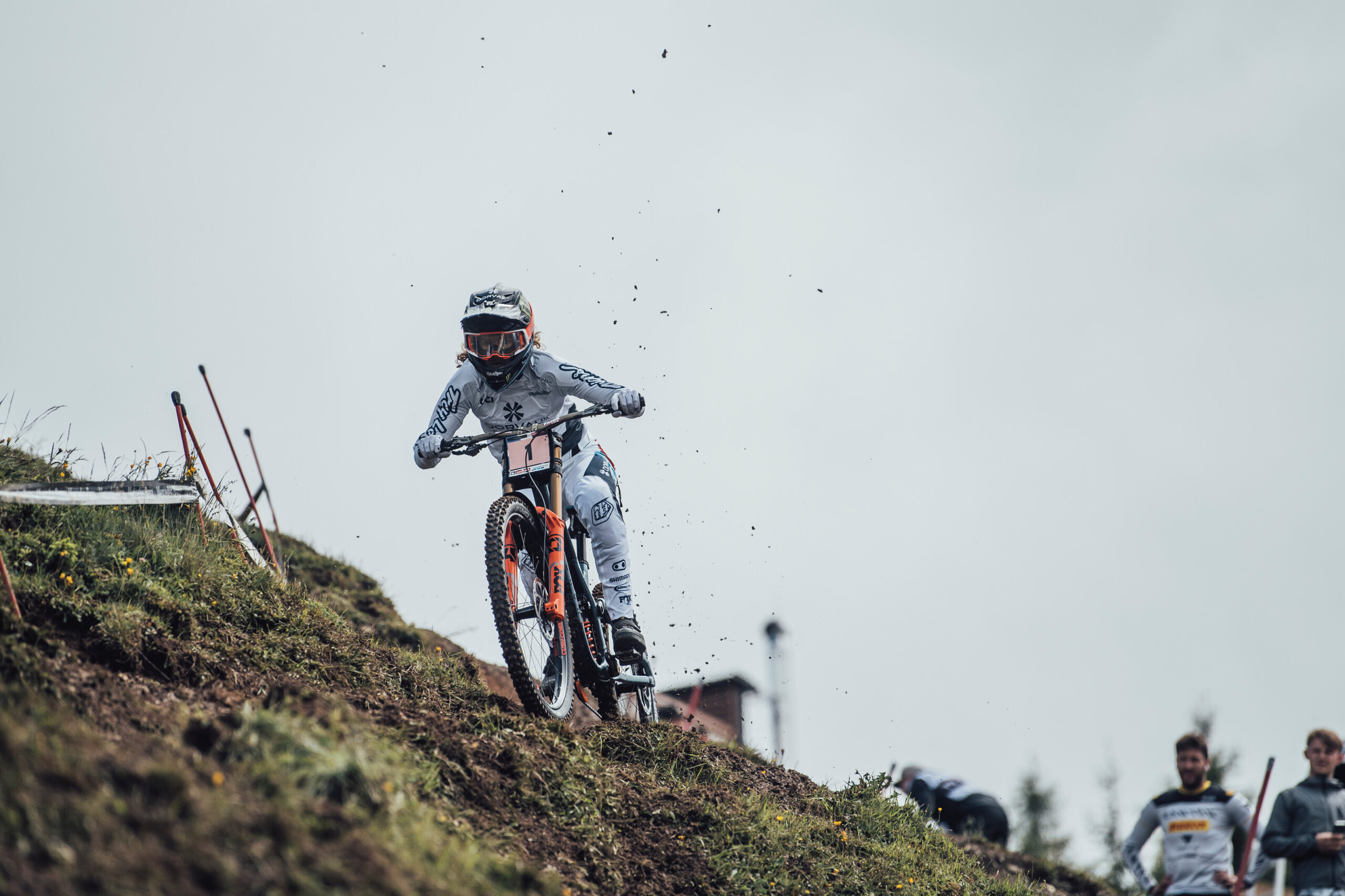 Hoell still searching for her first elite win on home soil was the only woman hitting the two big wooden kickers on the motorway before race day but in her race run she didn’t make it that far without incident, also crashing in the stumps. Hoell had been pushing so hard though that despite the crash she was only half a second back at split two but it all went wrong in the woods with an over the bars costing her 12 seconds. Balanche, unbeaten on this new track in Leogang after being crowned World Champion in 2020 and winning in 2021, hadn’t hit the big Red Bull Gap before race day but thought she would have to if she wanted to claim the threepeat. The Swiss woman put a faultless run together though, fastest in every sector, taking the win by over 11 seconds and could’ve easily gone around the jump and still won by six seconds.