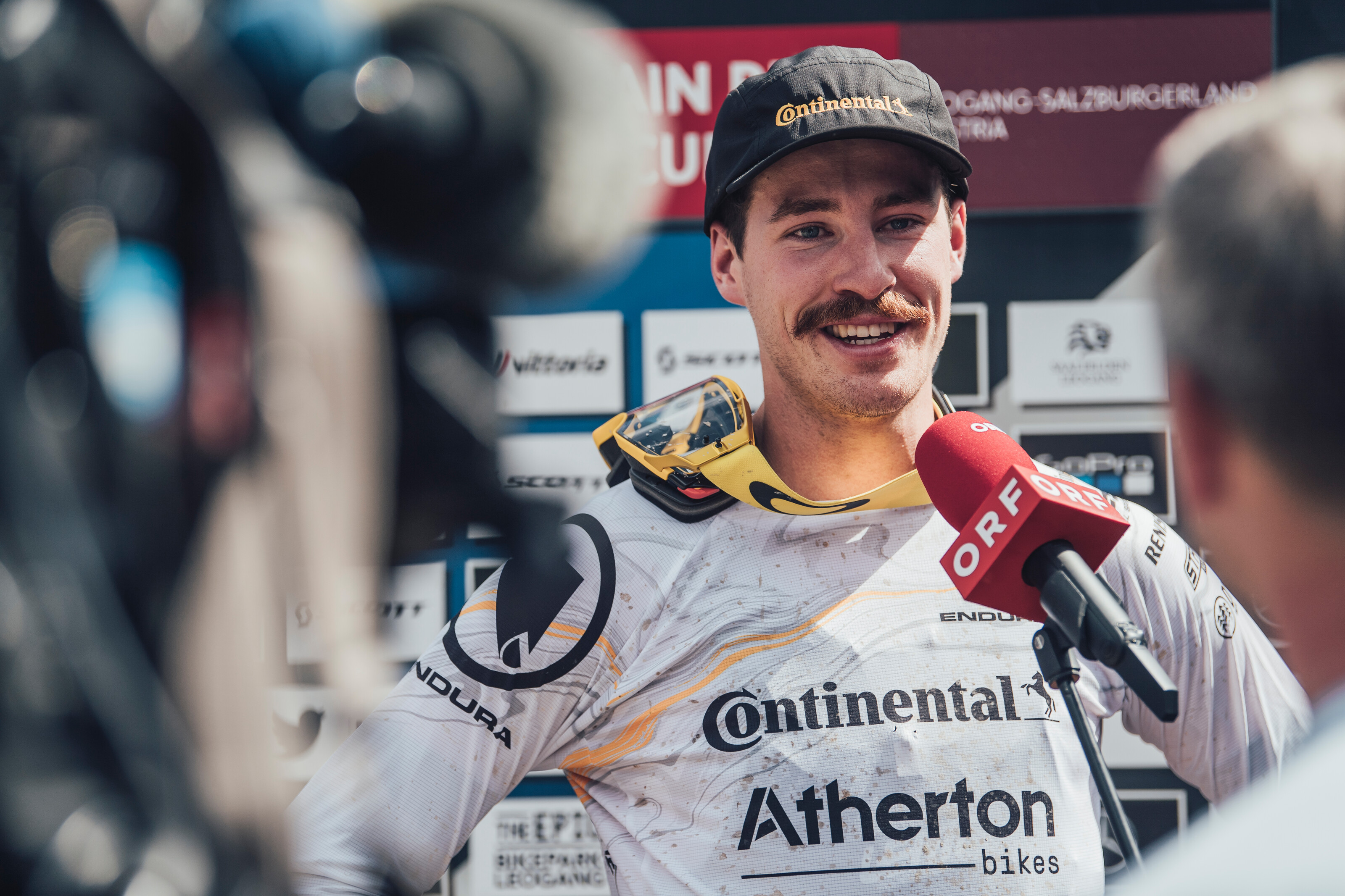 Into the final five… Laurie Greenland was somehow three seconds up at the first split but looped out manualing some uphill rollers. Danny Hart (also on the latest episode of the podcast) put together a classic run, the likes of which we haven’t seen from him for a good few years. Famous for his ability in steep muddy conditions after winning the 2011 World Championships in Champery by 11 seconds, Hart went into the lead by 1.2. He was delighted and rightly so – it looked like it might be the winning run. Next in the start gate though was his countryman and former teammate, Matt Walker. Walker was the most aggressive I’ve ever seen him ride, bullying the bike through sections and swapping the lead with Hart all the way down the track. He nearly lost the back end as he entered the woods but that just seemed to make him go harder still and he went into the lead by 0.3. Incredible racing!