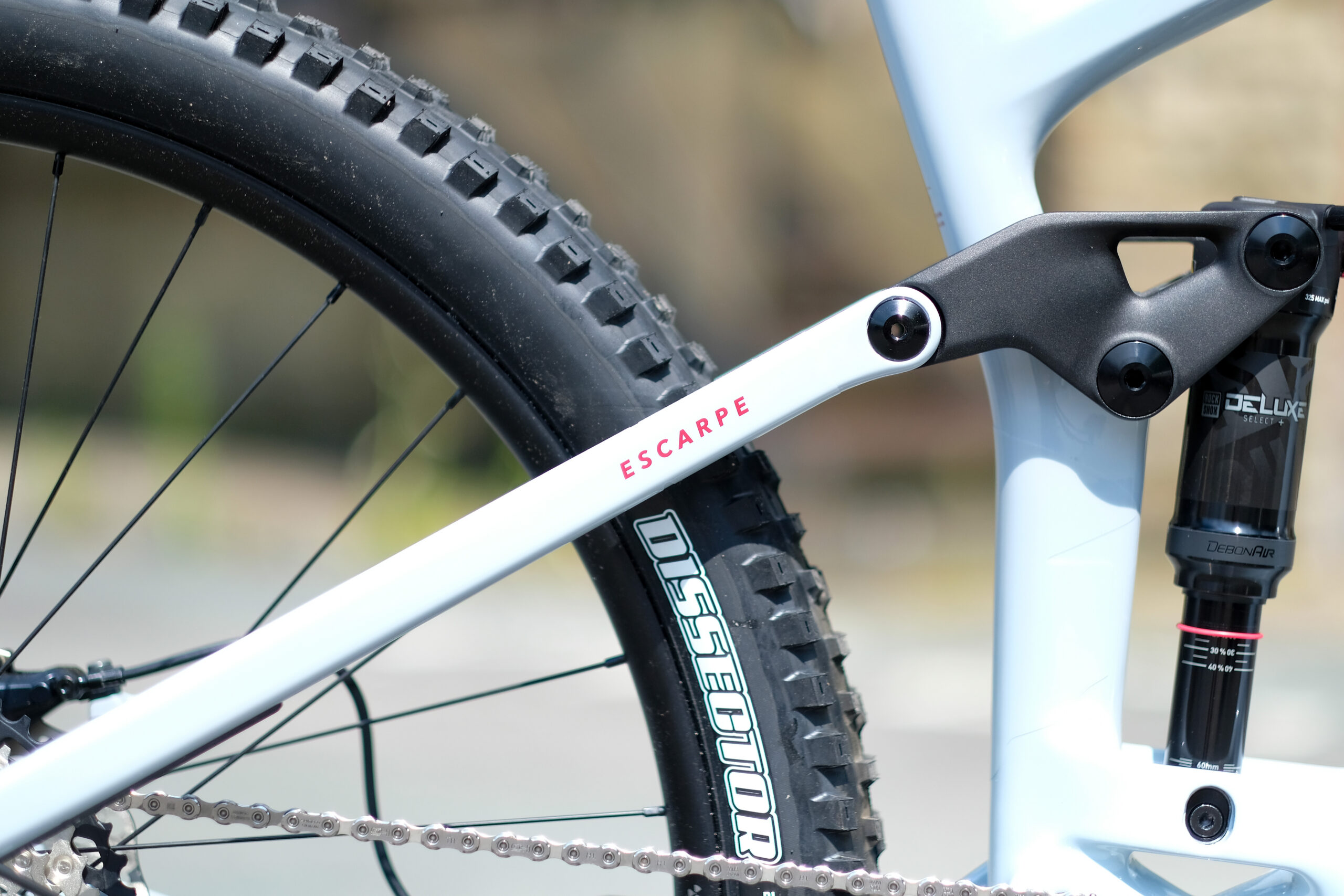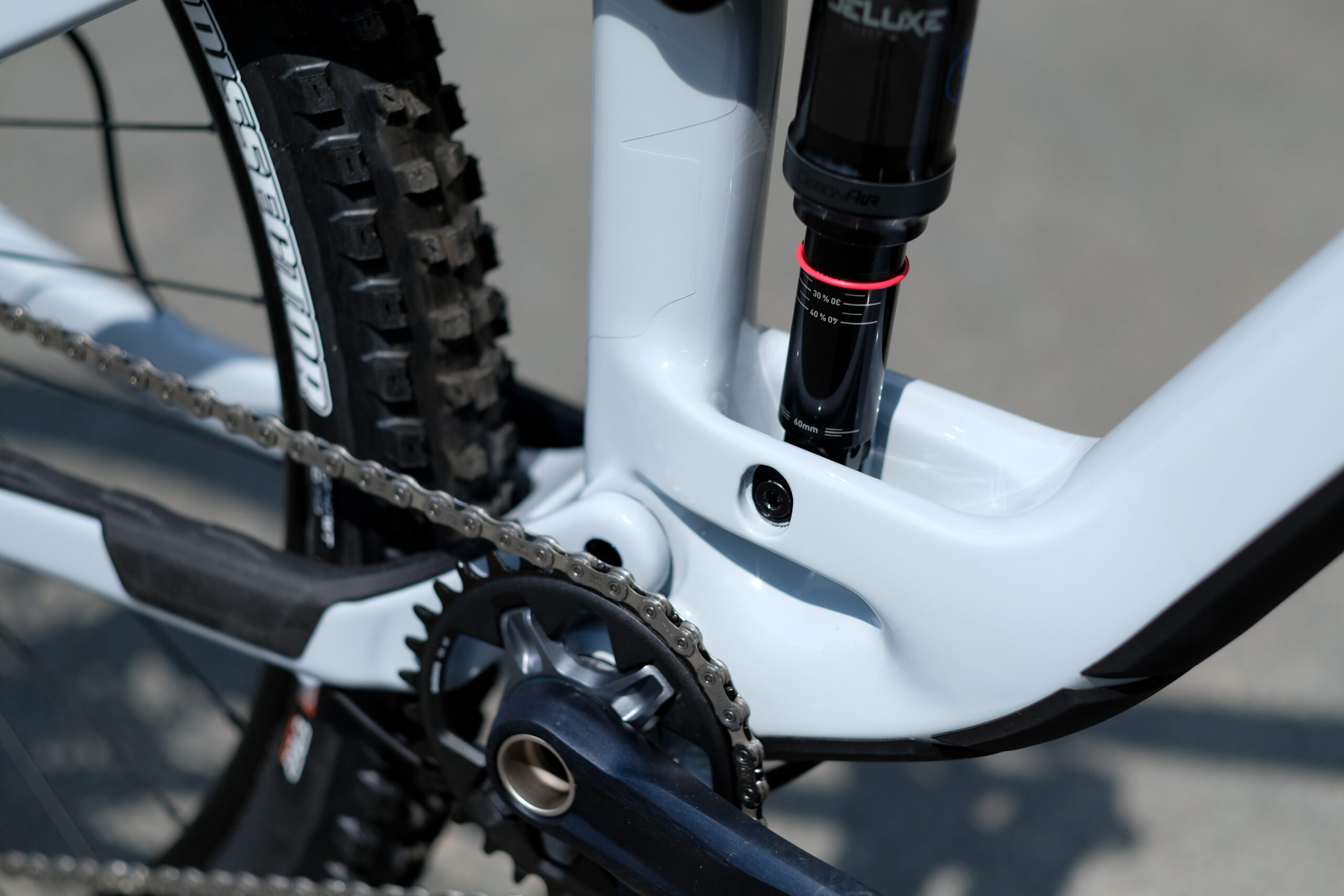 A very mountain bike [sic} to kick things off. 140mm rear travel. 150mm fork. 29in wheels front and back. Full T800 carbon front and rear triangles. Flippy-chippy. RockShox Lyrik Select fork, Deluxe Select+ RT shock, Shimano SLX 12 speed drivetrain and disc brakes, Nukeproof Neutron V2 wheelset with tape applied, Maxxis Assegai and Dissector tyres.