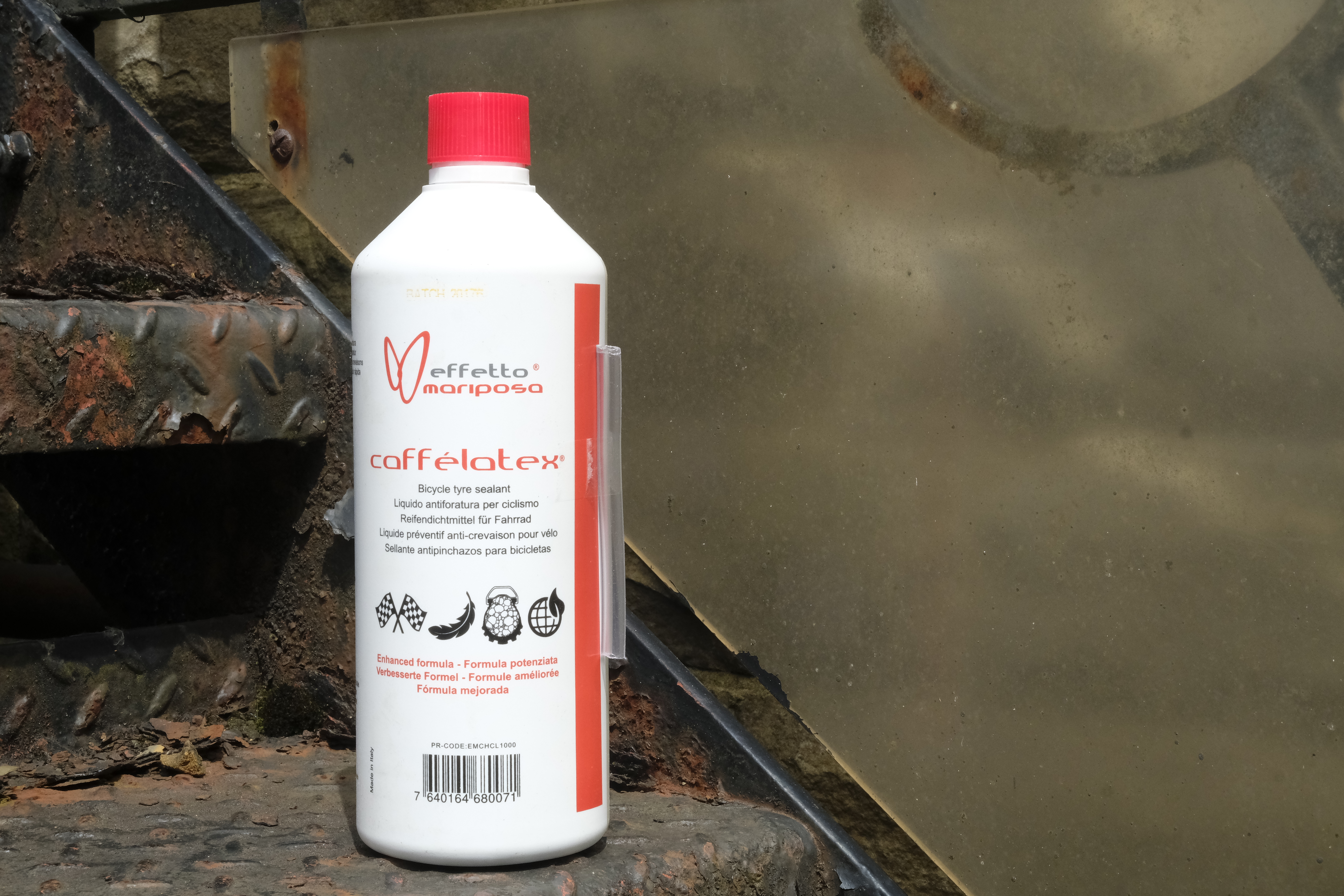 Enough sealant to ten to twenty tyres, depending on your wheel size. This contains micro particles rather than macro particles – the difference being they’re apparently smaller (macro ones are glitter sized) so won’t clog your valves. Spinning your wheels causes this sealant to foam, meaning it should do a better job of sealing side walls punctures than non foaming stuff that gets held against your tyres by centrifugal forces. Which has us wondering how long it will be before there are clear sidewalled tyres so we can see the fun going down.