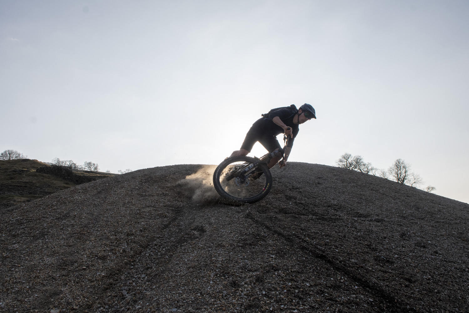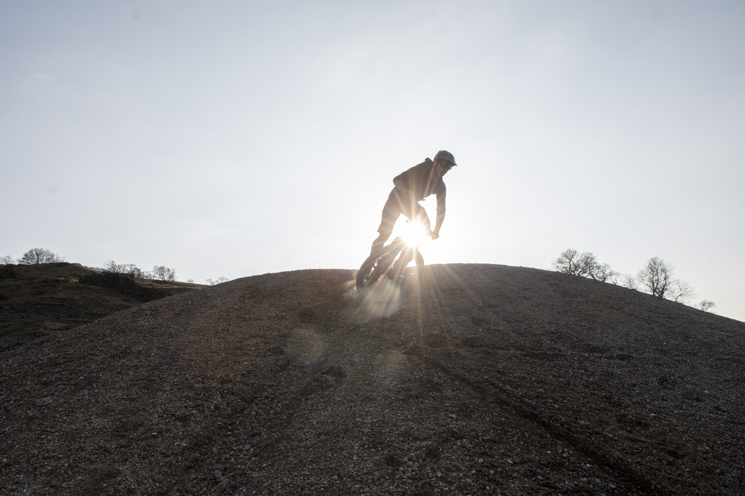 After our repast, Rick had reacquired his extensive vocabulary and so it was time to continue. We rode up through a caravan park and up a long climb, eventually arriving at the old Providence lead mine workings. The bridlepath grinds up and through them, but there are plenty of alternative routes to spice things up so we stopped for a play. Given that the predominant mood of the rest of the ride is one of relaxed view-appreciation, this section is comfortably the most potentially technical aspect of the route – and as the sun was just so, and we had a little time, I exhorted Adam and Rick to style it up for some photos.